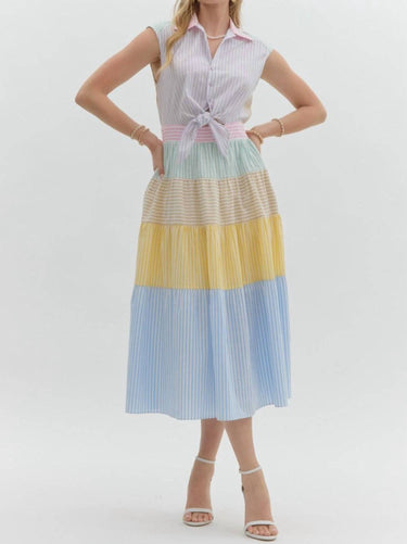 Introducing the Striped Midi Dress by Entro, a summer-ready essential perfect for holiday parties and workwear alike. This sleeveless, A-line midi dress features a classic collar design and is made from a comfortable 75% Cotton, 25% Polyester in a striking blue multi-stripe pattern. Equipped with handy pockets and a convenient pull-on closure, it promises both style and functionality. Care instructions include machine wash and line dry to maintain its pristine condition. Bust measurements: small 36", medium 38", large 40". Length for all sizes: 50". Dena wears a size large with a bust size of 40D, standing at 5'7" tall.