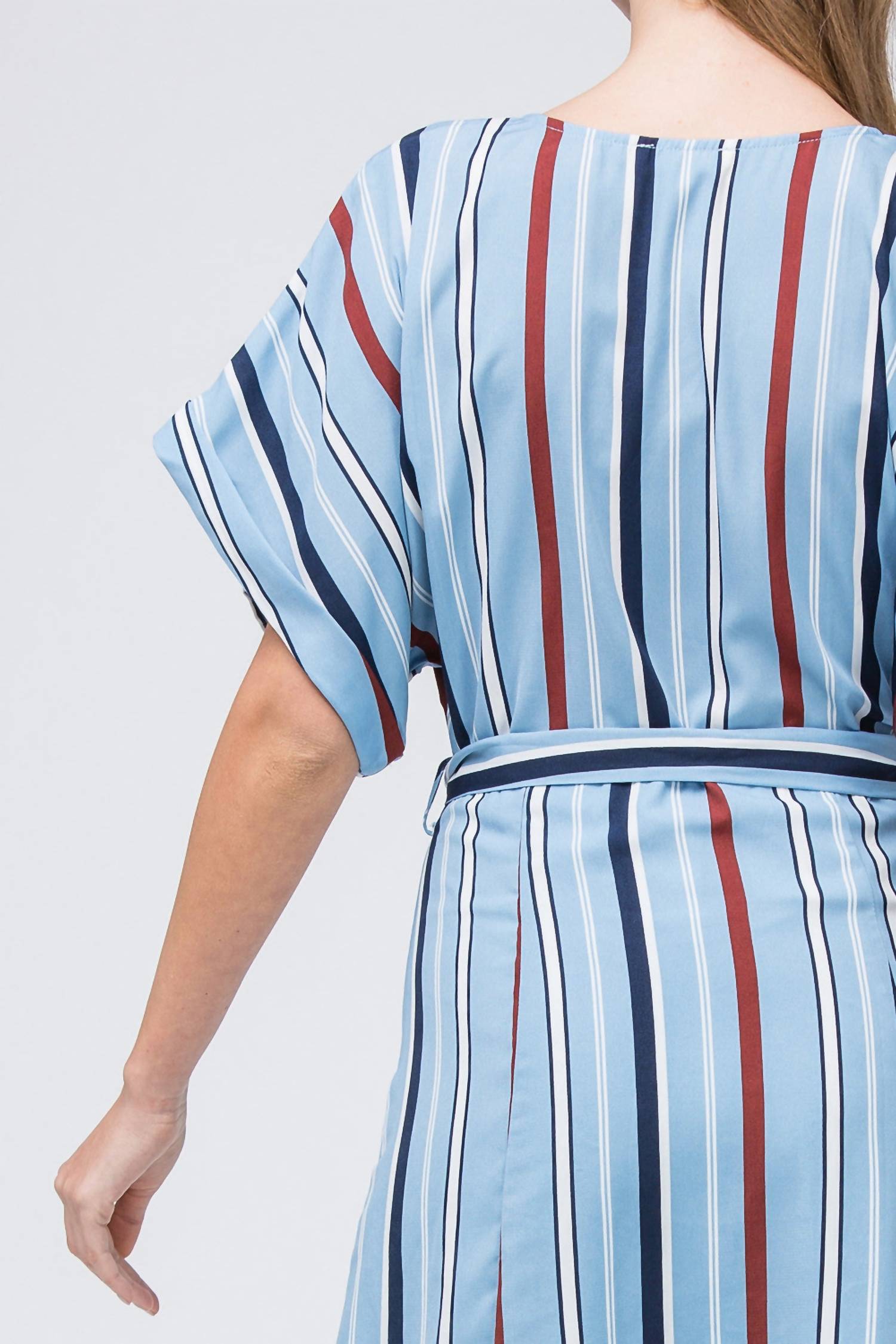 The perfect mini dress for those warmer months. The Striped Shirtdress by Entro is your new favorite transition piece, effortlessly taking you from power hour to happy hour. This women's mini sheath dress boasts a V-neckline and short dolman elbow sleeves. Crafted from 100% polyester, it features a lightweight and lined finish with a self-tie detail at the waist. With a button closure, it is available in a chic blue stripe. Hand wash cold or opt for dry cleaning to maintain its look. Sizes range from Small with a bust of 34" and a length of 34" to Large with a bust of 38". Model height is 5'9" and is wearing size Small.