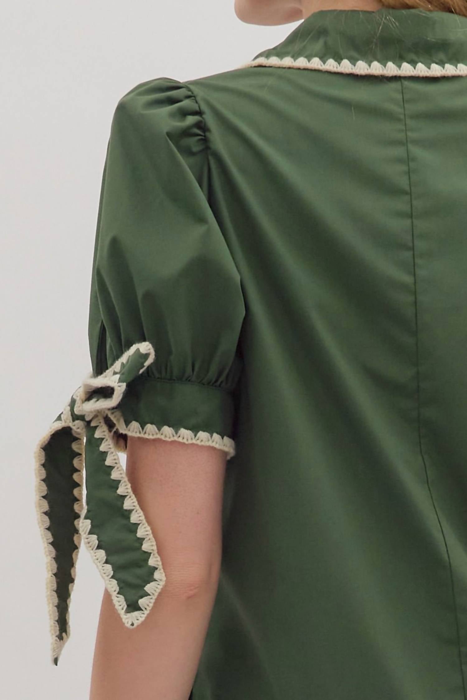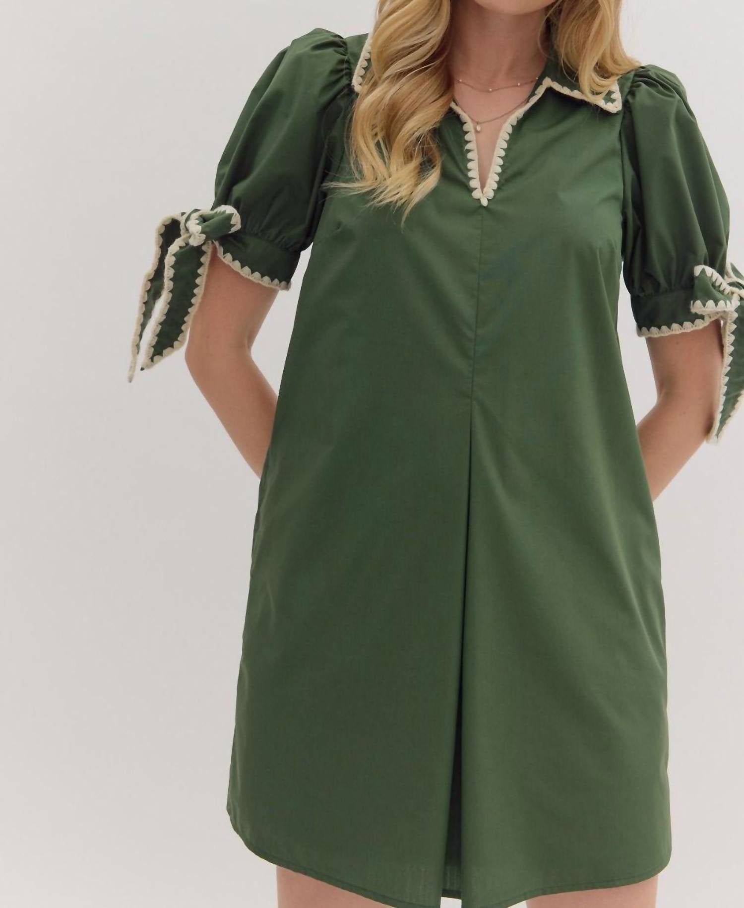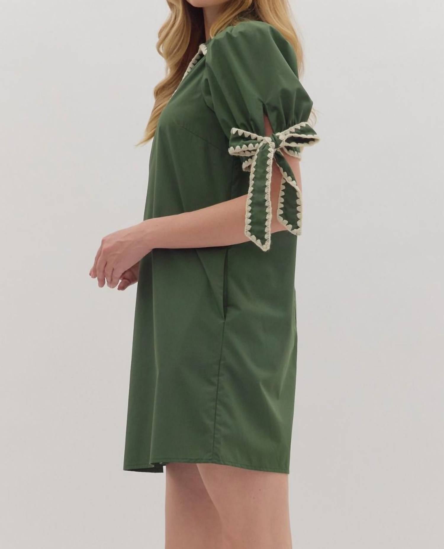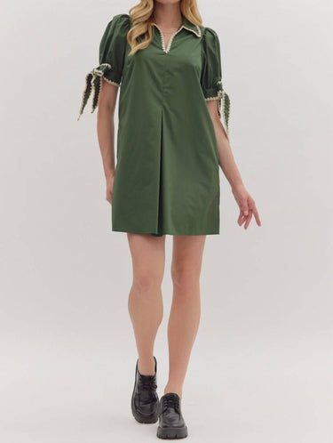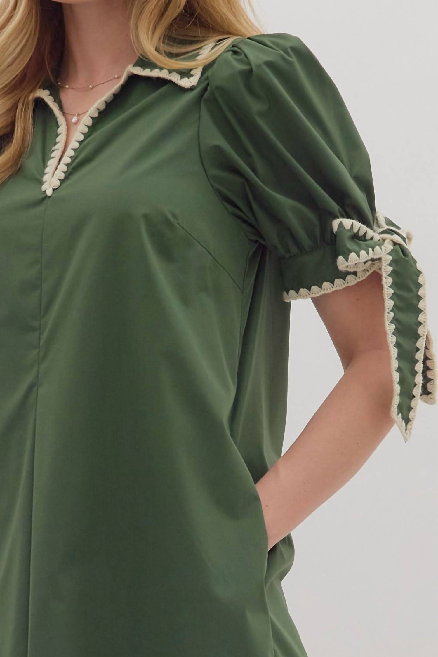 The kind of easy and flattering dress you'll be reaching for all season long. Embrace elegance with the Subtle Details Bow Sleeve Dress by Entro, crafted in a chic army green. This mini A-line dress features short puff sleeves with tie cuffs and a stylish V-neckline enhanced by contrast scallop binding details. With convenient side pockets, it offers both fashion and function, all in a solid pattern made from 80% Polyester and 20% Cotton. The dress is a comfortable pull-on style, perfect for spring travels, and requires machine washing with a line dry for care.