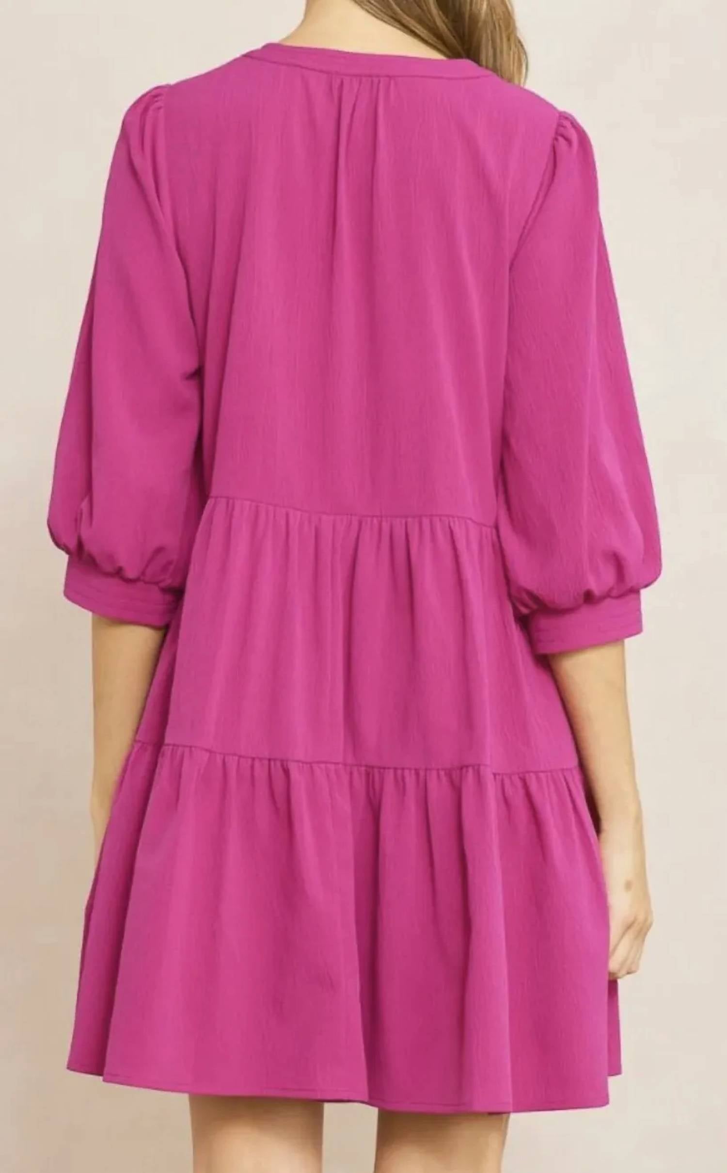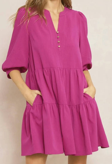 Discover the Entro Tiered Button Dress in a vibrant magenta hue, perfect for summer vacations. Featuring three-quarter sleeves and a V-neckline, this stylish mini dress offers a flattering shift silhouette with pull-on closure. The solid pattern and side pockets add to its minimalist charm. The dress is lined for comfort and care instructions recommend hand washing.
