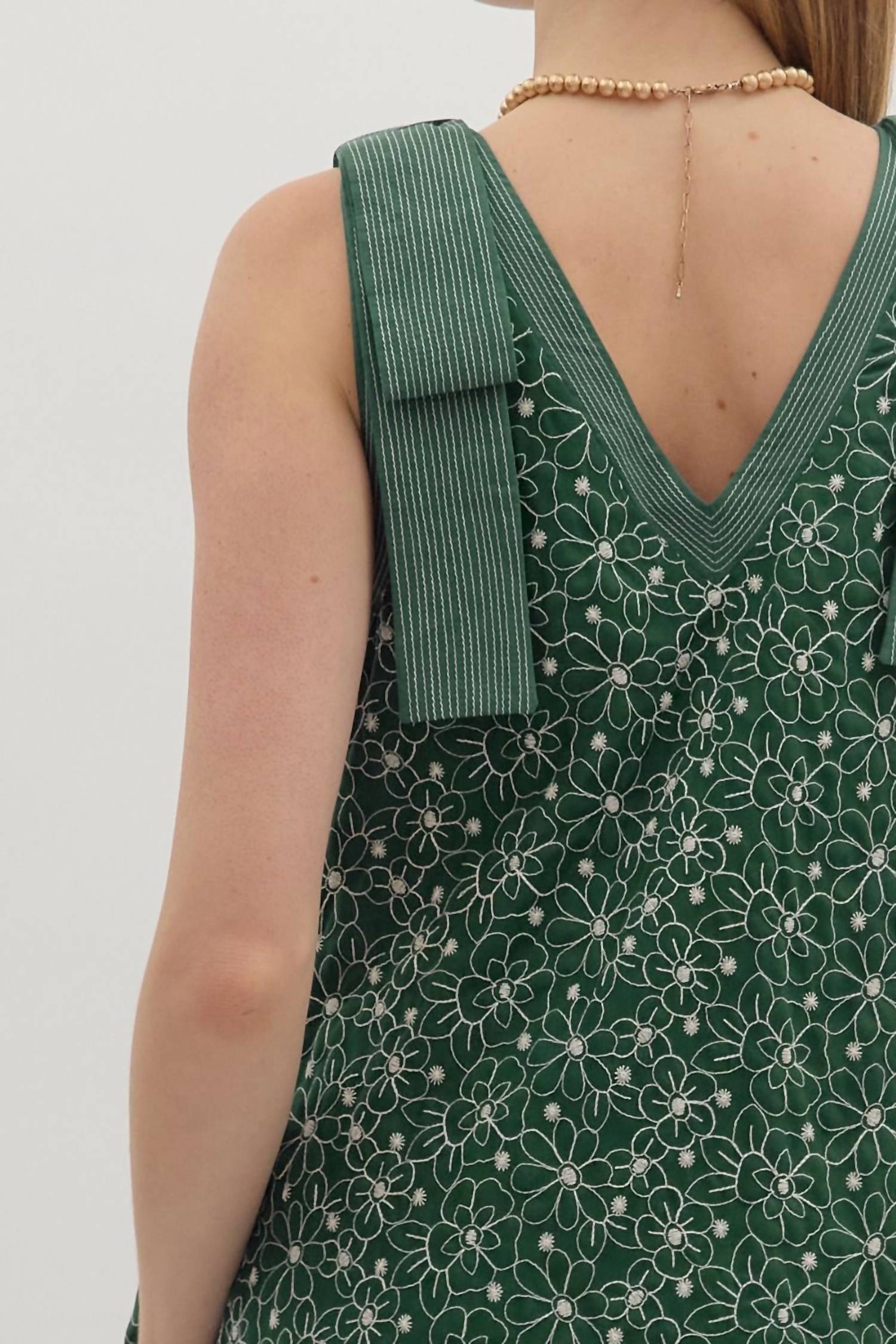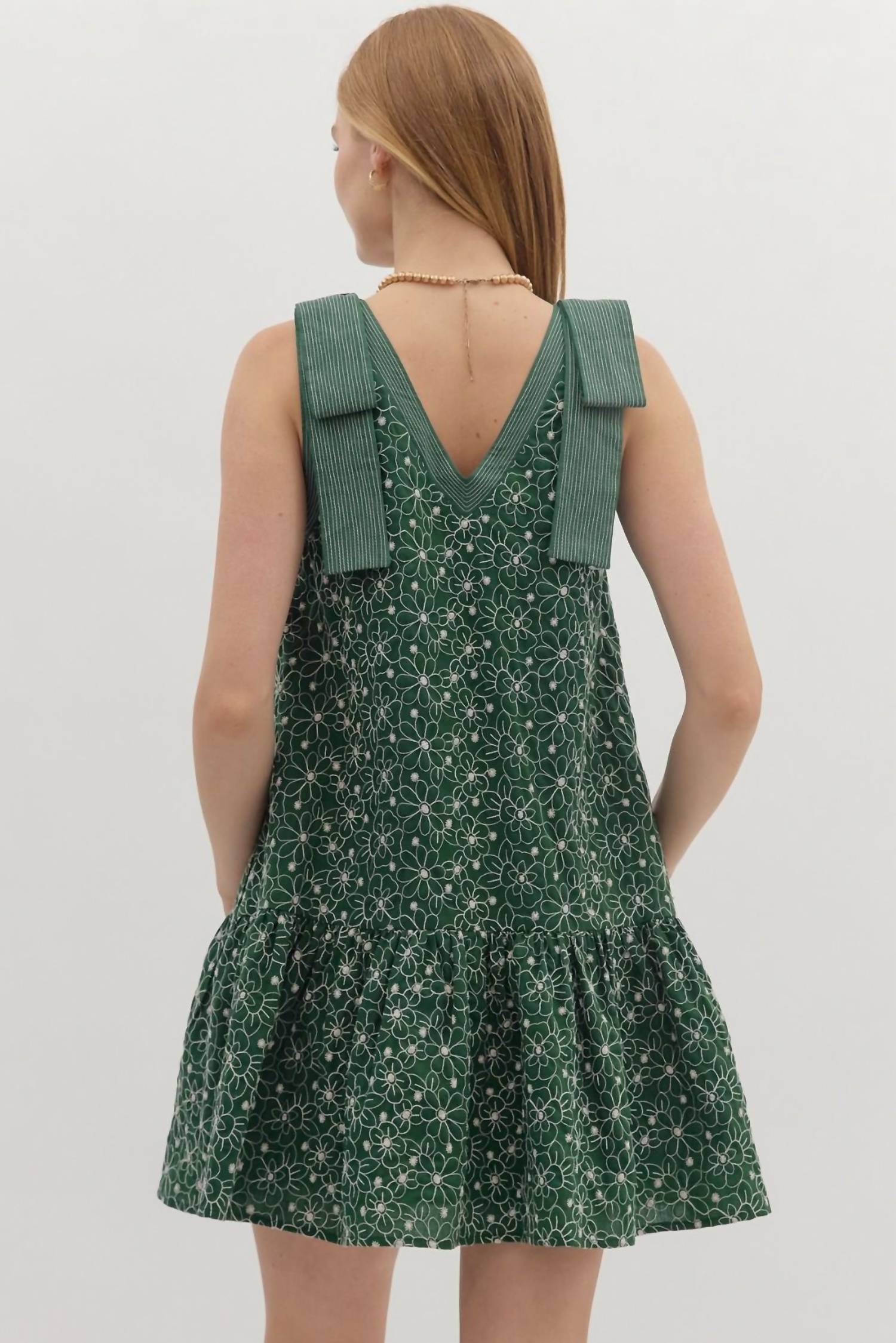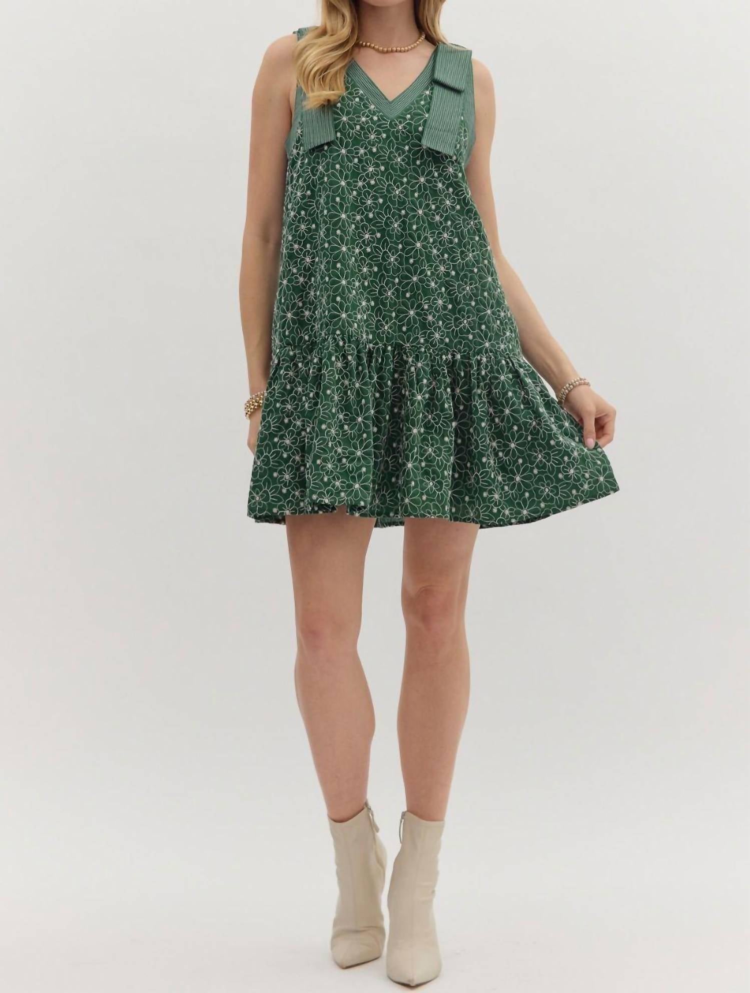 Comfortable and cute, this casual day dress has it all. Meet the Timeless and True Floral Dress by Entro, an enchanting sleeveless mini dress in hunter green perfect for summer birthdays. Crafted from 70% polyester and 30% cotton, it showcases beautiful floral embroidery and exposed stitch detailing, enhanced with charming shoulder bows. Its A-line silhouette features a ruffle hem and practical side pockets, while a pull-on closure ensures ease of wear. Care for this lined dress by machine washing for lasting appeal.