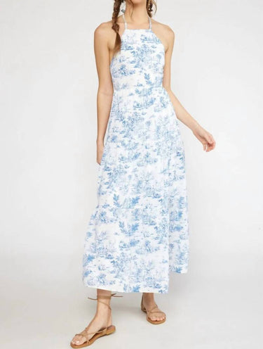 Introducing the Blue/White Toile Print Tie Back Midi Dress by Entro, a stunning piece for your summer vacation wardrobe. This sleeveless maxi dress features a boho chic halter neckline with a tie closure, offering a fit and flare silhouette highlighted by its beautiful antique print. Crafted from 100% polyester, the dress is lined for comfort and includes convenient side pockets. Simply machine wash to maintain its lightweight, non-sheer woven fabric, and enjoy its effortlessly elegant style. Garment length: 50 inches.