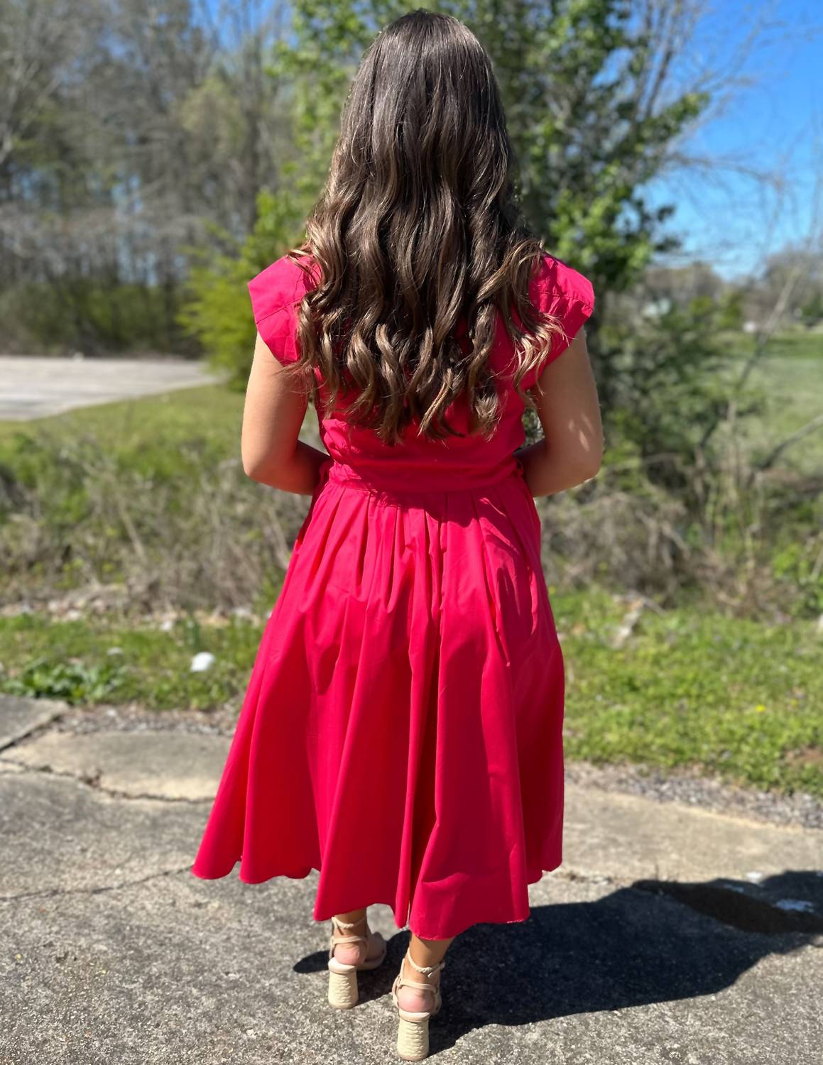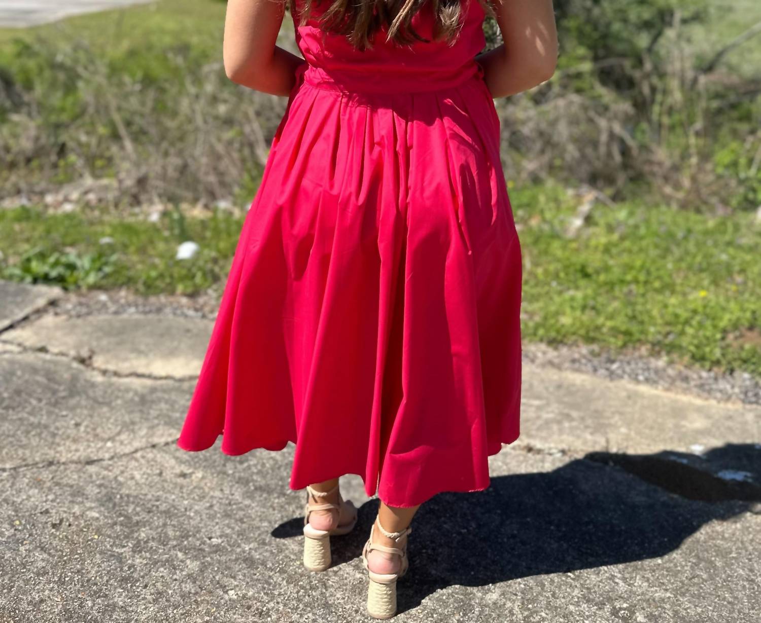 The Tongue Tied Cap Sleeve Midi Dress by Entro is an effortlessly chic choice for your wardrobe in a striking red tone. Featuring cap sleeves and a flattering A-line silhouette, this dress is crafted from a blend of 80% polyester and 20% cotton, ensuring a lightweight and non-sheer finish. Its button closure and self-tie detail at the front add a touch of elegance, while side pockets provide functionality. Perfect for various occasions, this dress is modeled by a 5'10" adult female wearing size small.