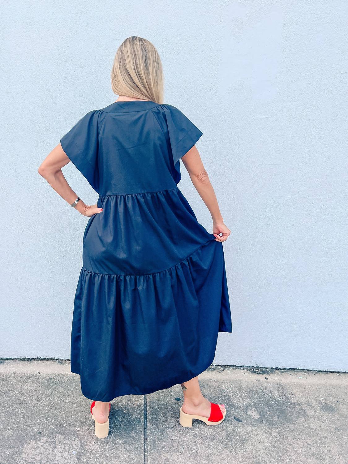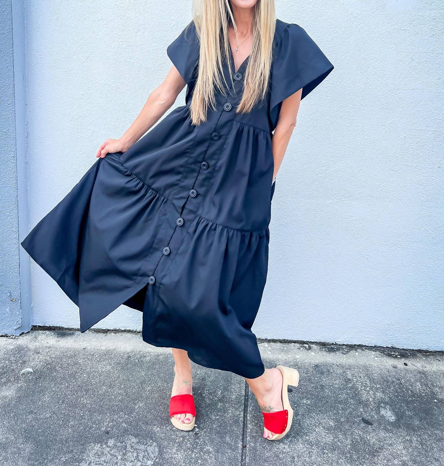 Introducing the Twirl-Worthy Flutter Sleeve Tiered Midi Dress from Entro in timeless black. Designed with short flutter sleeves, this dress combines 80% polyester and 20% cotton for a light and breezy feel. The tiered midi length and A-line silhouette with a V-neckline ensure a flattering fit, perfect for various occasions with its button closure and practical pockets. Care is easy with machine wash and tumble dry instructions, making it as convenient as it is chic.