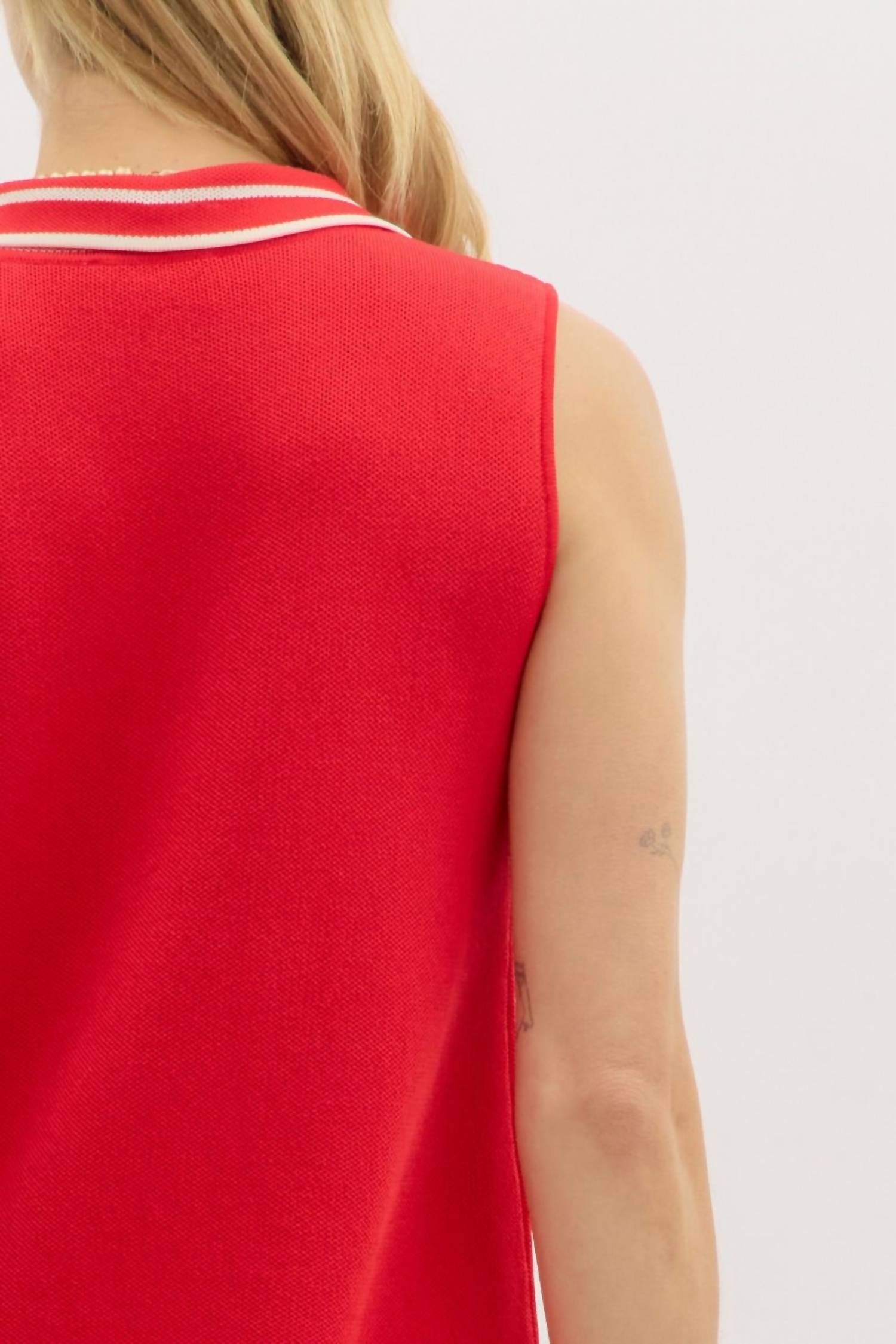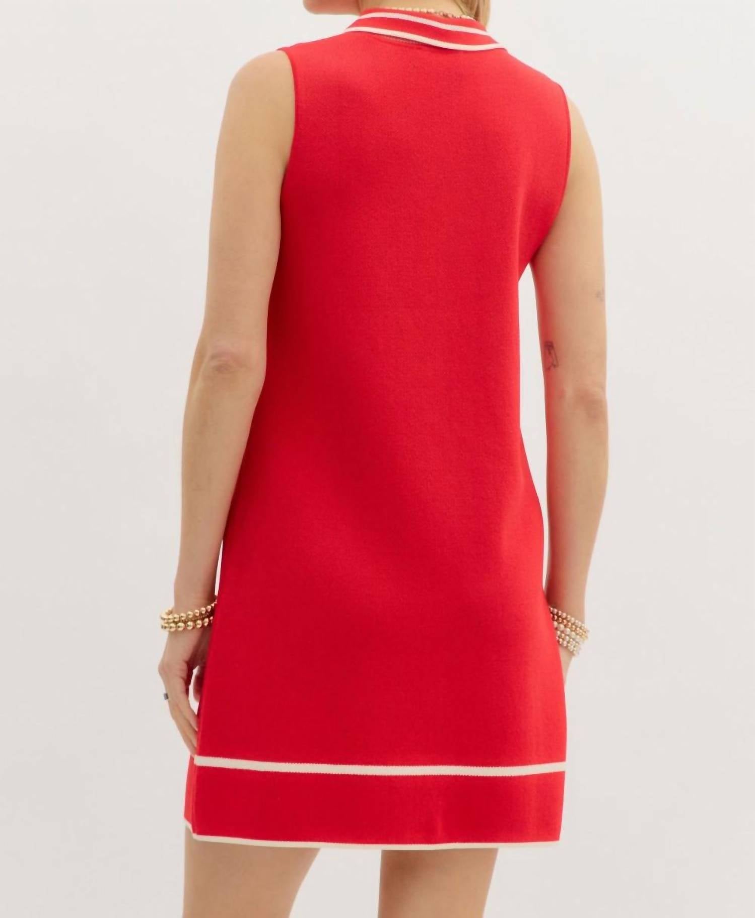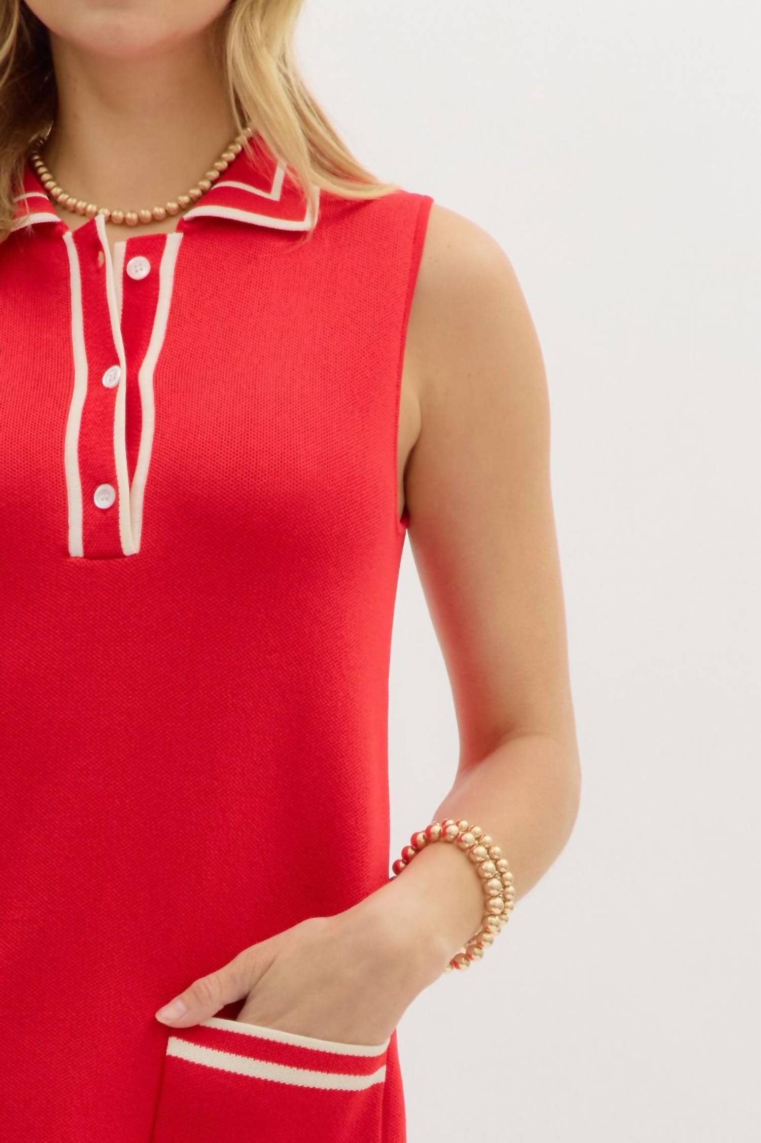 Solid sleeveless sweater knit mini dress featuring contrast stripe accents. Collar button front closure. Pockets at front. Unlined. Knit 63% Viscose 37% Nylon