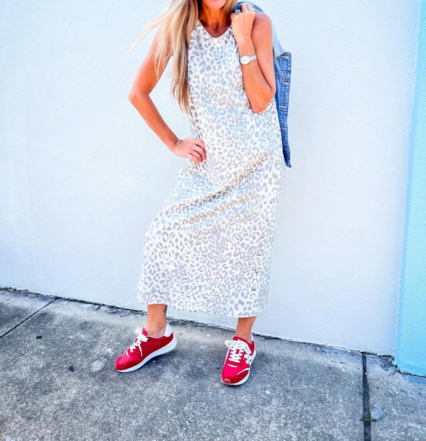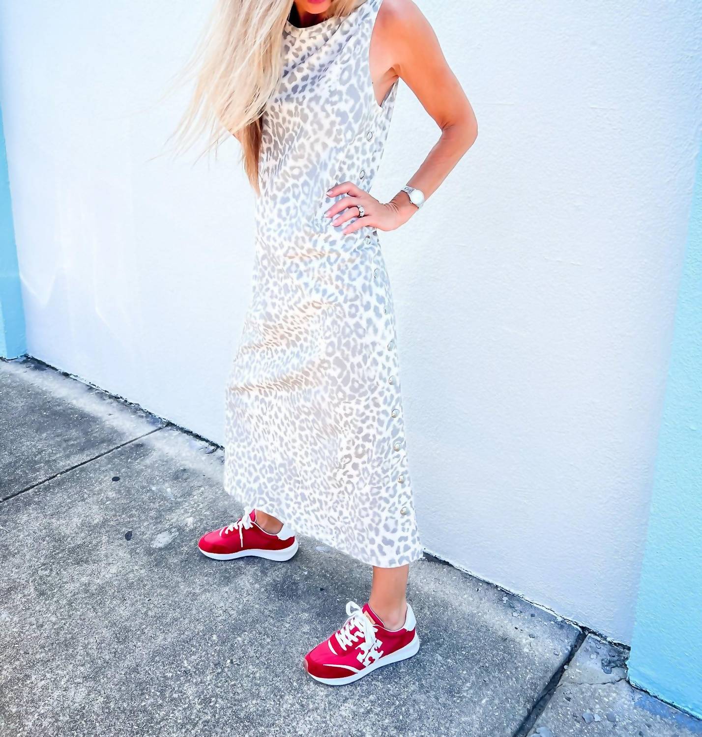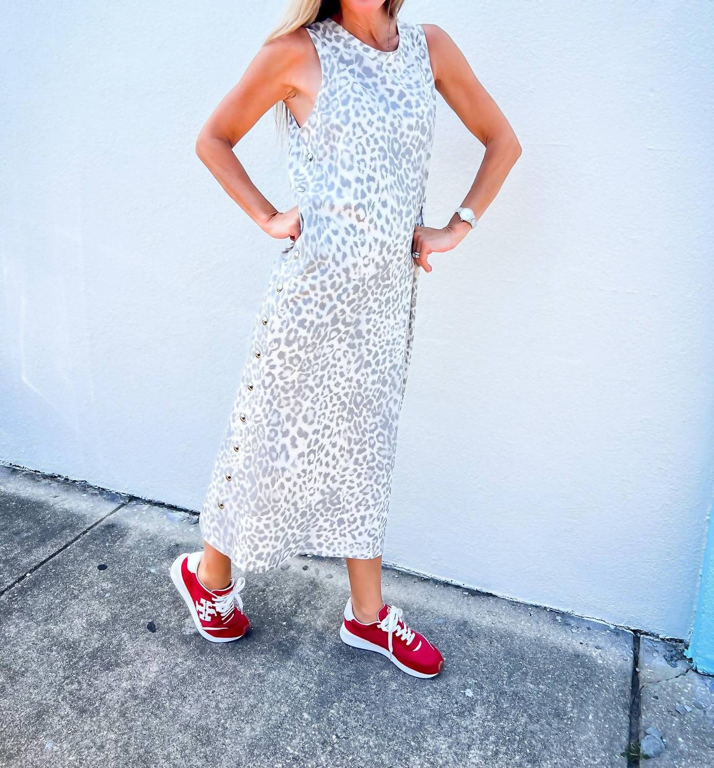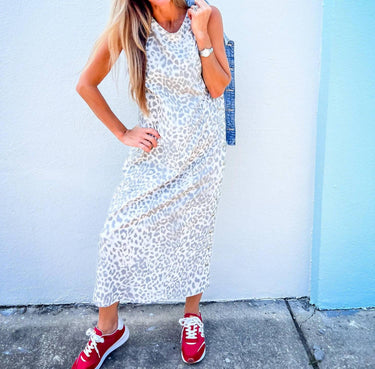 Express your fierce style with the Wild Side Studded Midi Dress by Entro, designed for those unforgettable nights out. This sleeveless sheath dress features a bold leopard print crafted from a breathable cotton blend jersey knit, accented with subtle silver studs for added edge. With a midi-length, unlined silhouette, and a back slit for effortless movement, it ensures comfort and allure in every step. Closure: Pull on. Care: Hand wash for lasting quality.