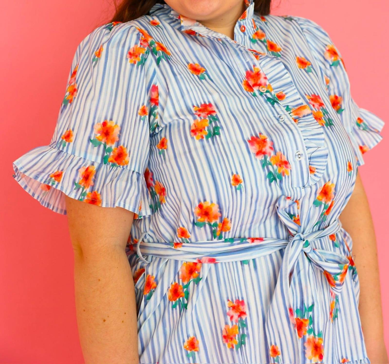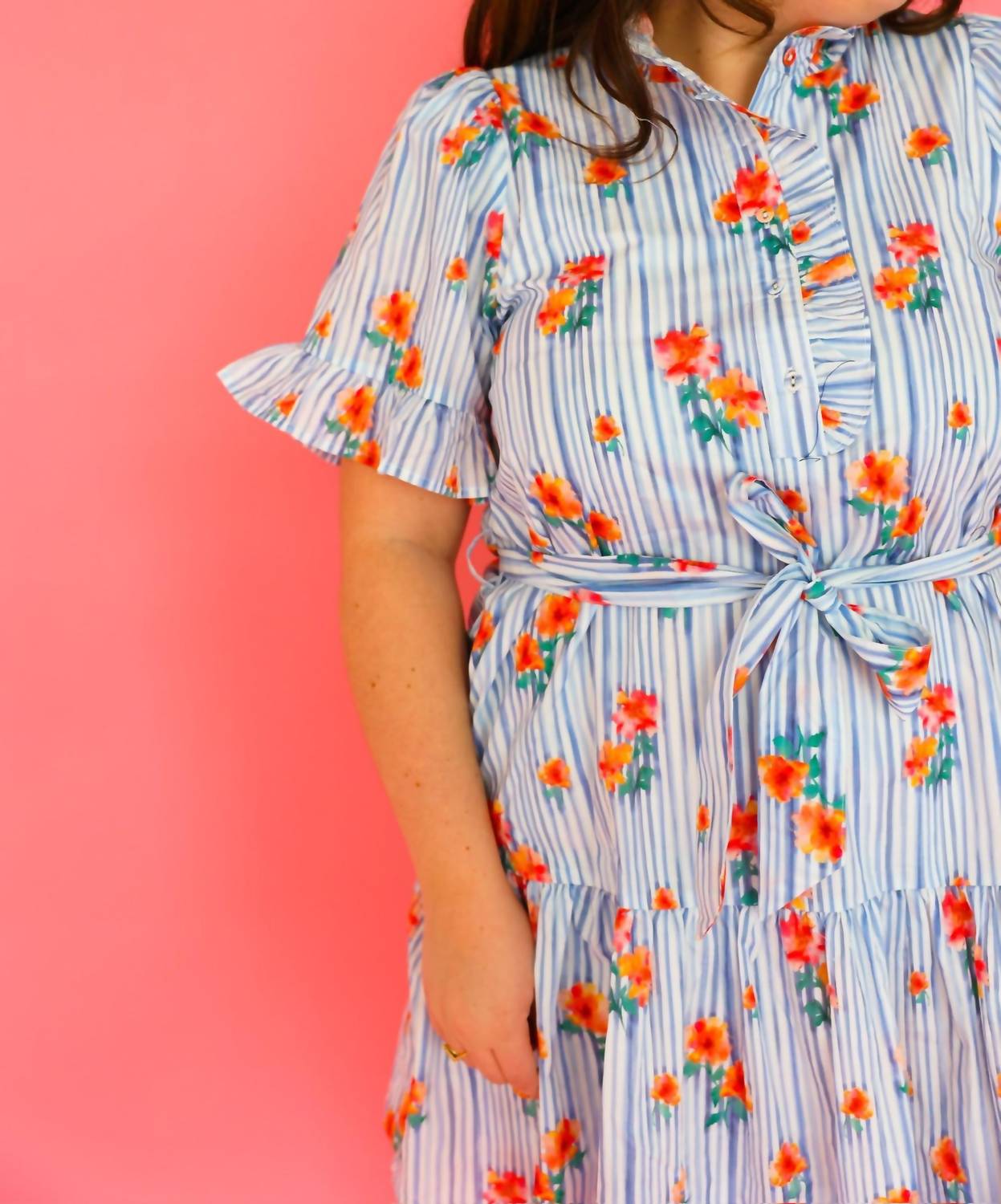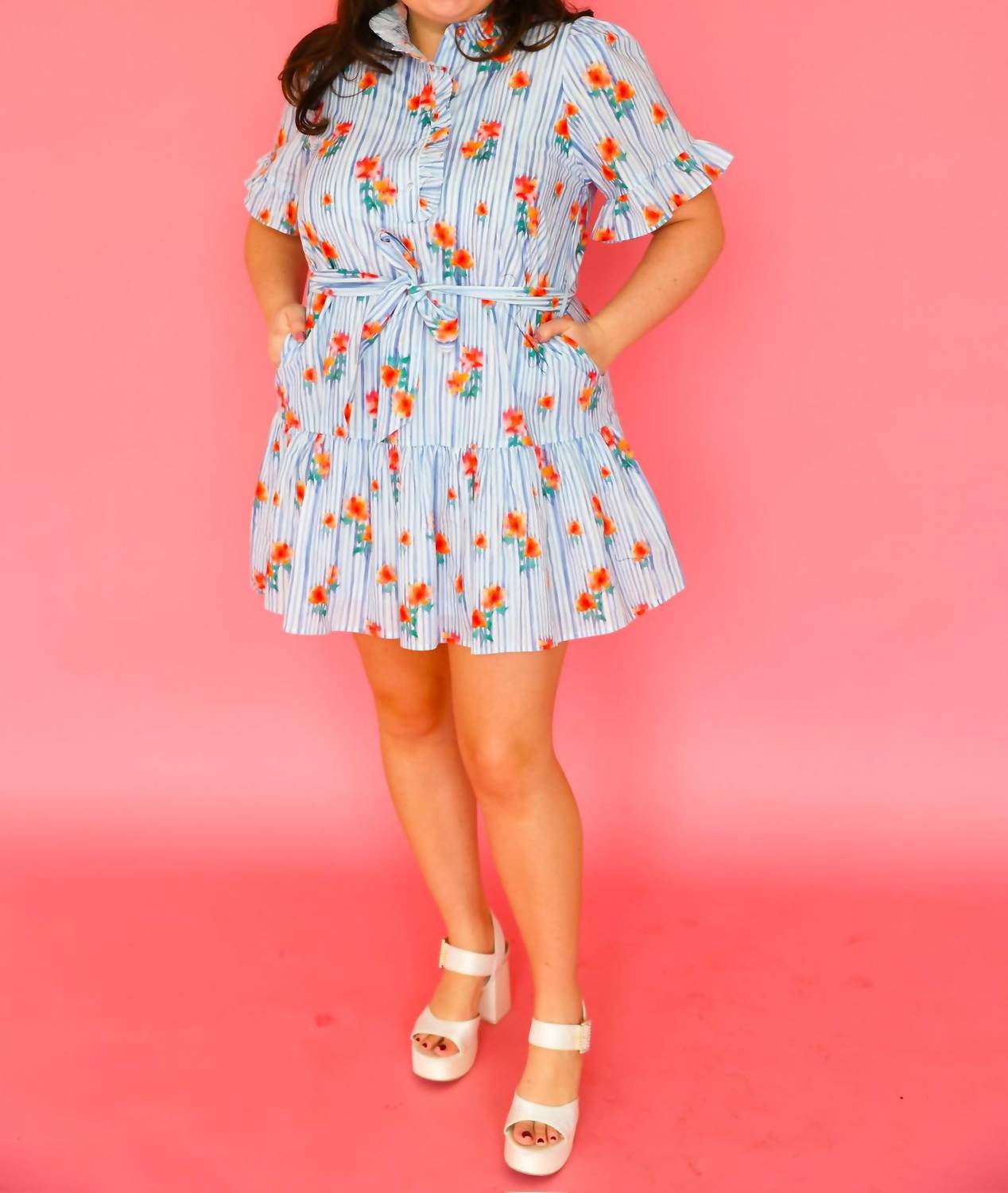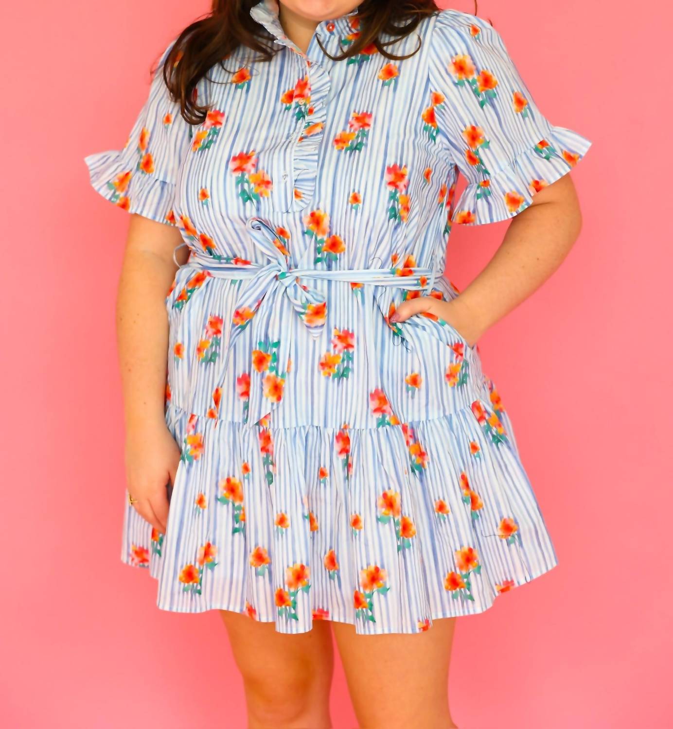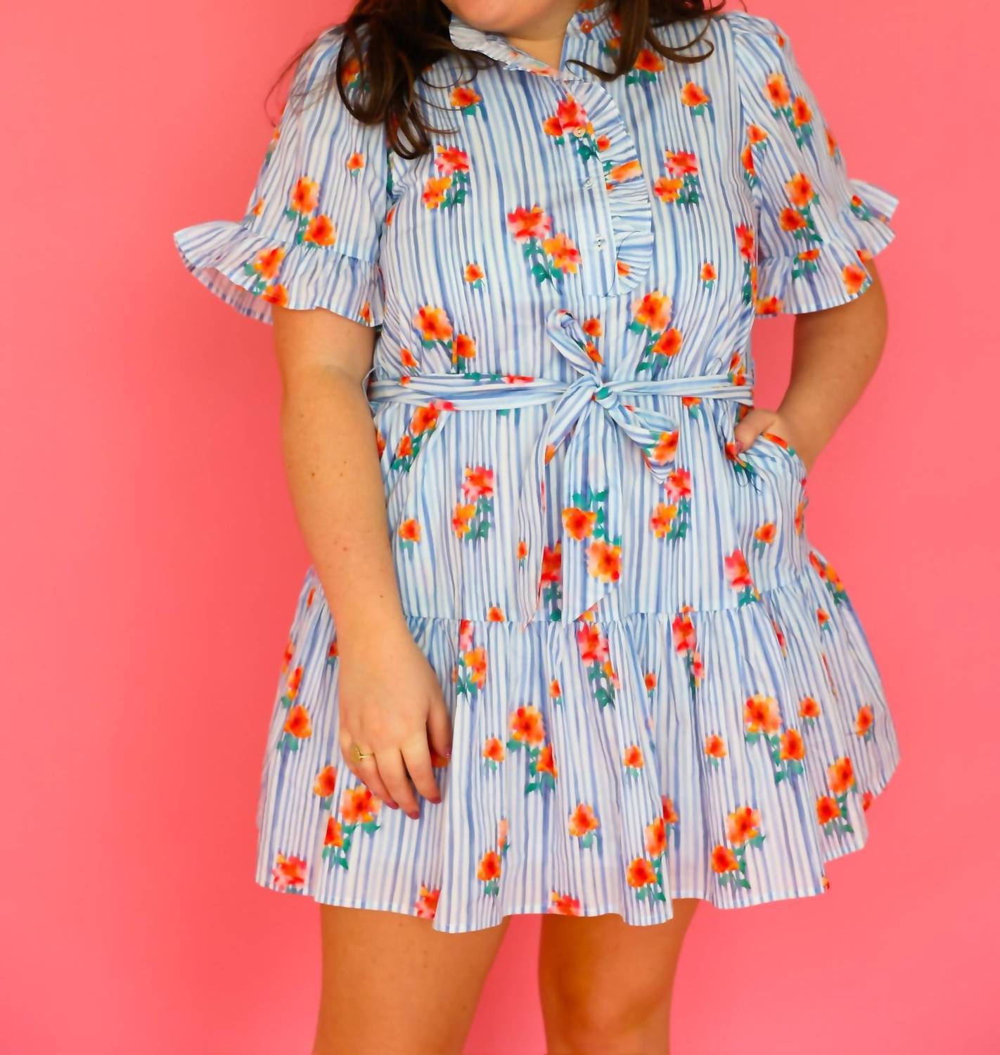 Make an entrance in the Willow Floral Mini Dress by Entro, a feminine piece perfect for any summer occasion. With its short sleeves featuring ruffle details, this dress showcases a vibrant floral pattern and a sophisticated mockneck design. It is crafted with a playful mini shift silhouette and includes functional side pockets for added convenience. Closure is by a half placket, and it comes with an adjustable waist tie, making it effortlessly stylish. Care instructions suggest that it is machine washable, allowing for easy maintenance. Model Mason, who is 5'4" with a 44" bust, 38.5" waist, and 52" hips, is pictured wearing size Large.