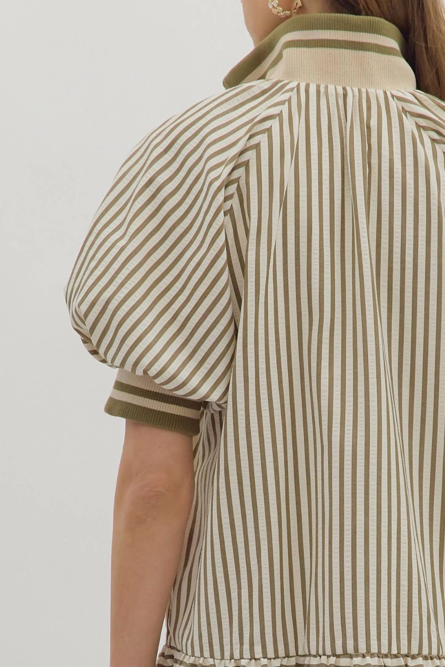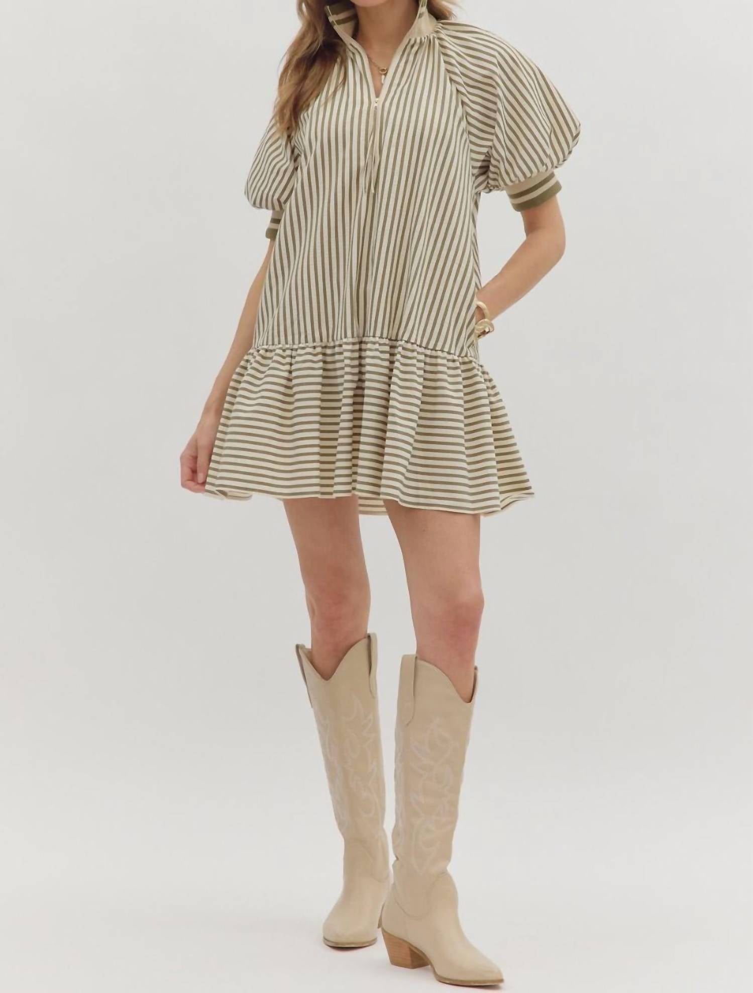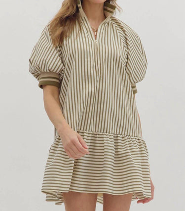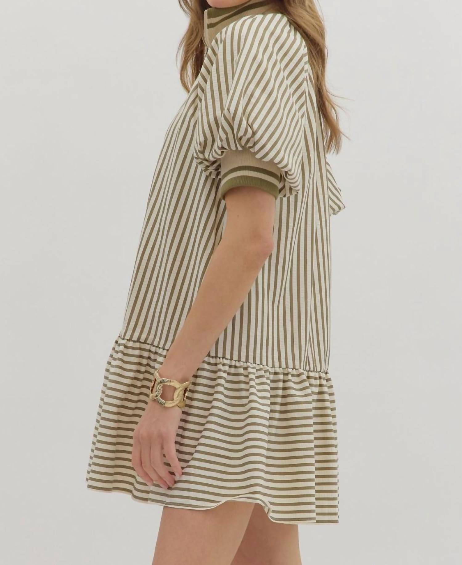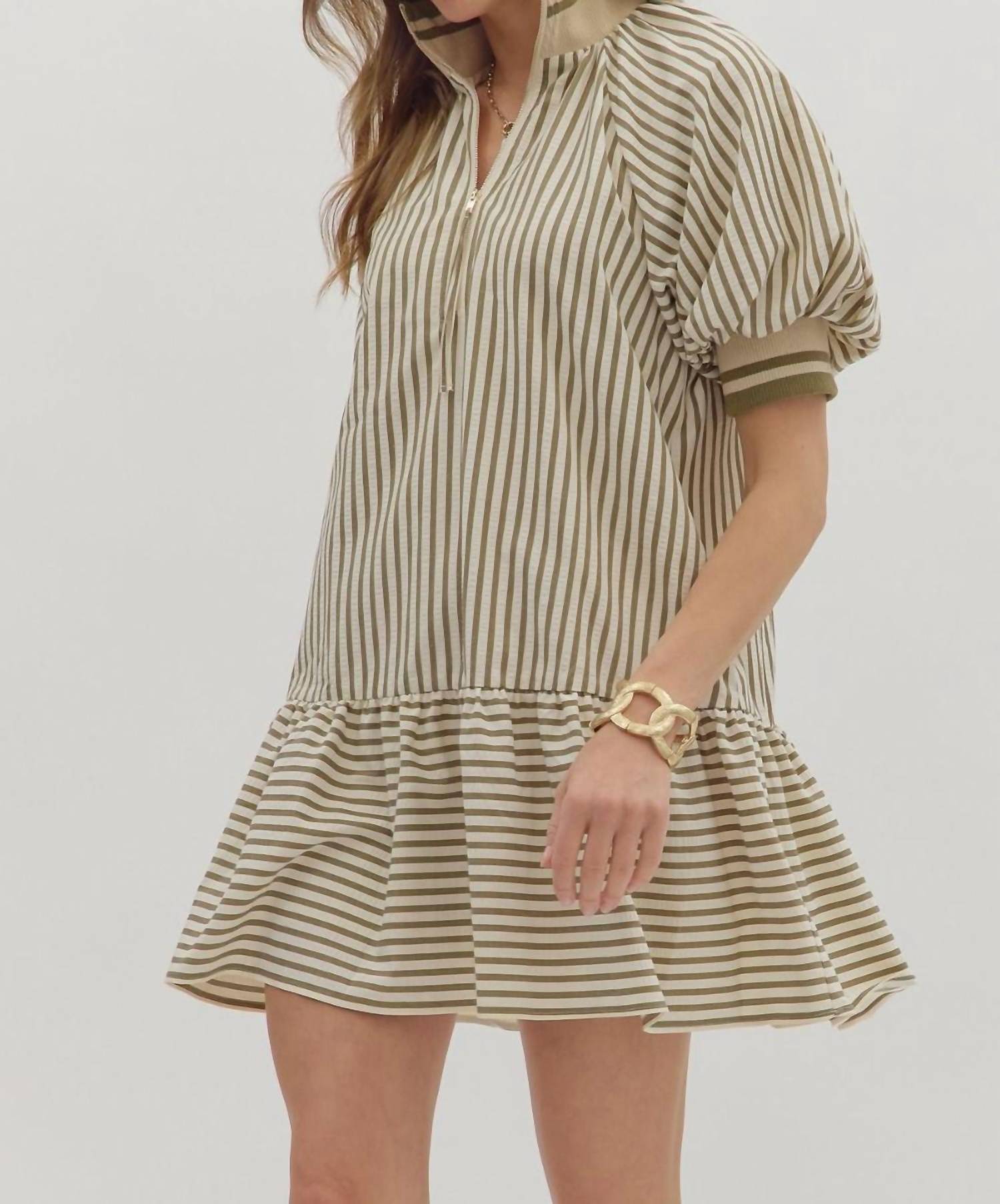 The perfect mini dress for those warmer months. Introducing the Women's Going Places Stripe Mini Dress by Entro, perfect for your minimalist vacation wardrobe. This olive stripe dress showcases short raglan bubble sleeves and a ruffle hem for a playful finish. Crafted from 50% cotton and 50% polyester, it features a multicolor accent band on the collar and cuffs, a zip v-neck, and convenient side pockets. Closure: Button closure.