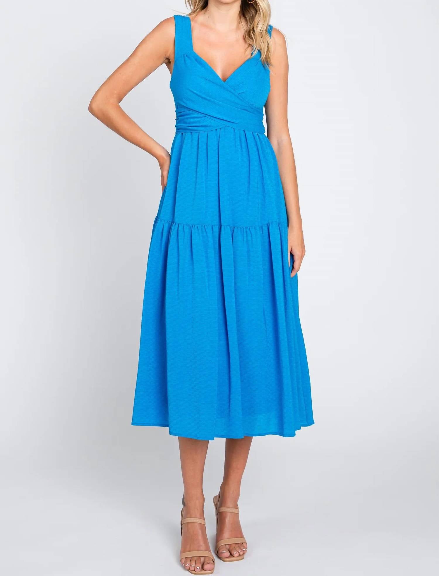 Introducing the Wrap Tie Midi Dress by Entro, a perfect summer staple for your vacation wardrobe in a timeless blue hue. This sleeveless dress is crafted from 100% Polyester, featuring a V-neckline and a fit and flare silhouette with self-tie details at the back, offering a minimalist textured pattern. The dress measures 45" in length and includes a convenient zip closure for a secure fit. For best care, hand wash cold and line dry.