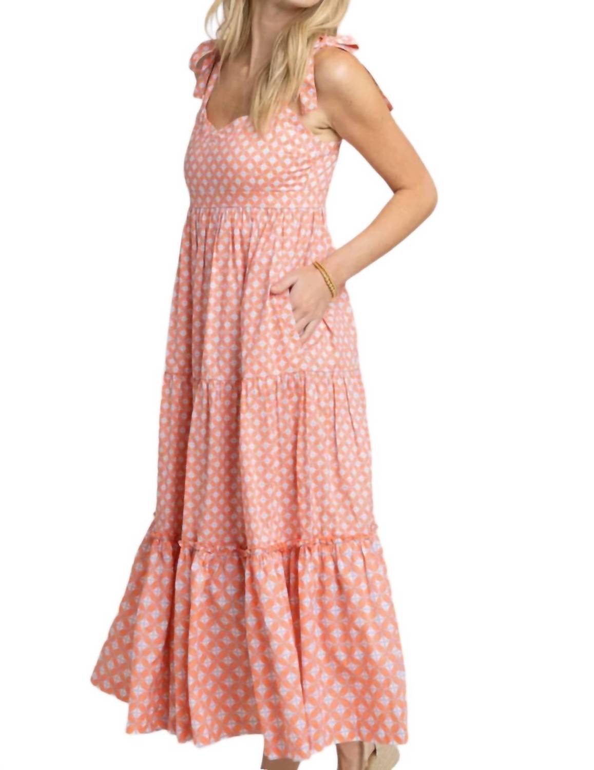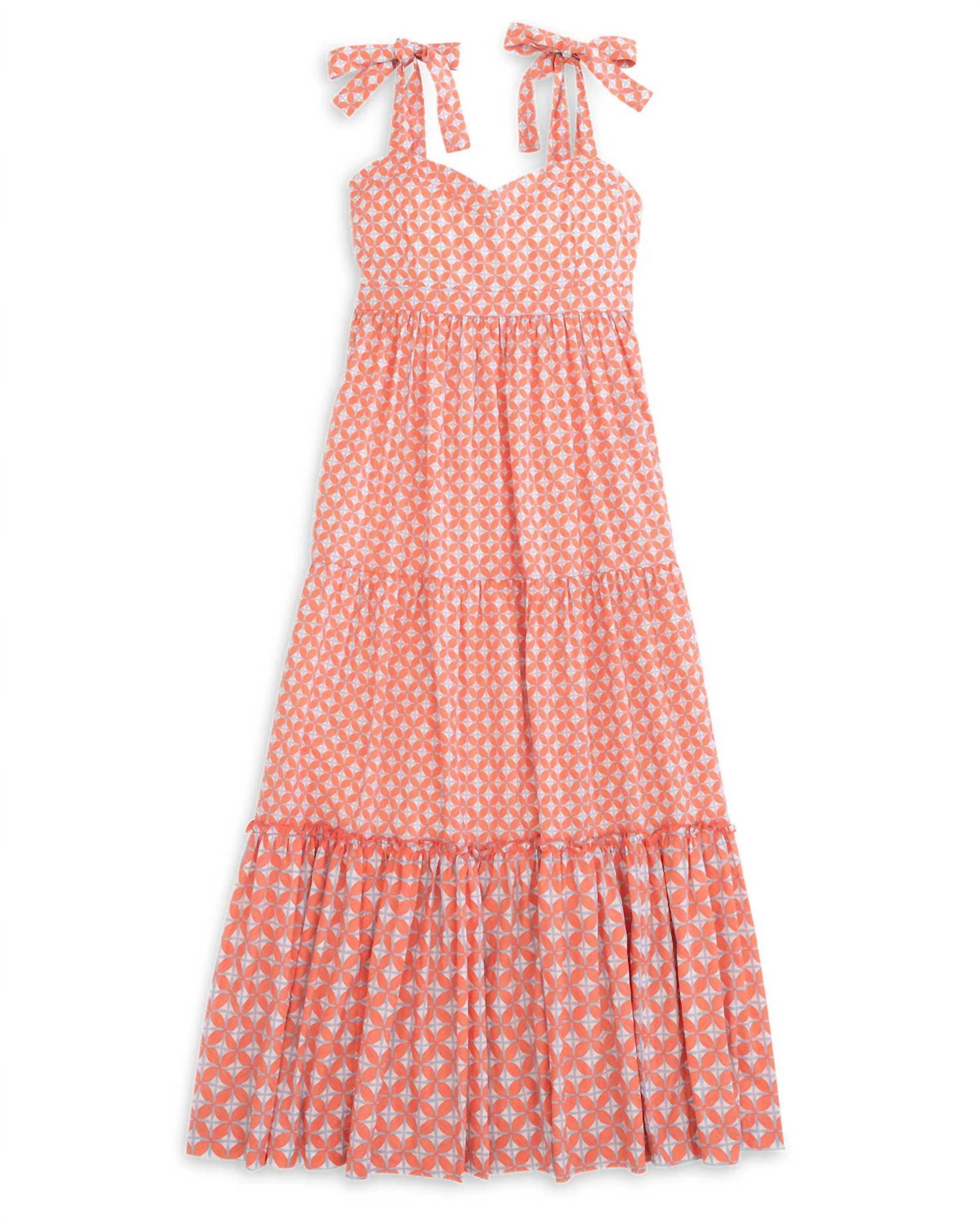 Elevate your summer wardrobe with the Sylvi Sun Daze Maxi Dress by SOUTHERN TIDE, perfect for making a statement in Conch Shell. This sleeveless cotton maxi dress features a captivating geometric pattern with a flattering sweetheart neckline and empire waist silhouette. Enjoy added convenience with pockets and a chic tie closure for a personalized fit. Care instructions include machine wash and lay flat to dry for easy maintenance.
