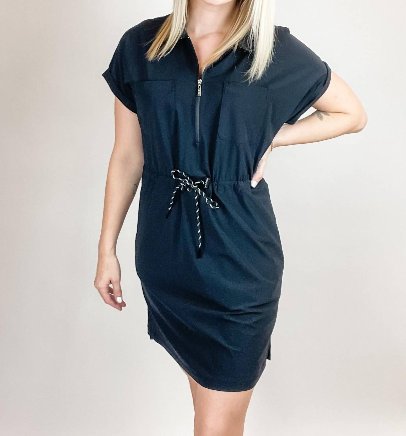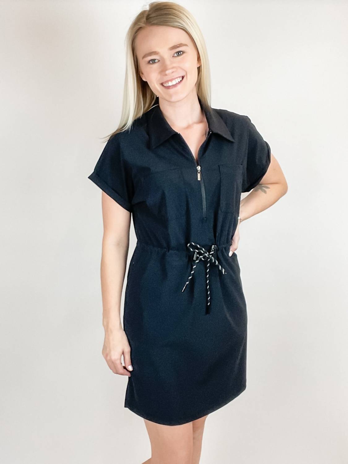 Embrace a relaxed yet refined look, perfect for travel and streetwear enthusiasts. Mini dress in solid blue features short sleeves and a collared neckline with an adjustable zipper for added style and convenience. Crafted from 74% Nylon and 26% Spandex, accommodates easy movement and a flexible fit, enhanced by the drawcord detail at the waist. Closure is a seamless button type. Gentle hand wash.