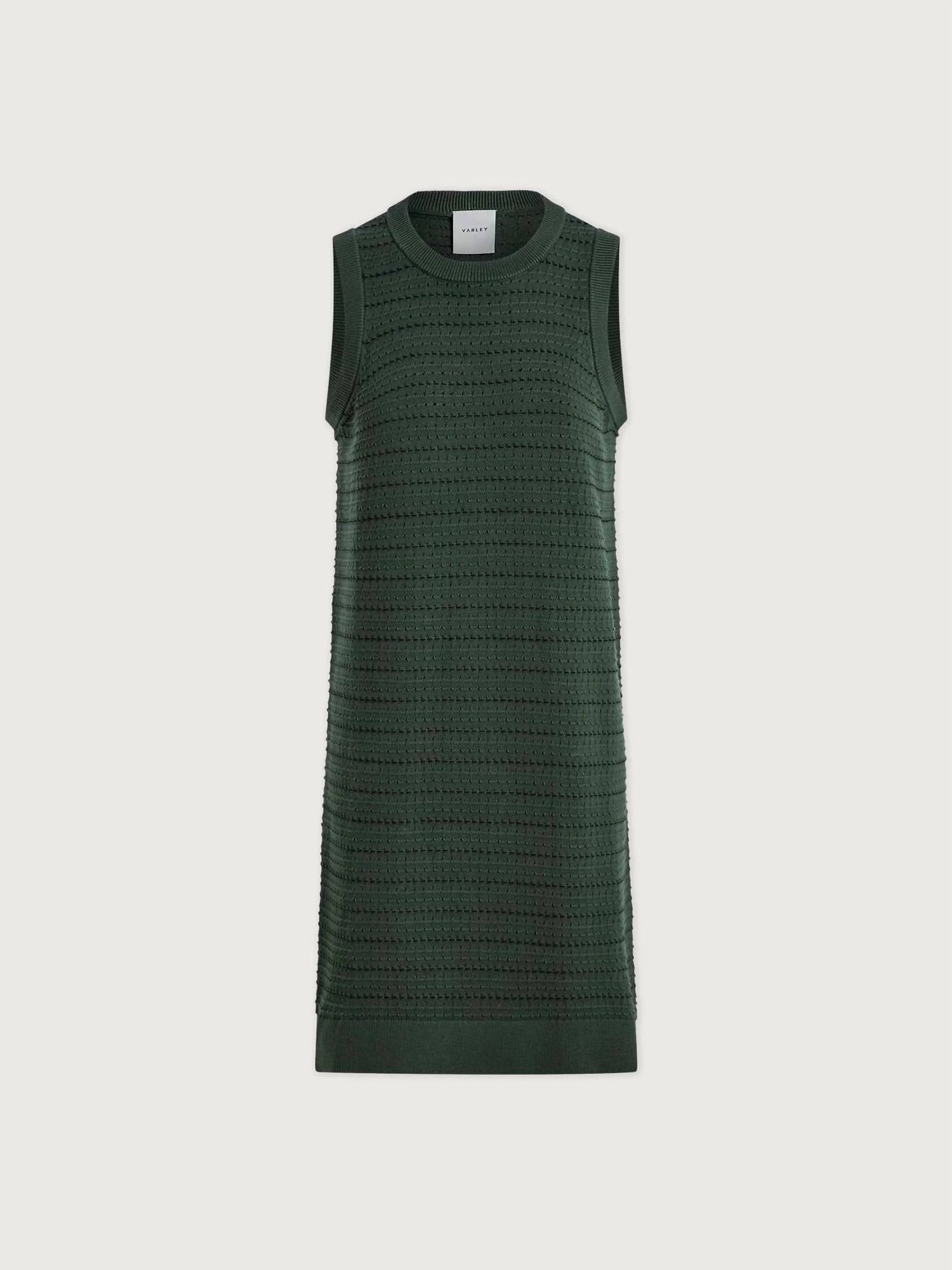 Embrace minimalist elegance with the Mindy Contrast Stitch Knit Dress by VARLEY, presented in a refreshing cilantro hue. This sleeveless, crewneck sheath dress is crafted from 100% cotton in a fine gauge textured stitch, providing lightweight coverage with a stylish twist of contrast stitching throughout. Closure: Pull-on design. Care: Machine wash recommended. Perfect for vacation or St. Patrick's Day celebrations.