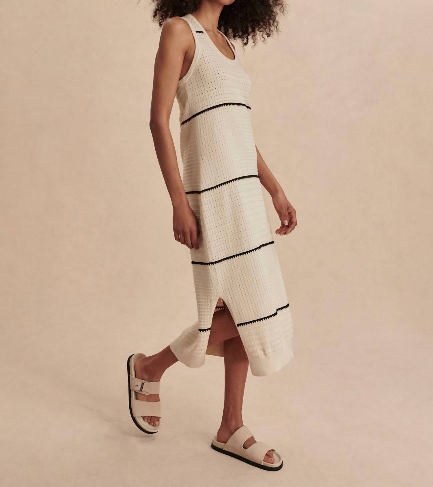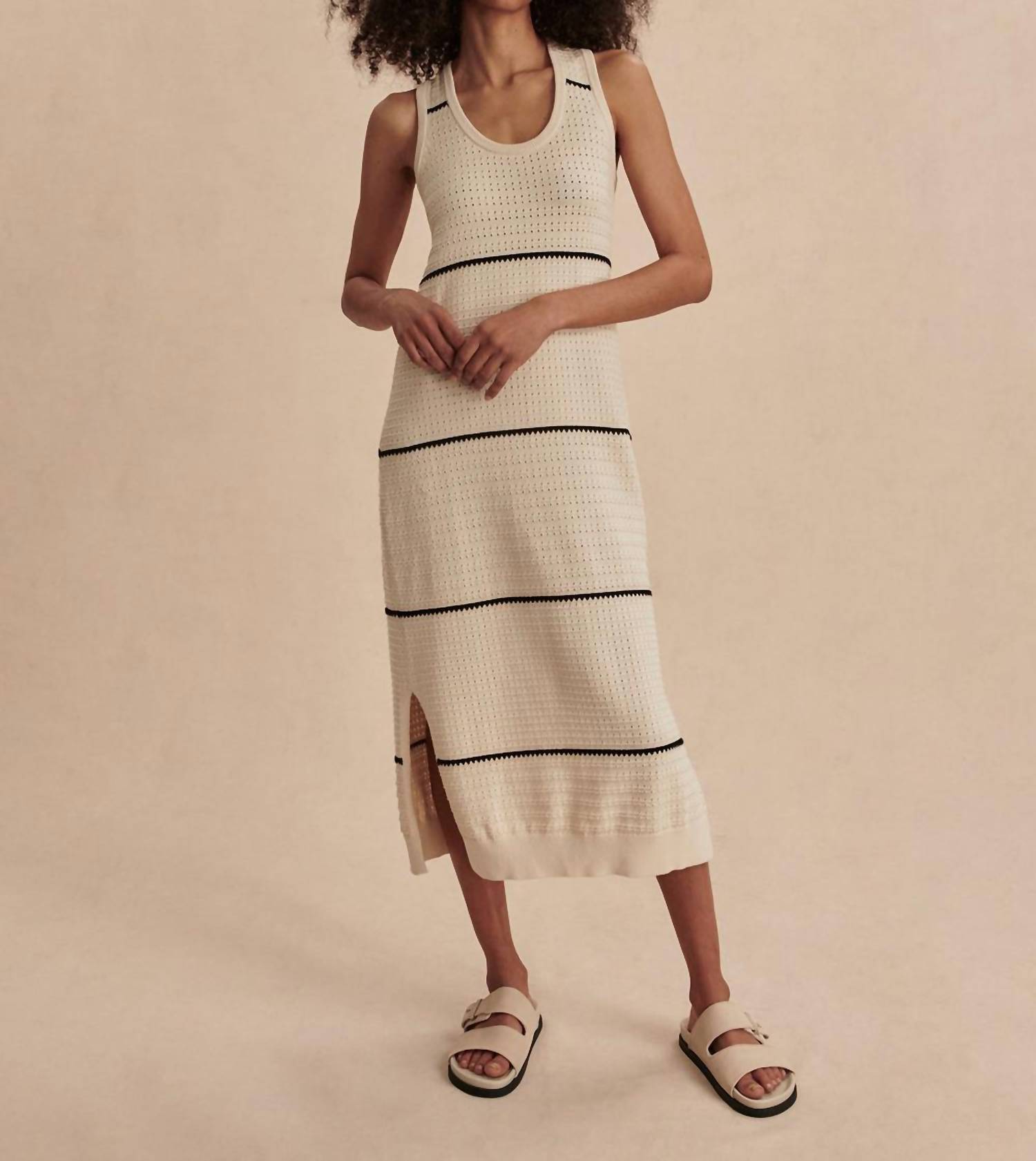 Discover the Scott Scoop Neck Midi Dress by VARLEY, a sophisticated choice for summer gatherings. This sleeveless, striped midi dress is crafted from 100% cotton, offering breathable comfort and stylish minimalism. The dress features a scoop neckline with subtle contrast stitching and side slits that add a contemporary edge. Designed without pockets, it has a shift silhouette and a pull-on closure for effortless wear. Care instructions: Machine wash and line dry.