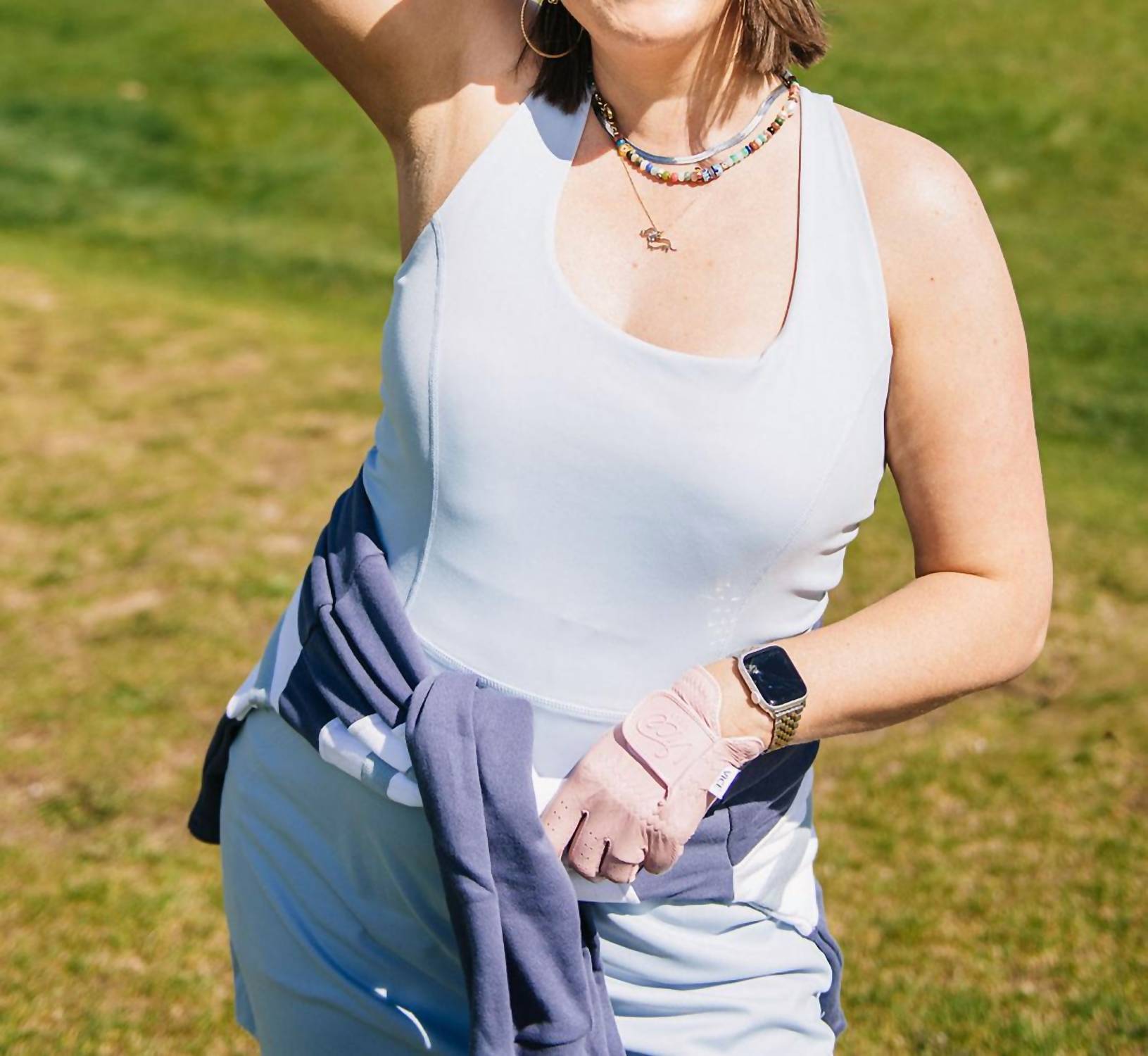 Unleash your inner athlete with the Z Supply Mini Active Mini Dress in light blue, a must-have for game day and beyond. This sleeveless dress features a flattering scoop neckline and a supportive built-in inner onesie with criss-cross straps and removable padded cups. Crafted from 80% polyester and 20% spandex, it's designed for movement with moisture-wicking properties and a convenient inner pocket in the biker shorts. Closure: Pull-on. Care: Machine wash, tumble dry.