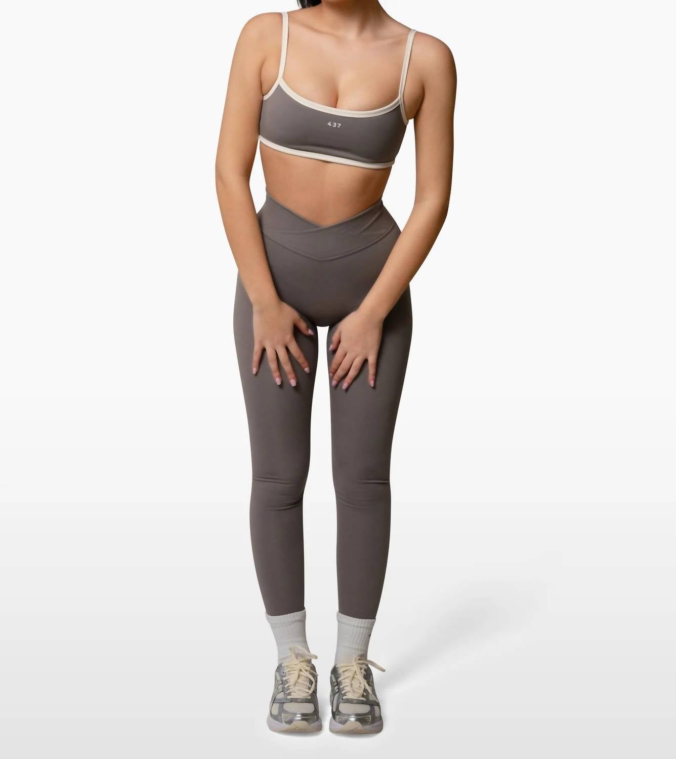 Embrace sleek athleisure with the 437 Double Layered V-waistband Legging in a chic Clay Mask color. These high-rise leggings boast a double-layered v-waistband with a v-dip back detail, designed to flatter and accentuate your curves. Made from 82% recycled polyester and 18% spandex, they offer a slim fit with a skinny leg style, perfect for fitness or workout sessions. Closure: Pull-on. Care: Machine wash, lay flat to dry.