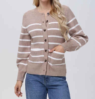 Elevate your wardrobe with the Women's Jo Cardigan by 525 America, a chic piece in a light taupe multi-stripe pattern designed for versatile elegance. This cardigan features long balloon sleeves and a button-front closure, enhancing its sophisticated appeal. With a composition of 64% Polyester, 25% Viscose, and 11% Nylon, it offers comfort and durability, suitable for any occasion. This chic garment, measuring a length of 24", is easy to care for with machine wash and tumble dry low instructions.