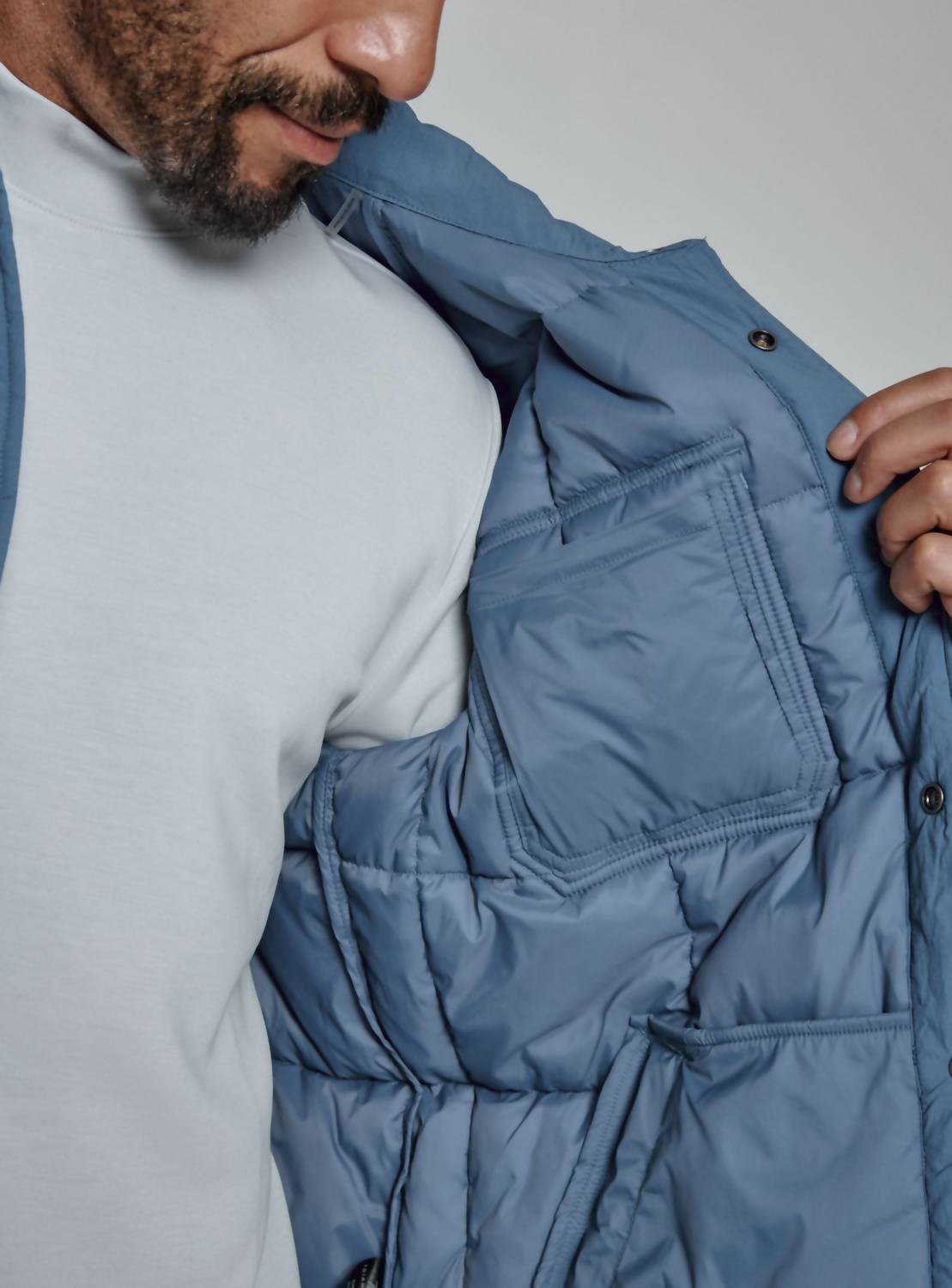 Embrace the chill with the Summit Puffer Jacket by 7Diamonds, crafted in a sleek Dusty Blue hue. This men's long-sleeve piece is made from 100% Nylon, ensuring durability and warmth with its recycled fiber insulation fill. Designed with practicality in mind, it features front flap, interior, and hidden phone pockets, along with snap closures on the cuffs and side vents for added comfort. Care is made easy with machine wash cold and tumble dry low instructions, perfect for travel or bringing a touch of workwear trend into your fall wardrobe.