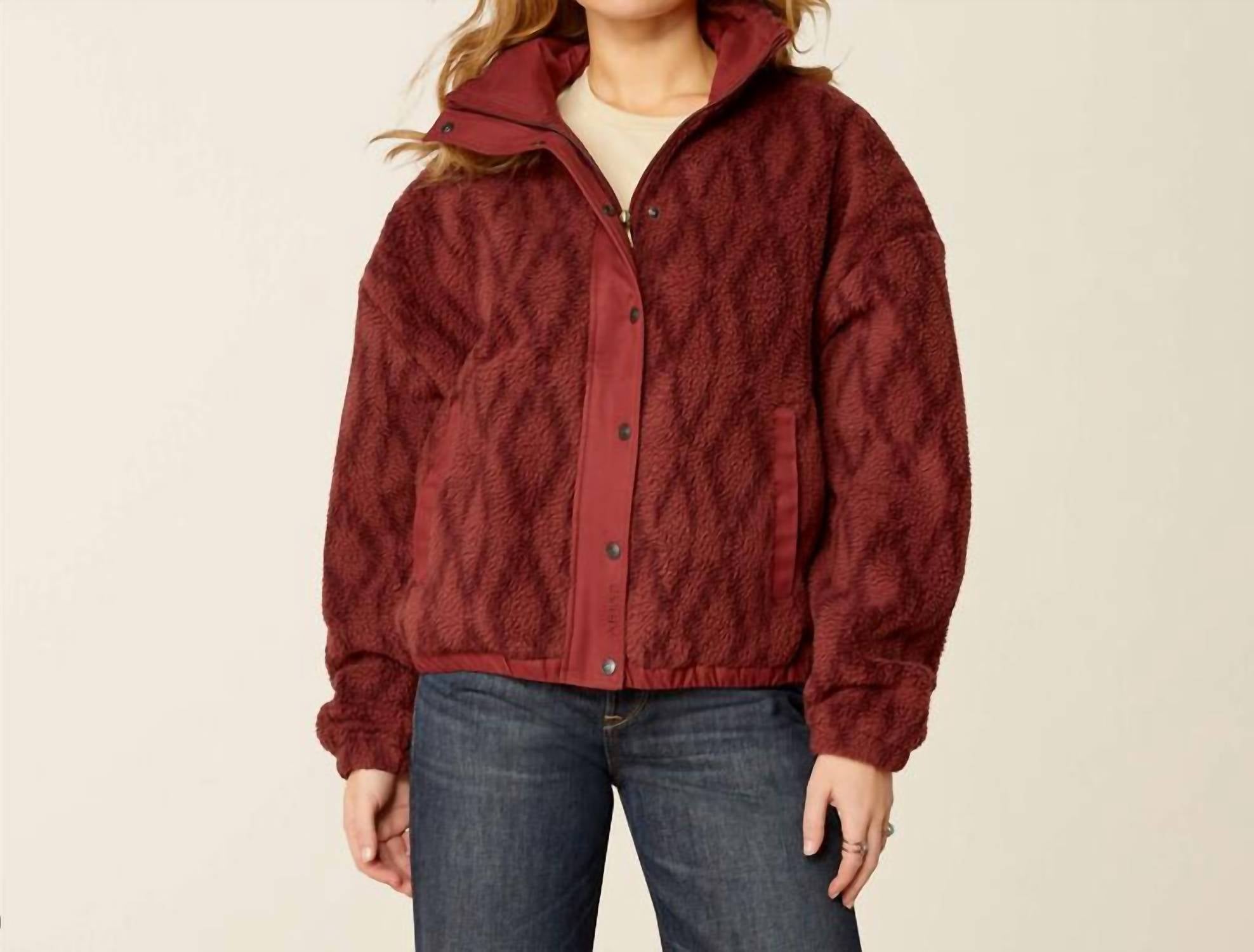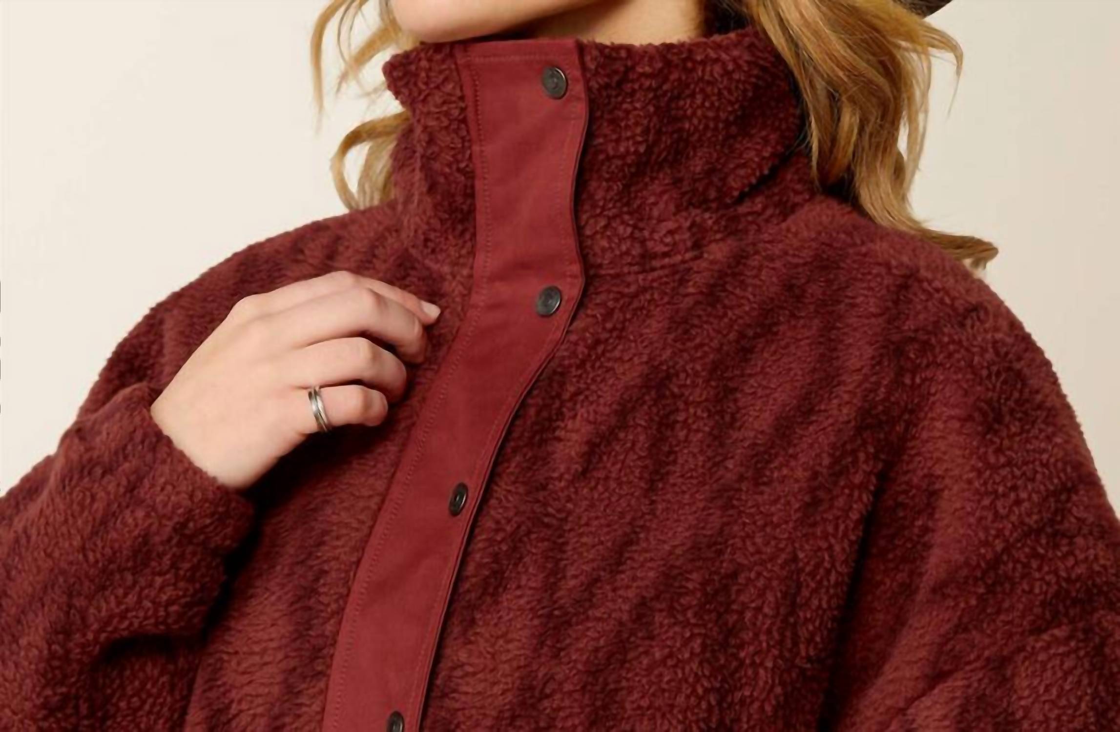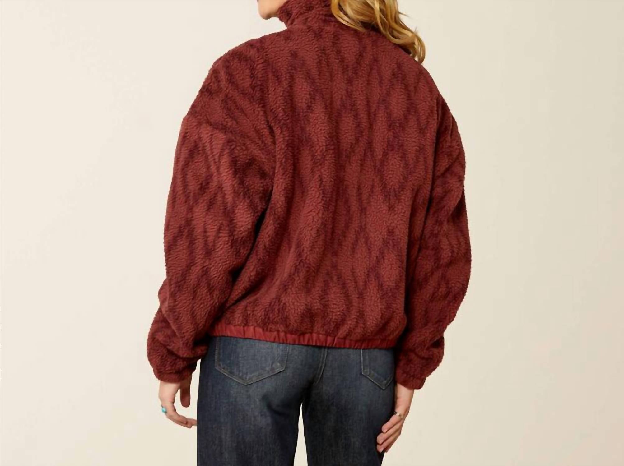 Embrace warmth and style in a rich Wine color. Features long sleeves. Crafted from 100% recycled polyester with a textured, Southwest-inspired print. Oversized cropped fit ensures a casual yet stylish look. Complemented by a convenient snap closure with faux leather pulls.