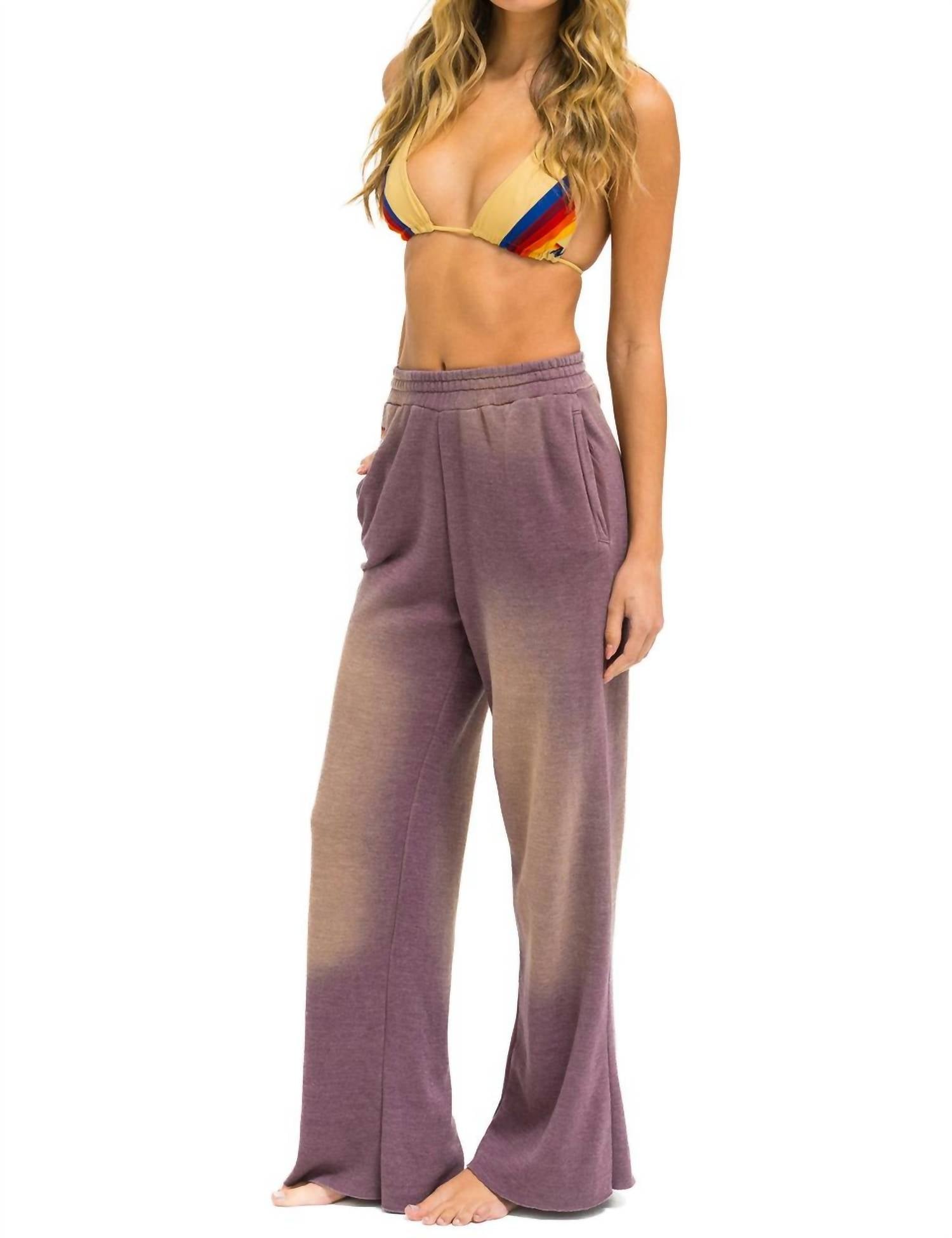 Relax in effortlessly chic style with the Essential Wide Leg Pocket Sweatpants by Aviator Nation in a unique Faded Mocha tie-dye pattern. Crafted from a tri-blend fabric consisting of 50% polyester, 38% cotton, and 12% rayon, these sweatpants are hand-sewn in Los Angeles and feature a convenient pull-on closure. The wide-leg design and pockets make them perfect for cozy days or casual outings. Machine wash cold with like colors, line dry or tumble dry on low.
