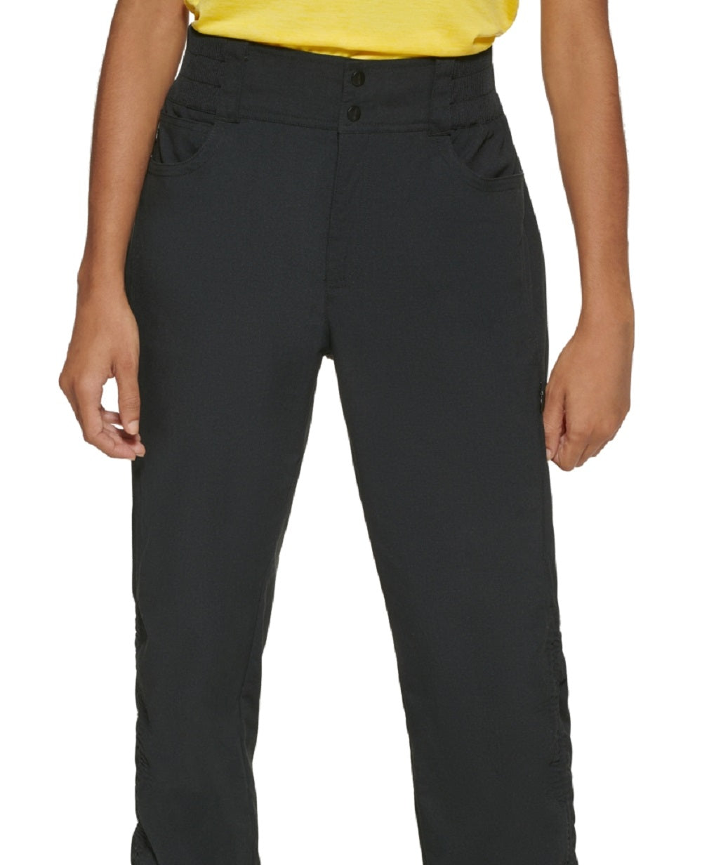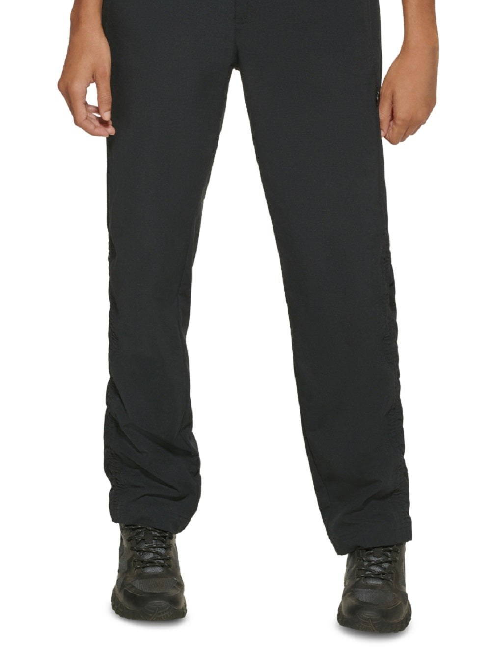 BASS OUTDOOR's Alpine Trail pants' calling card are their versatility. They can easily transition from a morning spent hiking to an evening of errands| walking the dog or meeting up with friends. | Approx. inseam; 29| Mid rise| Snap closure with elastic waistband| Hidden side draw cord allows for cinched/cropped leg; utility/carabineer clip at back| Polyester/nylon