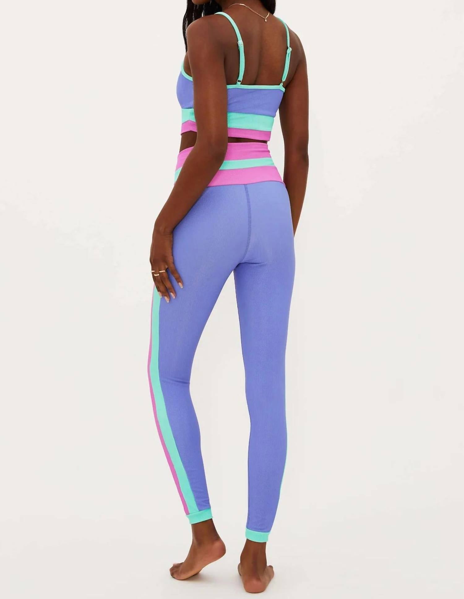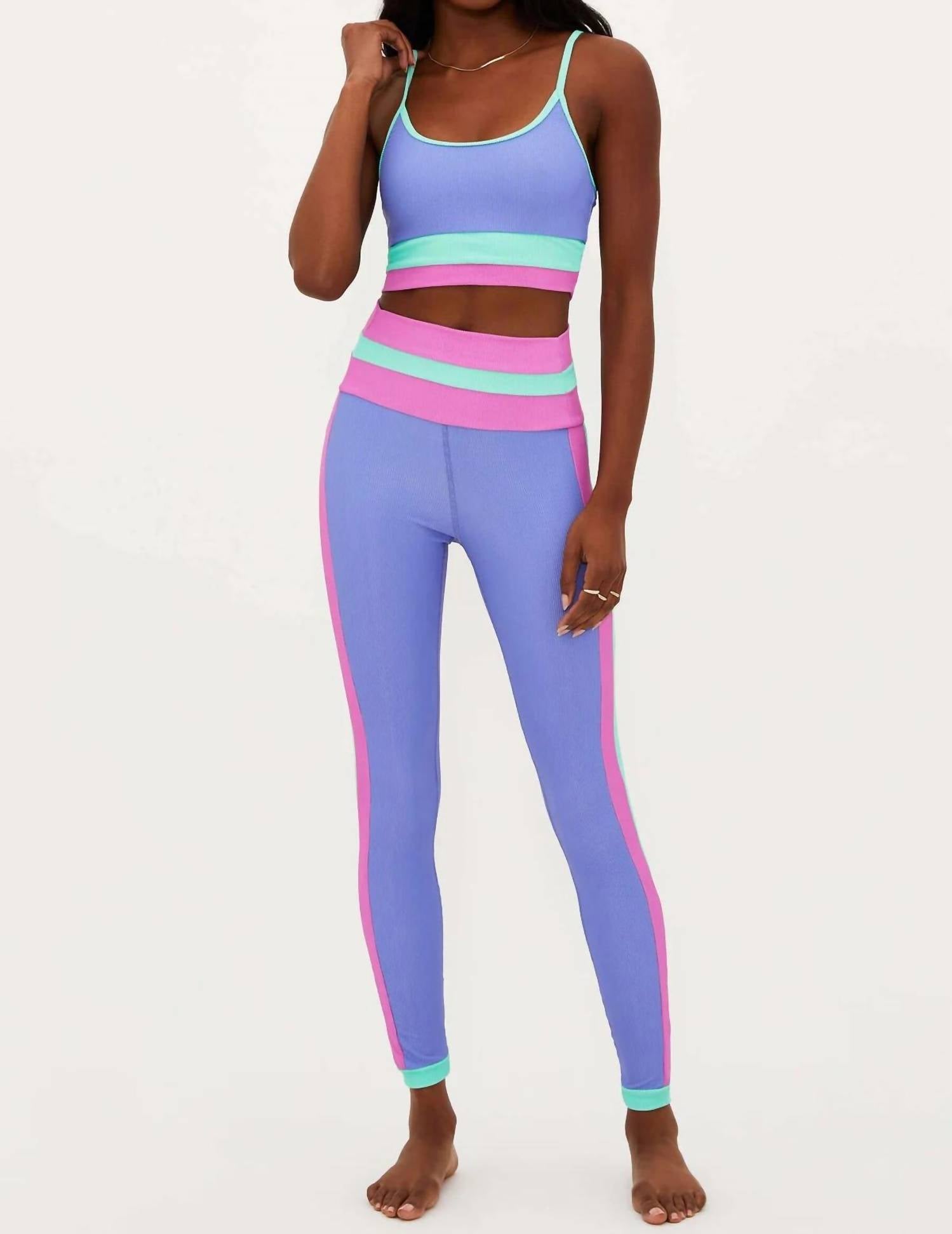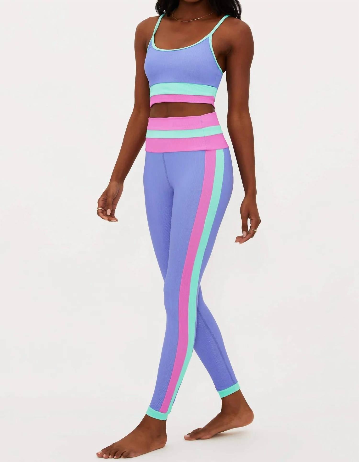 These high-rise leggings feature color-blocked panels at the waist and sides, adding a vibrant touch with spring pastels. Crafted from 82% polyester and 18% spandex, the ribbed texture delivers an ultrasoft, second-skin feel for maximum comfort during active pursuits. These skinny-leg leggings are designed without pockets, ensuring a sleek and smooth fit for all your fitness activities.