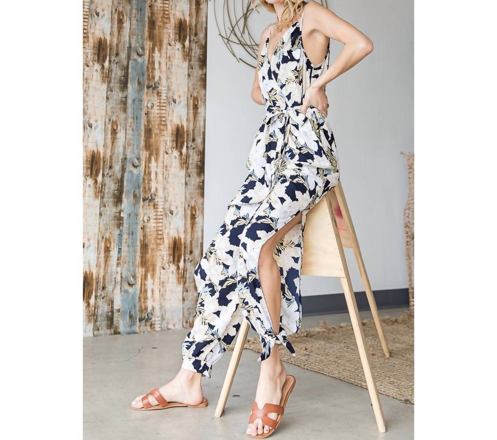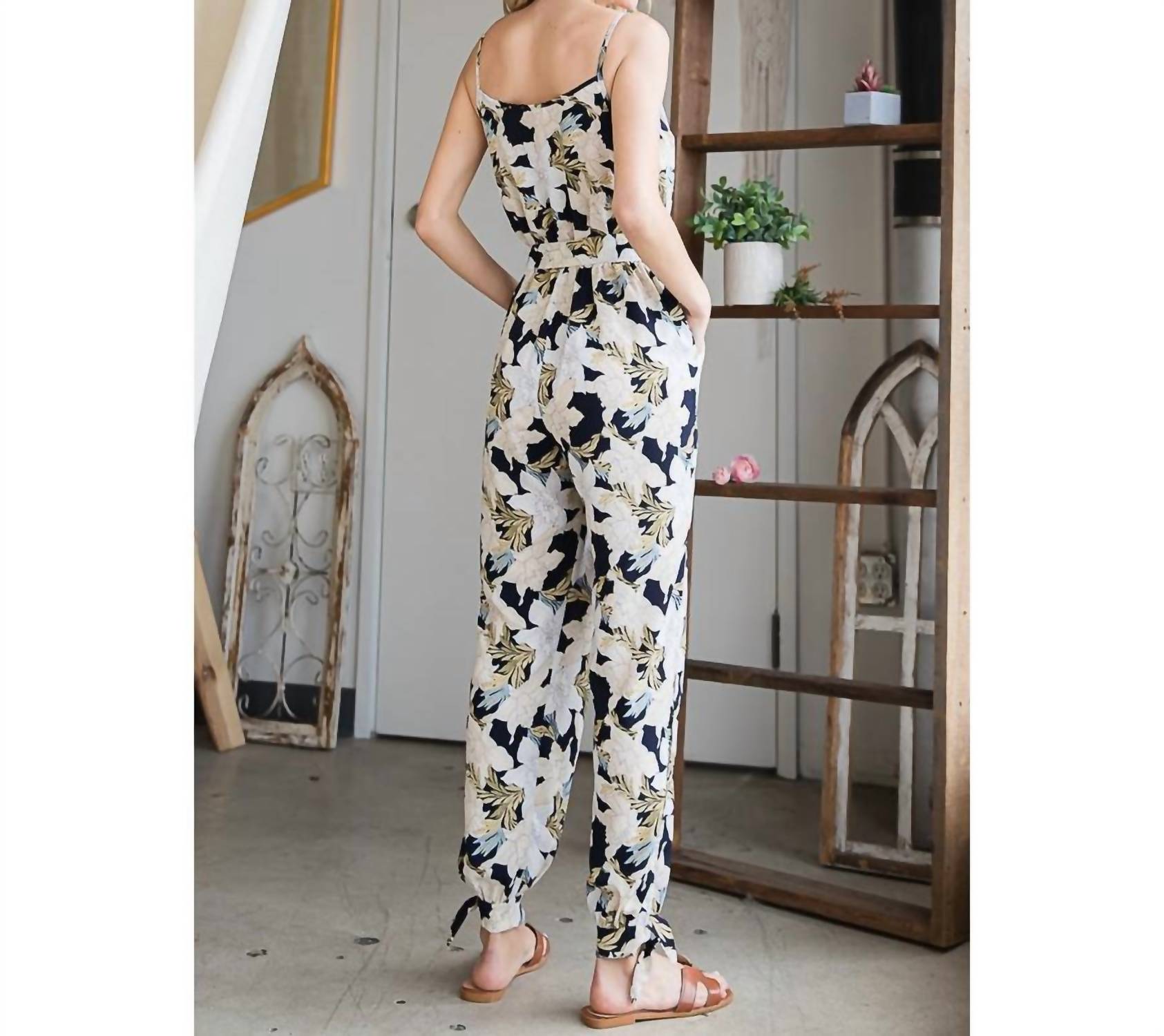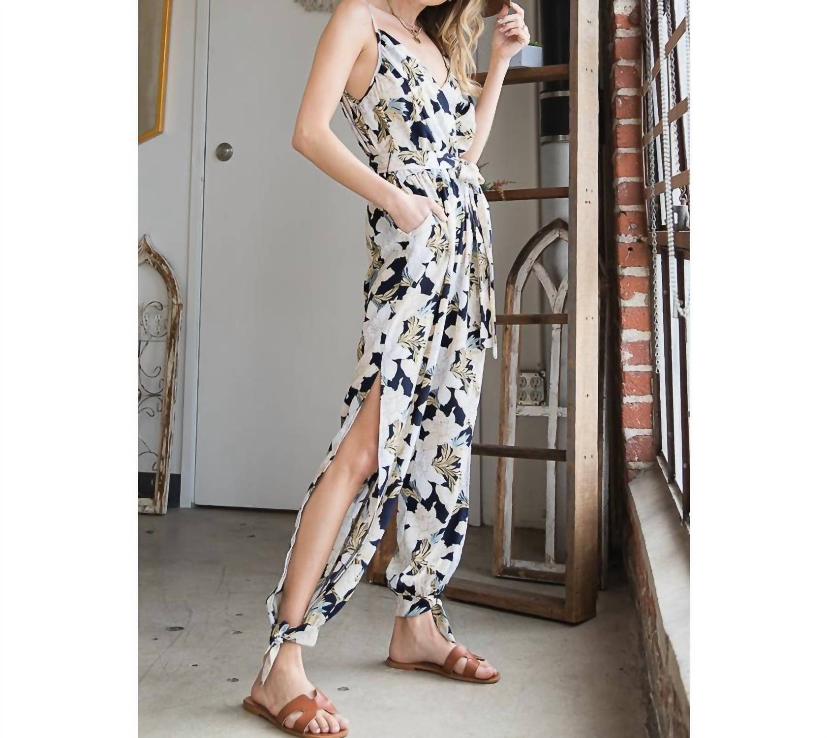 Introducing the Breezy Leg Jumpsuit by BUCKETLIST, a multi-colored, floral print piece perfect for a Boho Chic summer vibe. This relaxed fit jumpsuit is crafted from lightweight woven fabric, offering both style and comfort. Designed with a V-neckline, it features adjustable ties at the legs and waistline for a customizable fit. Proudly made in the USA, this jumpsuit is ideal for vacations and Easter celebrations, complete with the convenience of pockets.