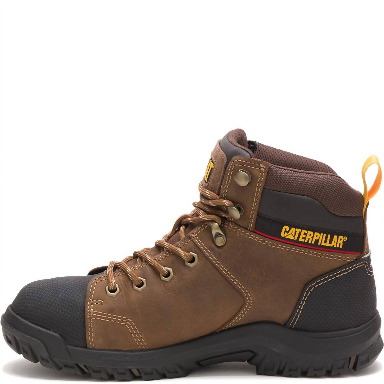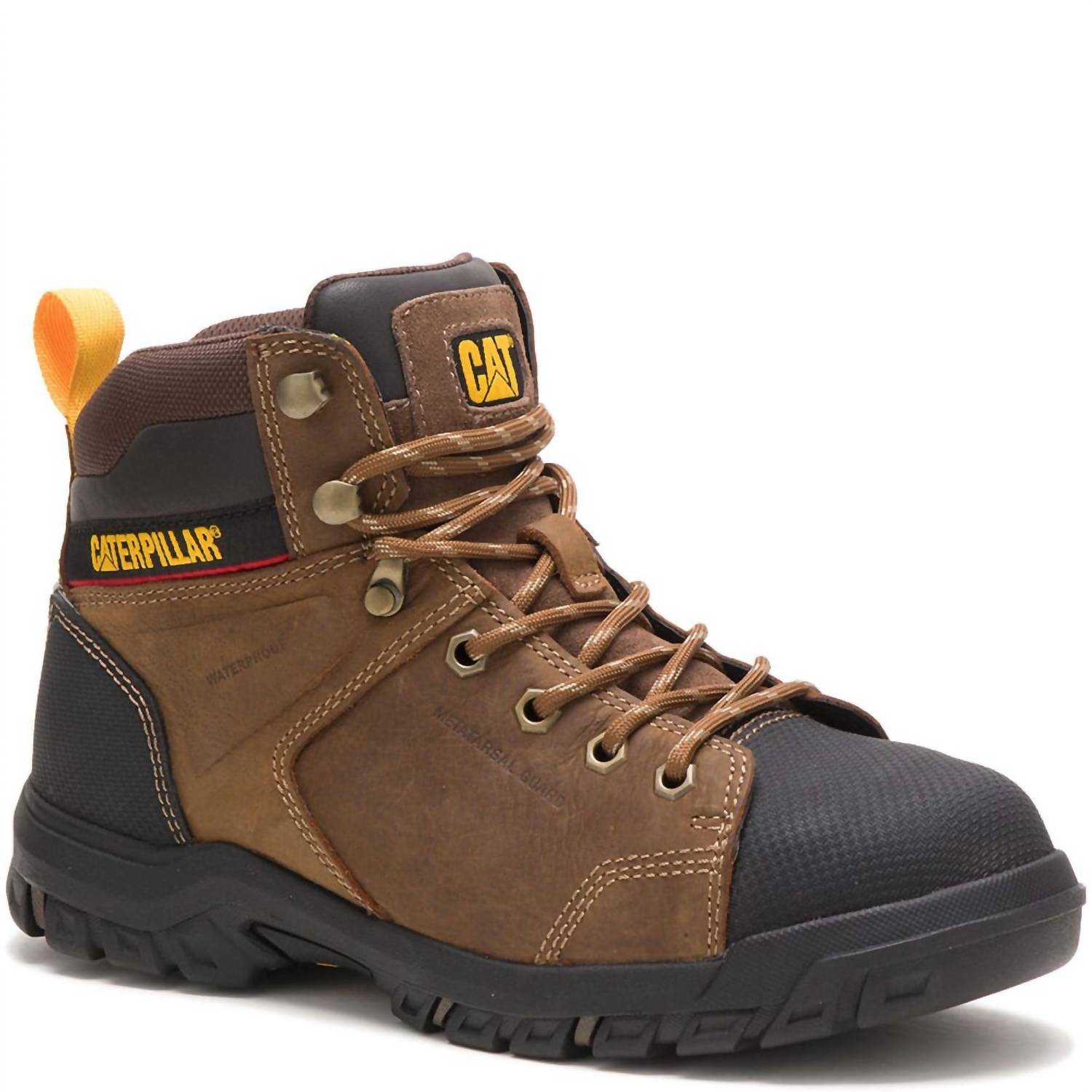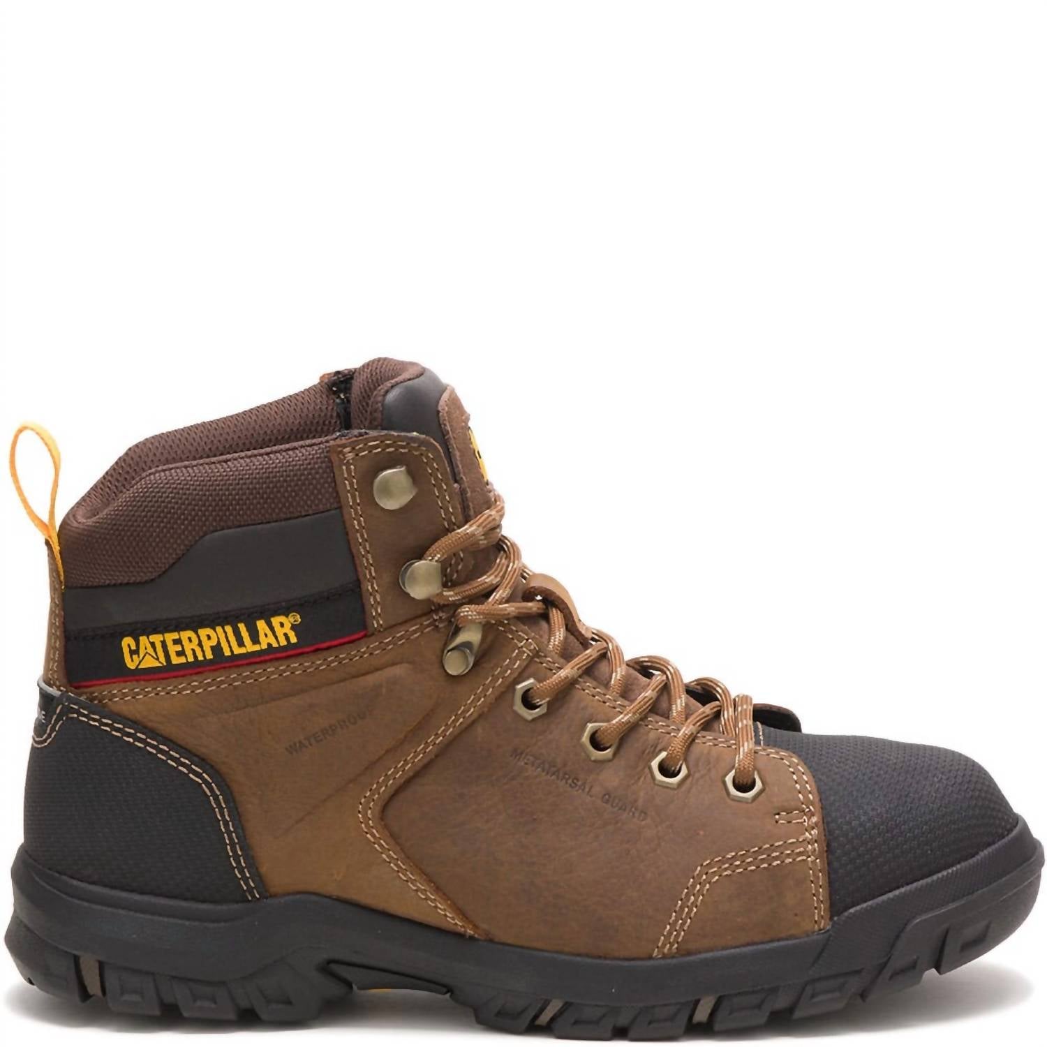 Discover the Women's Wellspring Met-guard Waterproof Work Boot by CAT Footwear, expertly crafted for durability and safety. These boots feature a round toe with a composite safety toe that meets ASTM F2413-11 standards, ensuring protection on the job. Constructed with 6 inches of full-grain waterproof leather, they include a metatarsal guard and a nylon shank for enhanced protection and stability. The slip-resistant, oil-resistant rubber outsole, along with the comfortable EVA footbed, provides superior grip and all-day comfort.
