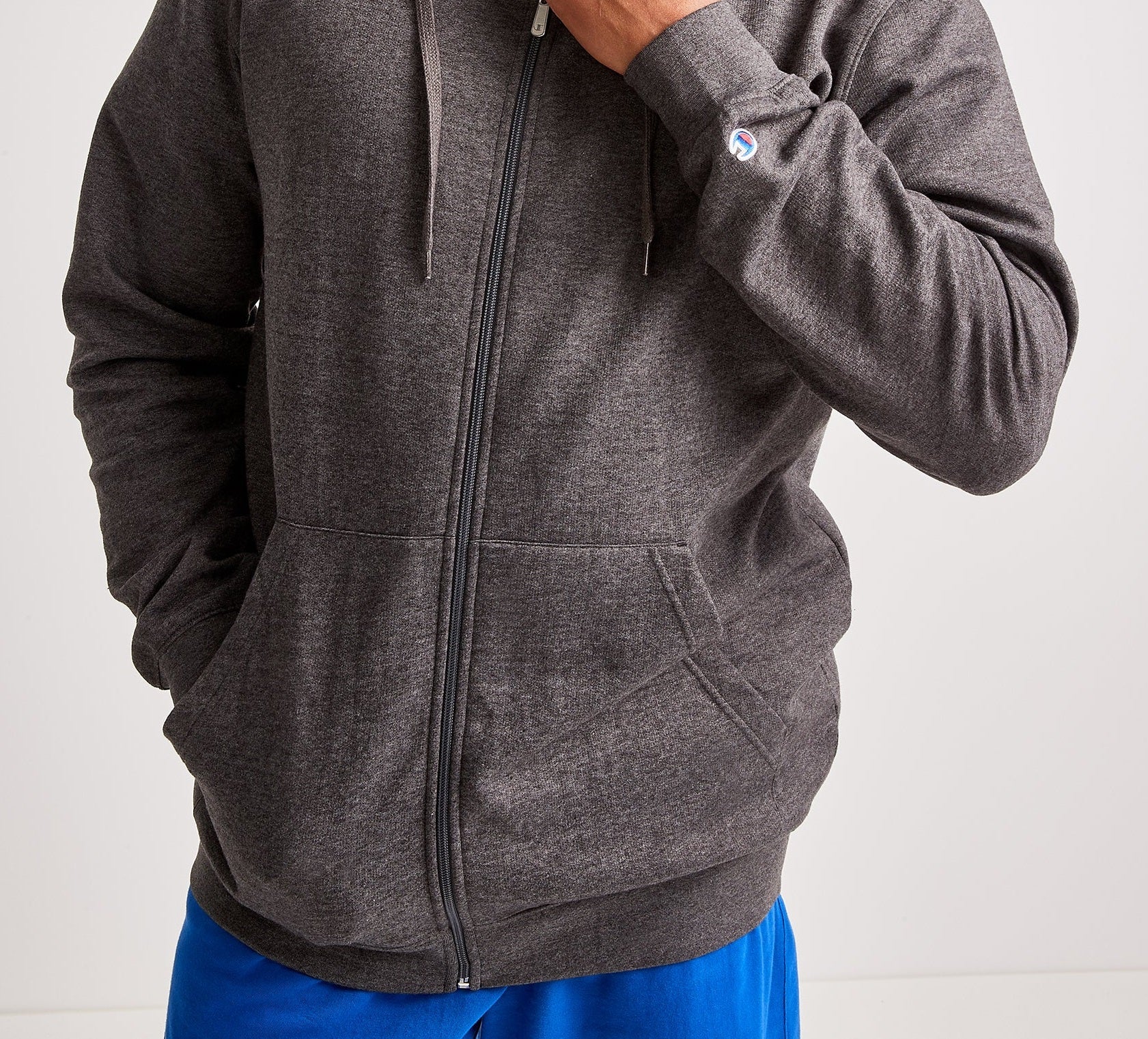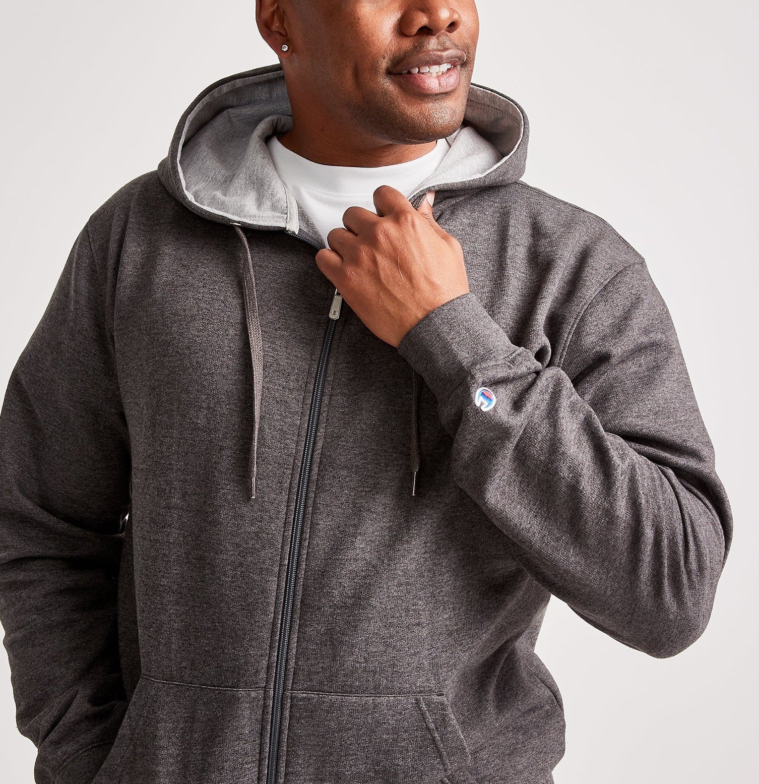 ZIP HOODIE MADE FOR LAYERING Available in sizes up to 6XL Big and 4XLT Tall| our fleece Full Zip Hoodie is ready to layer over a tee or tank and keeps you going from the gym to whatever's next| Exceptionally soft hoodie resists pilling and shrinking| so it keeps its great fit| Cotton-rich fleece is brushed inside for warmth without the extra weight| Finished with a double-lined hood| metal zip front and hand-warming pouch pockets