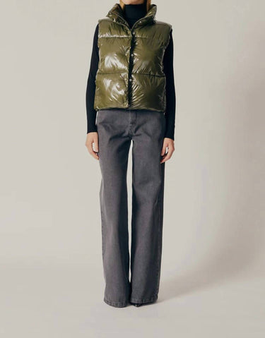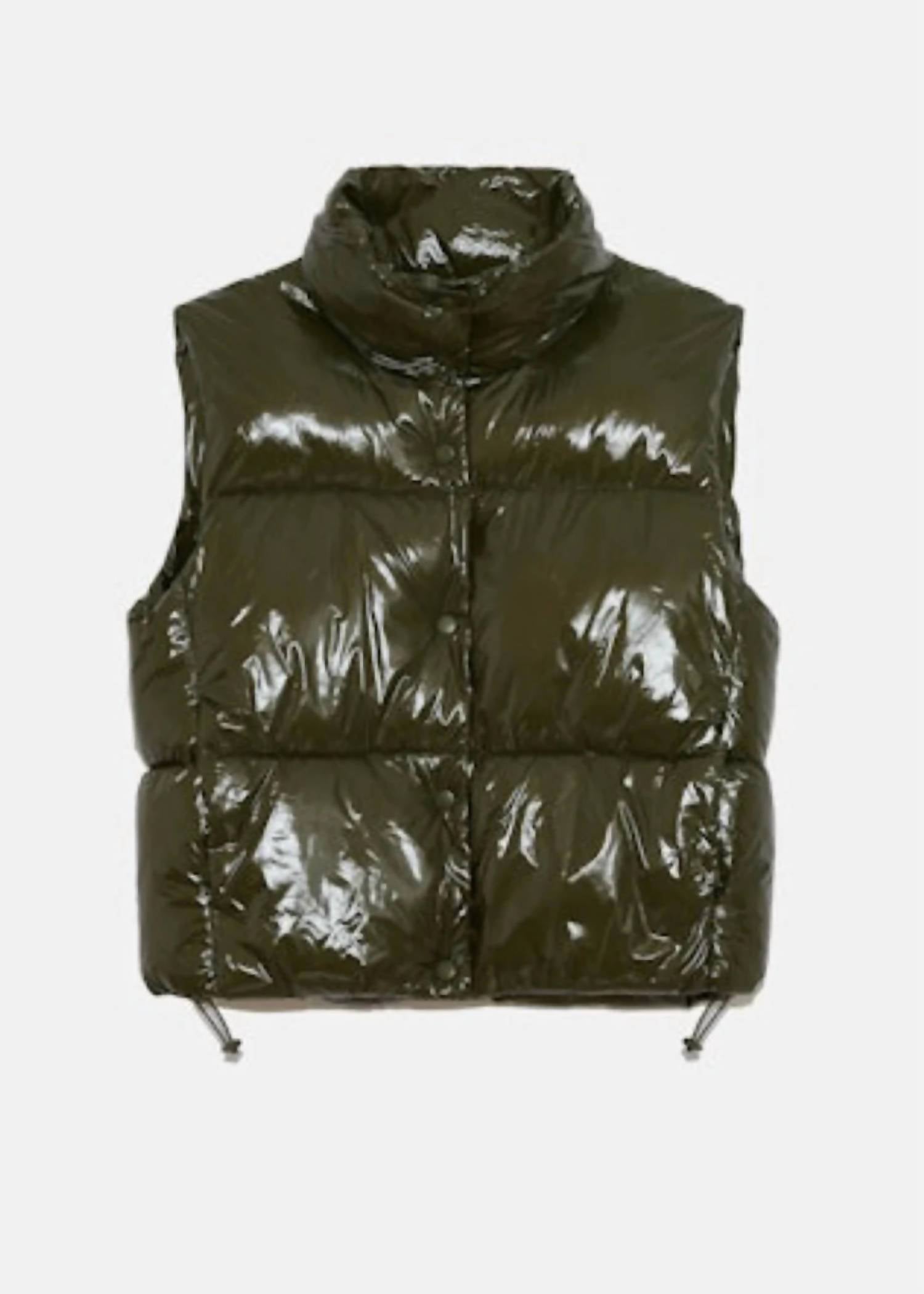 Introducing the Marmi Puffer Vest by DELUC, a chic layer in eye-catching Army Green, perfect for a stylish Scandi-inspired fall vacation. This sleeveless vest is crafted from 100% Nylon with a 100% Polyester lining, providing a luxurious liquid-like finish. It features a high neck collar and convenient front in-seam pockets, while the front snaps and zip closure ensure a comfortable fit. With an adjustable hem, this puffer vest offers functional style and true versatility in your wardrobe, available in size S for those 5'9" or similar in stature.