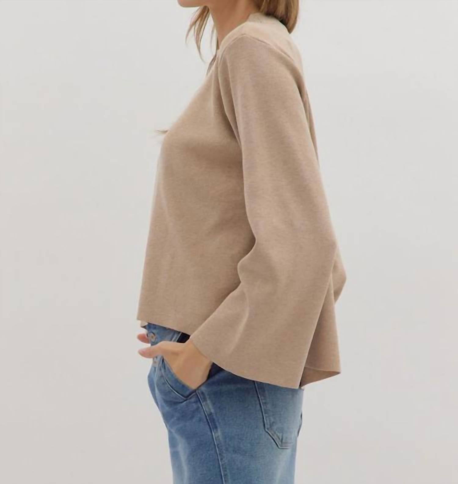 Elevate your winter wardrobe with the Bell Sleeve Mock Neck Sweater by Entro, featuring long sleeves and a chic mock neckline. This textured oatmeal cardigan is composed of 54% Polyester, 20% Nylon, 20% Acrylic, and 6% Wool, perfect for those minimalist moments. Offering a cozy minimalist trend with a pull-on closure, this sweater is perfect for Thanksgiving engagements and more. Care instructions include hand washing to maintain its elegant structure.