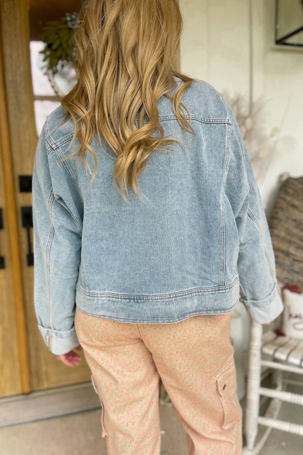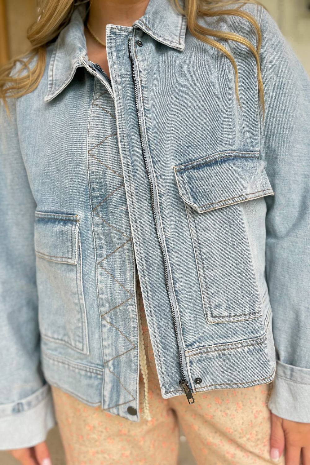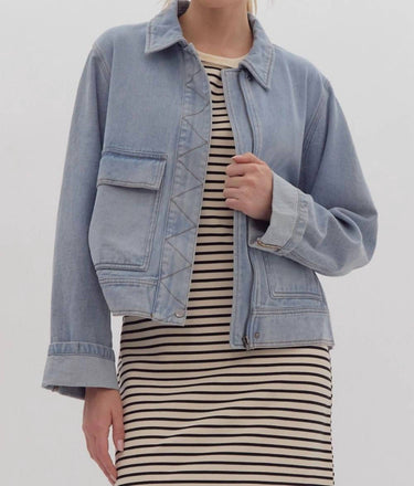 Embrace the denim trend with Entro's Denim Zip Front Jacket in a solid denim blue hue, perfect for women's casual styling. The jacket features long sleeves, a classic collar, and a practical zip closure, complemented by oversized pockets for added utility. Made from lightweight cotton, this unlined and non-sheer woven jacket offers comfort and ease.