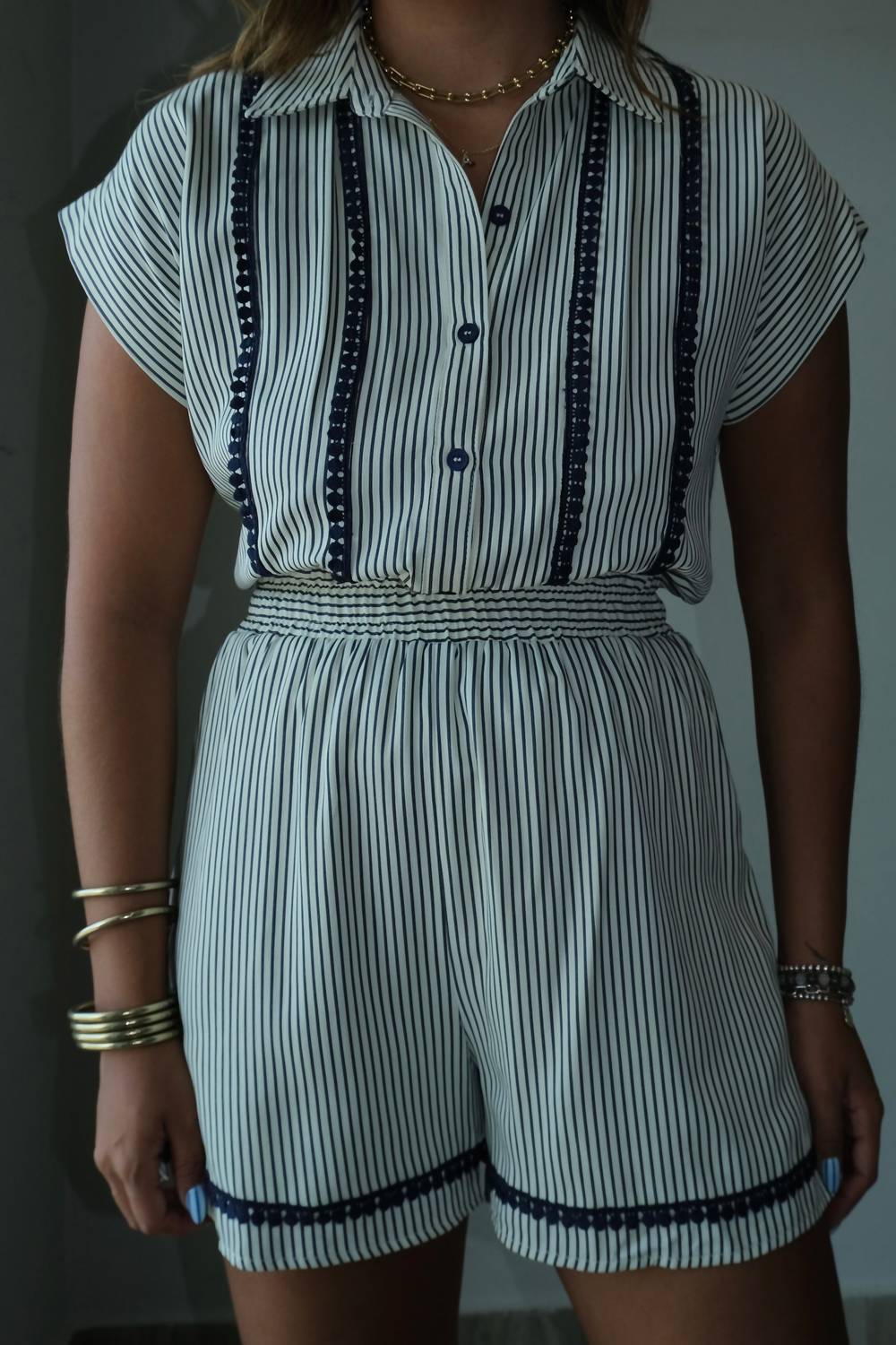 The Elise Romper by Entro is a playful and chic addition to your summer wardrobe, perfect for vacations or casual outings. Crafted from 90% polyester and 10% cotton, this indigo striped romper features short sleeves and a flattering elasticated waistband. Its button closure and classic collared neckline provide timeless charm, while the accented pom pom trims add a flirty touch. For care, hand wash cold and line dry.