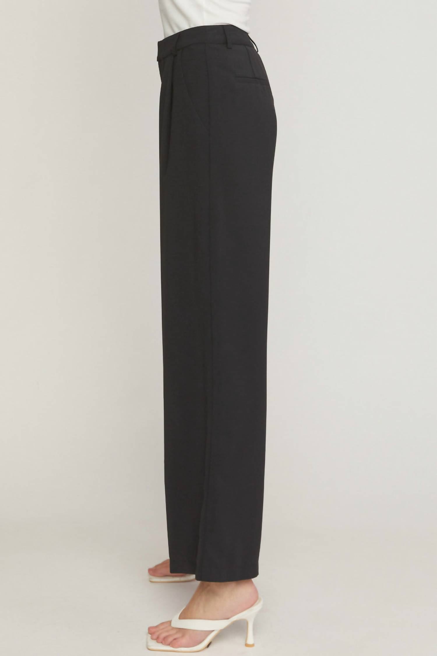 Solid High Waisted Pant In Black. A Wide Leg. With Zipper Front Closure. Front Pleat. Pockets At Sides. Belt Loops. Unlined. Woven. Non-Sheer. Lightweight. 100% Polyester.