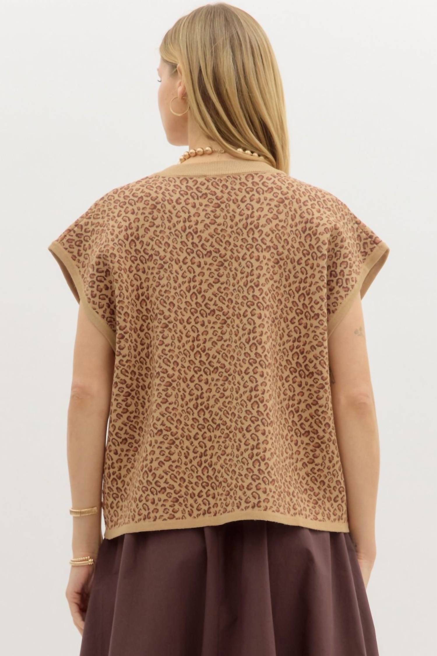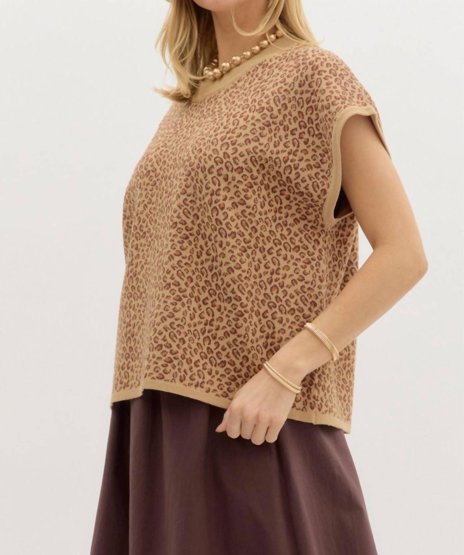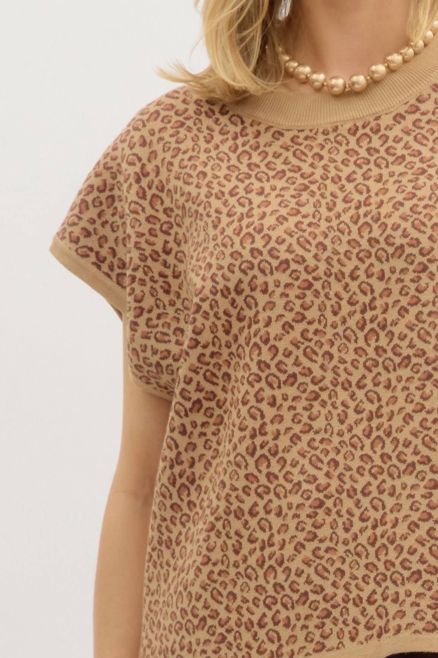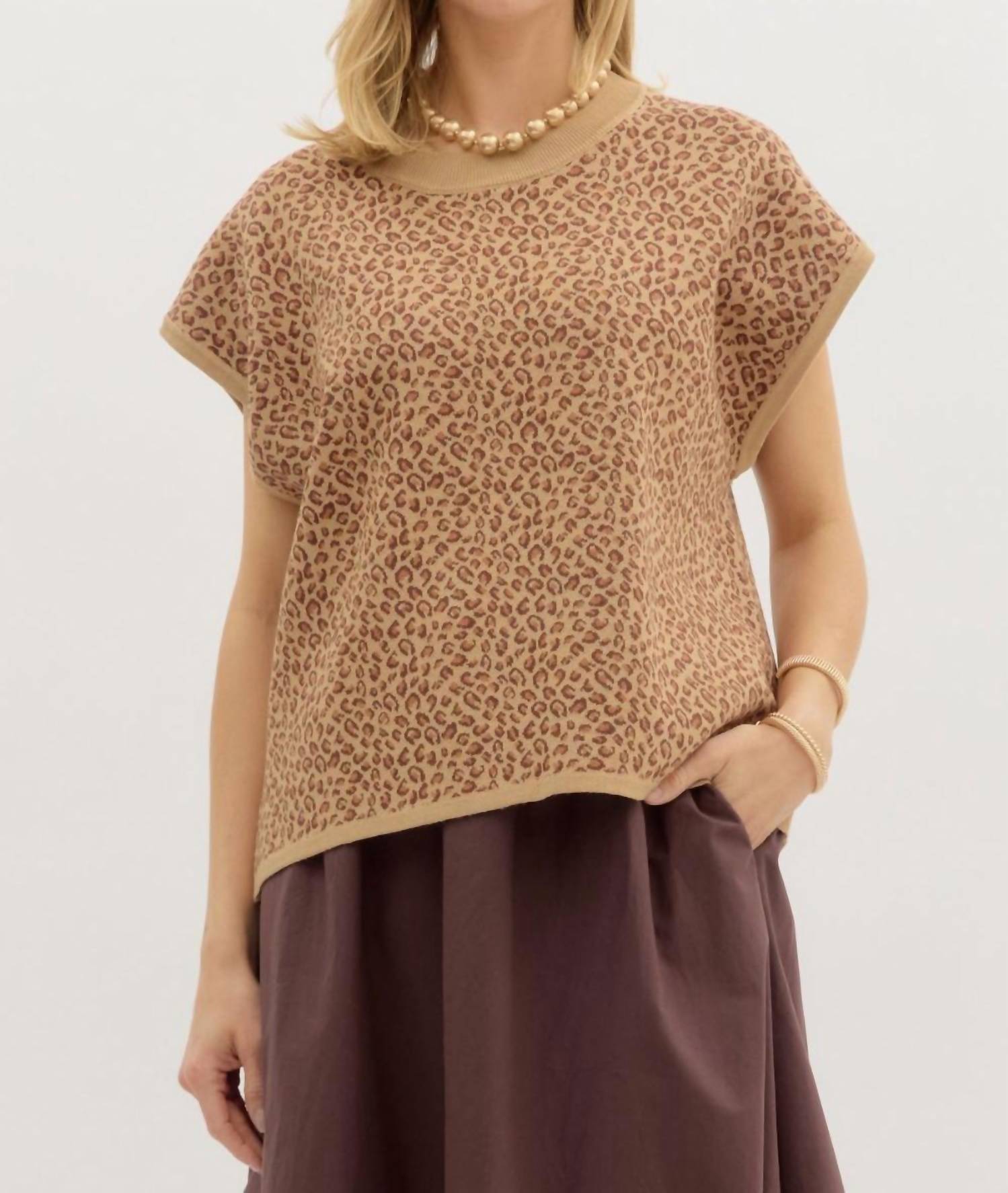 Elevate your fall wardrobe with the Leopard Muscle Sleeve Sweater by Entro, a maximalist crewneck pullover in a chic camel hue. Crafted from a comfortable 90% Viscose and 10% Spandex blend, this short-sleeve design features a striking animal pattern, making it an ideal choice for dinner parties. This women's sweater offers a stylish pull-on closure. Care instructions: Machine wash for easy maintenance.