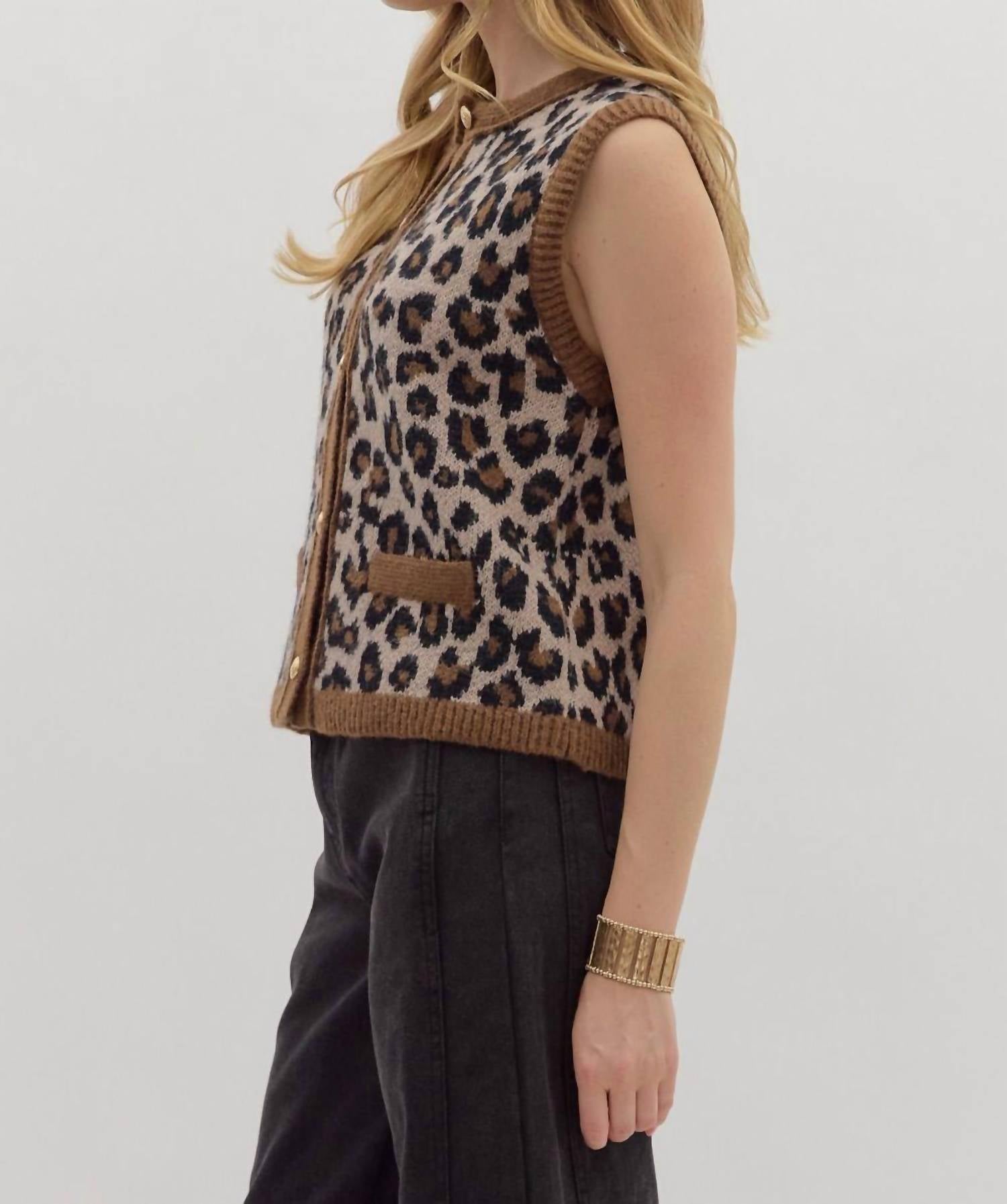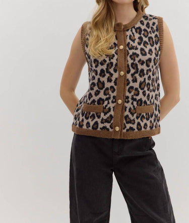 Introducing the Leopard Sweater Vest by Entro, a bold statement piece perfect for any dinner party. This sleeveless vest features a striking animal pattern in a brown multi-colorway, complemented by gold accent button closure. Crafted from a blend of 45% Polyester, 45% Nylon, and 10% Wool, it offers a luxurious feel ideal for spring gatherings. Care instructions: Machine wash.