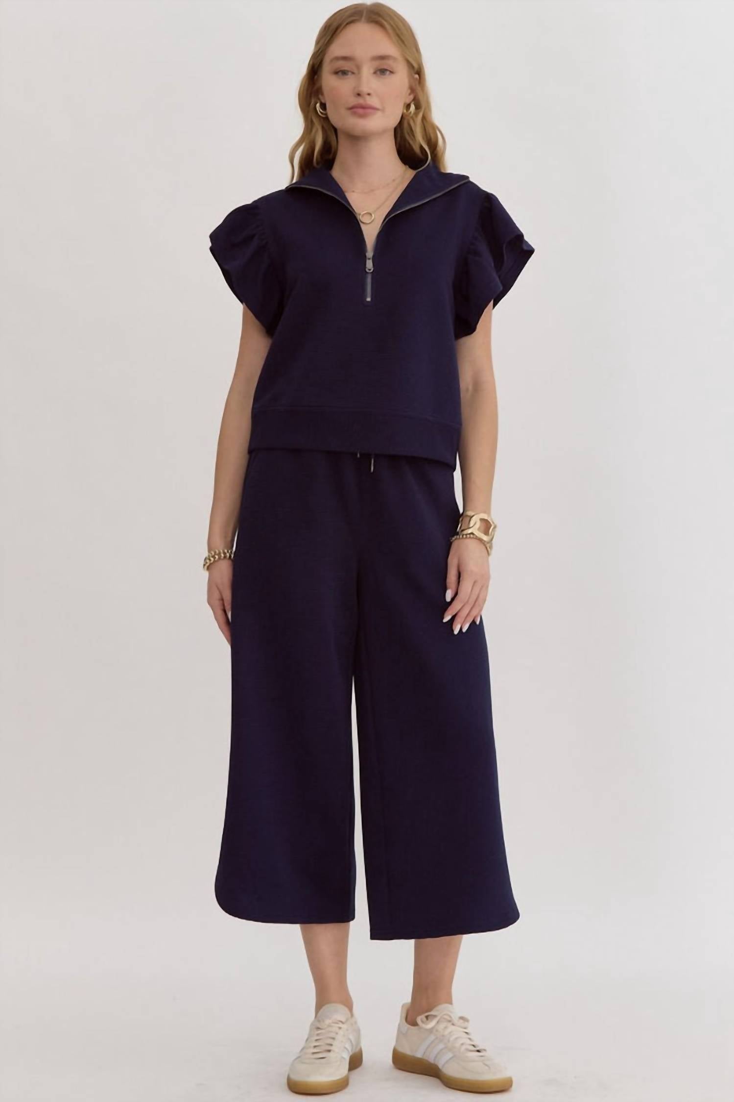 Elevate your wardrobe with the "Looking Ahead Wide Leg Pants" by Entro, designed for both style and comfort. These navy blue knit textured pants feature a flattering high-rise and wide-leg fit, complete with an asymmetrical hem and side pockets. 95% Polyester, 5% Spandex. Elastic waist with working drawstring. Machine wash. Ideal for plus-size fashionistas, these medium-weight pants are perfect for any occasion.