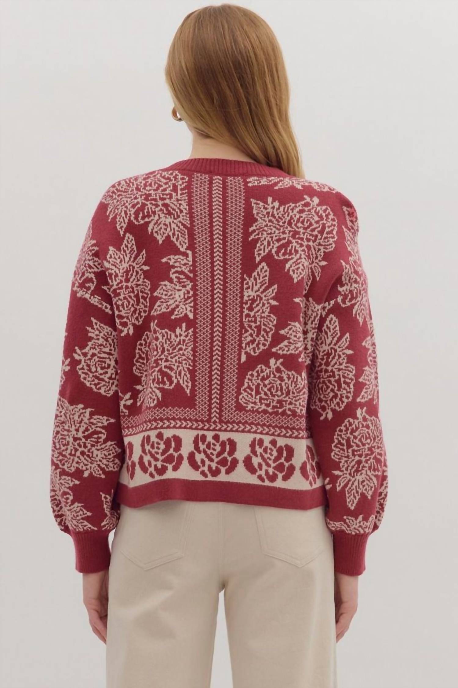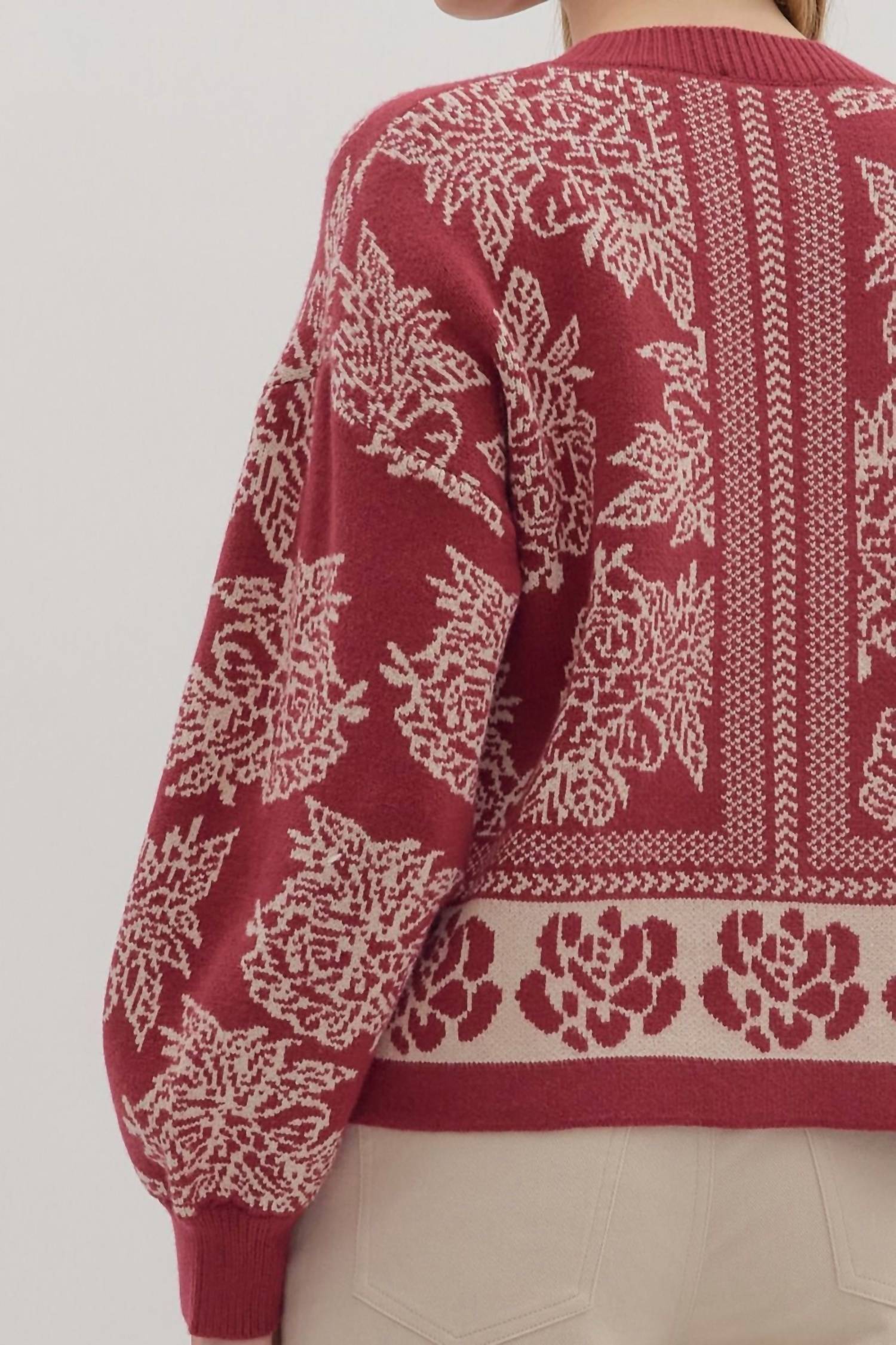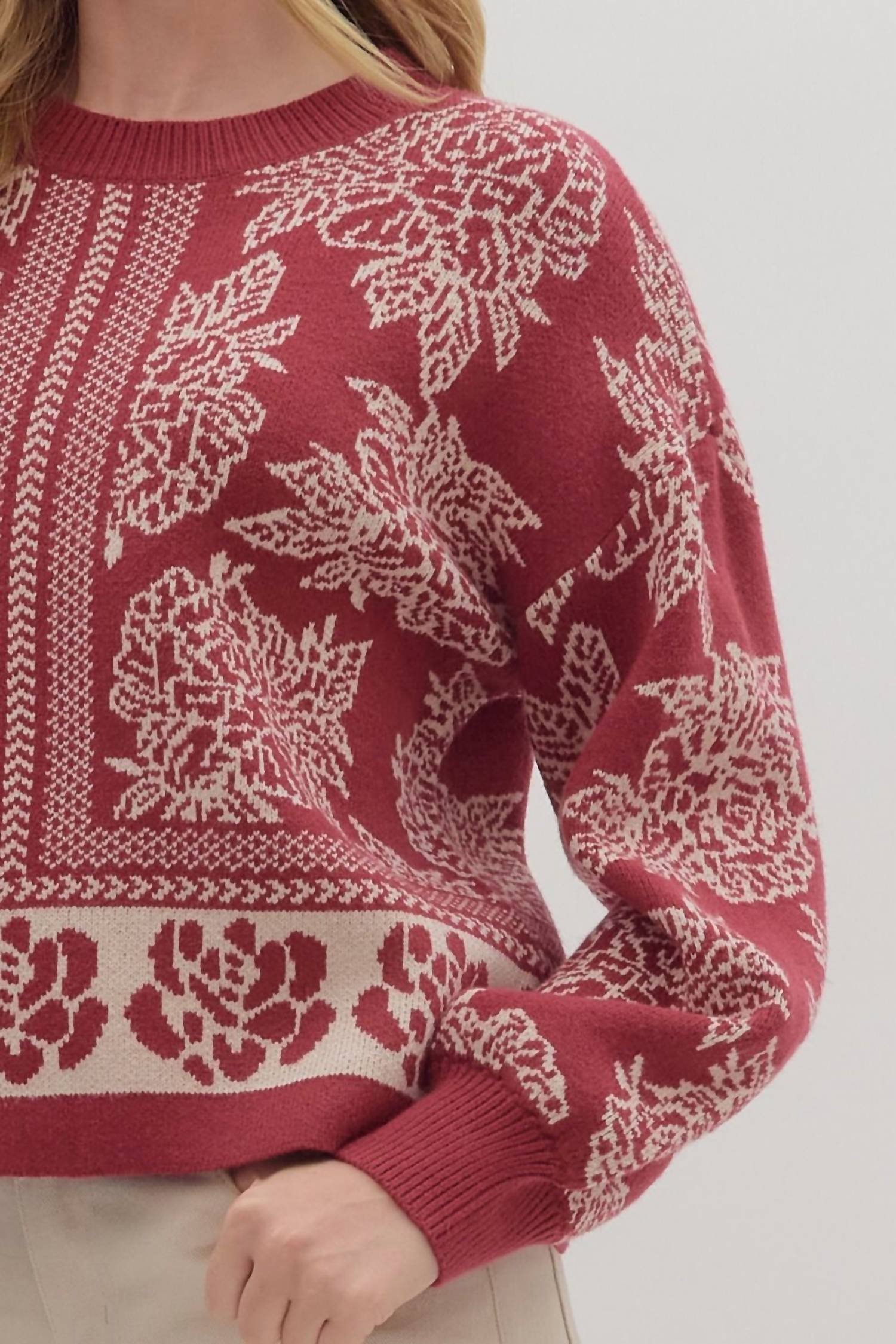 This pullover sweater features a floral jacquard design, long sleeves, and a ribbed neckline and cuffs. It is made of 50% viscose, 28% polyester, and 22% nylon, and fits true to size.