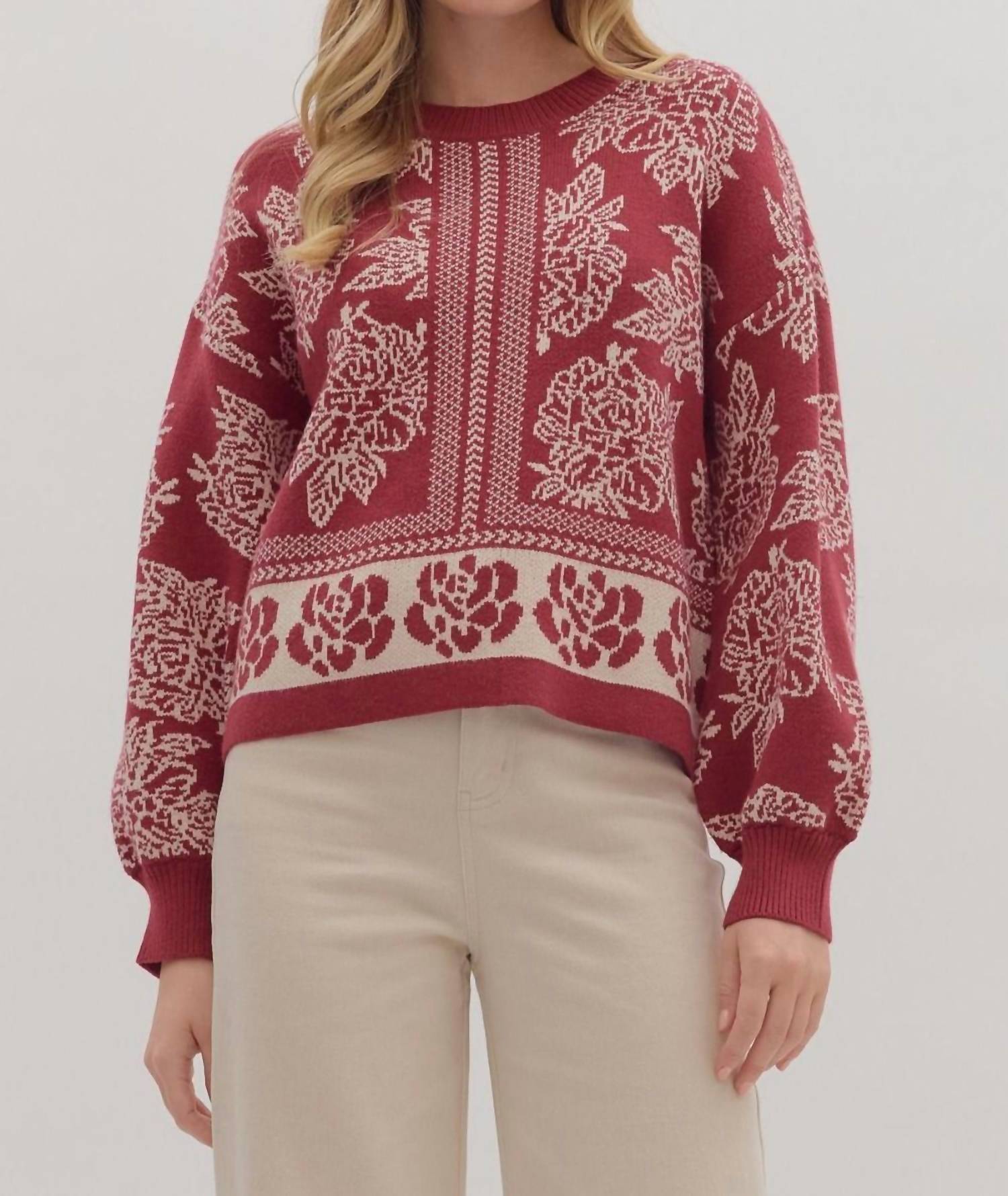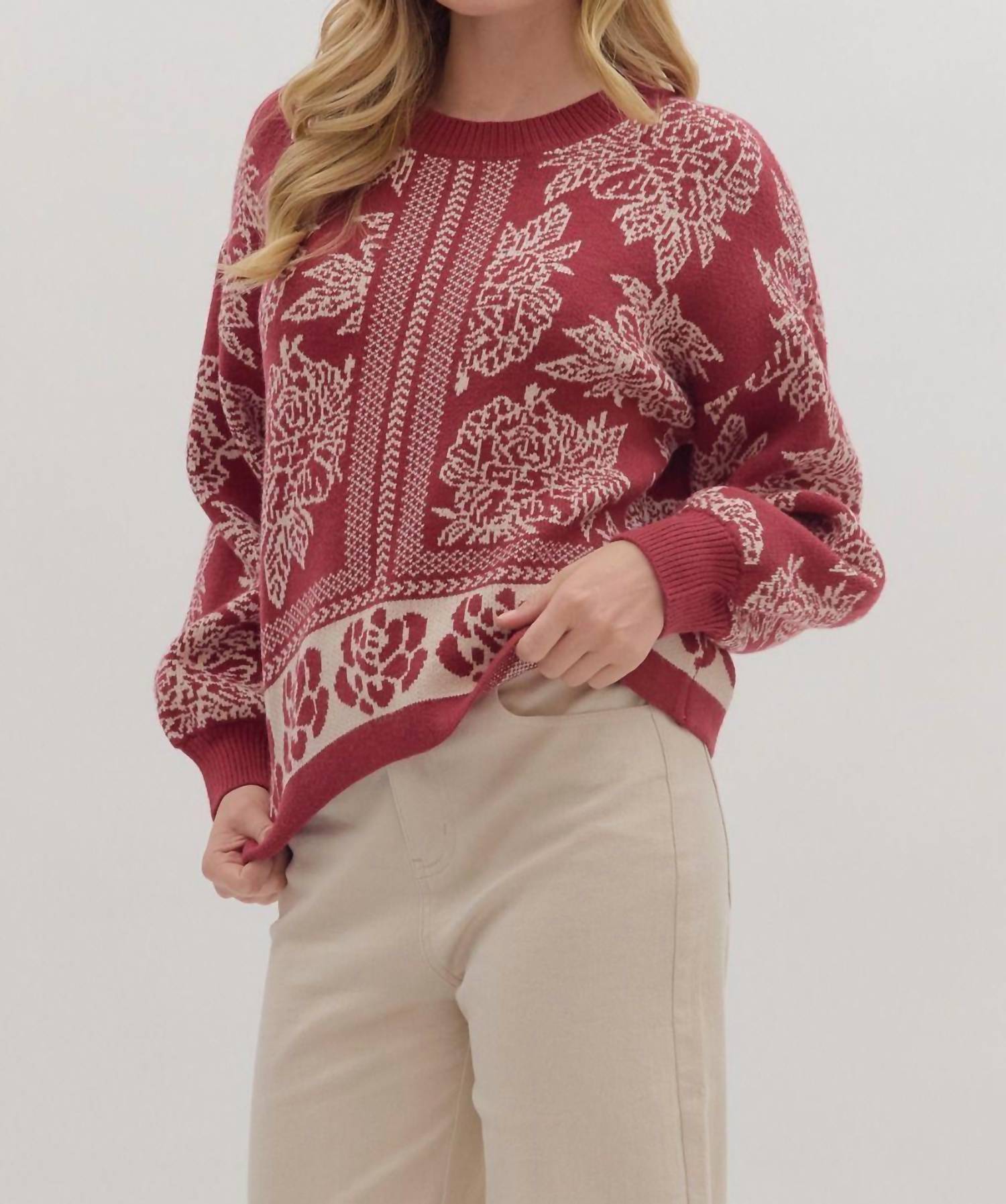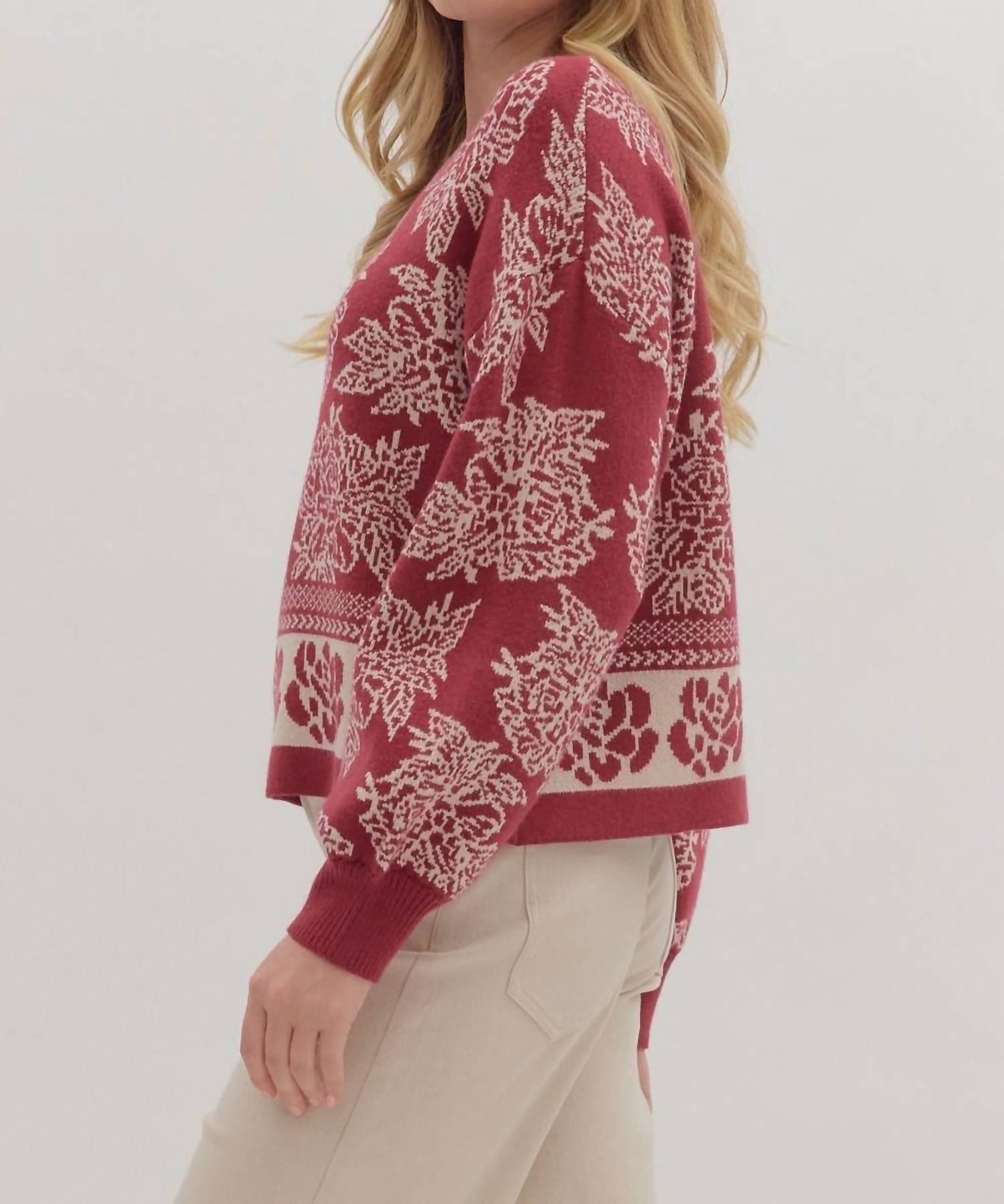 This pullover sweater features a floral jacquard design, long sleeves, and a ribbed neckline and cuffs. It is made of 50% viscose, 28% polyester, and 22% nylon, and fits true to size.
