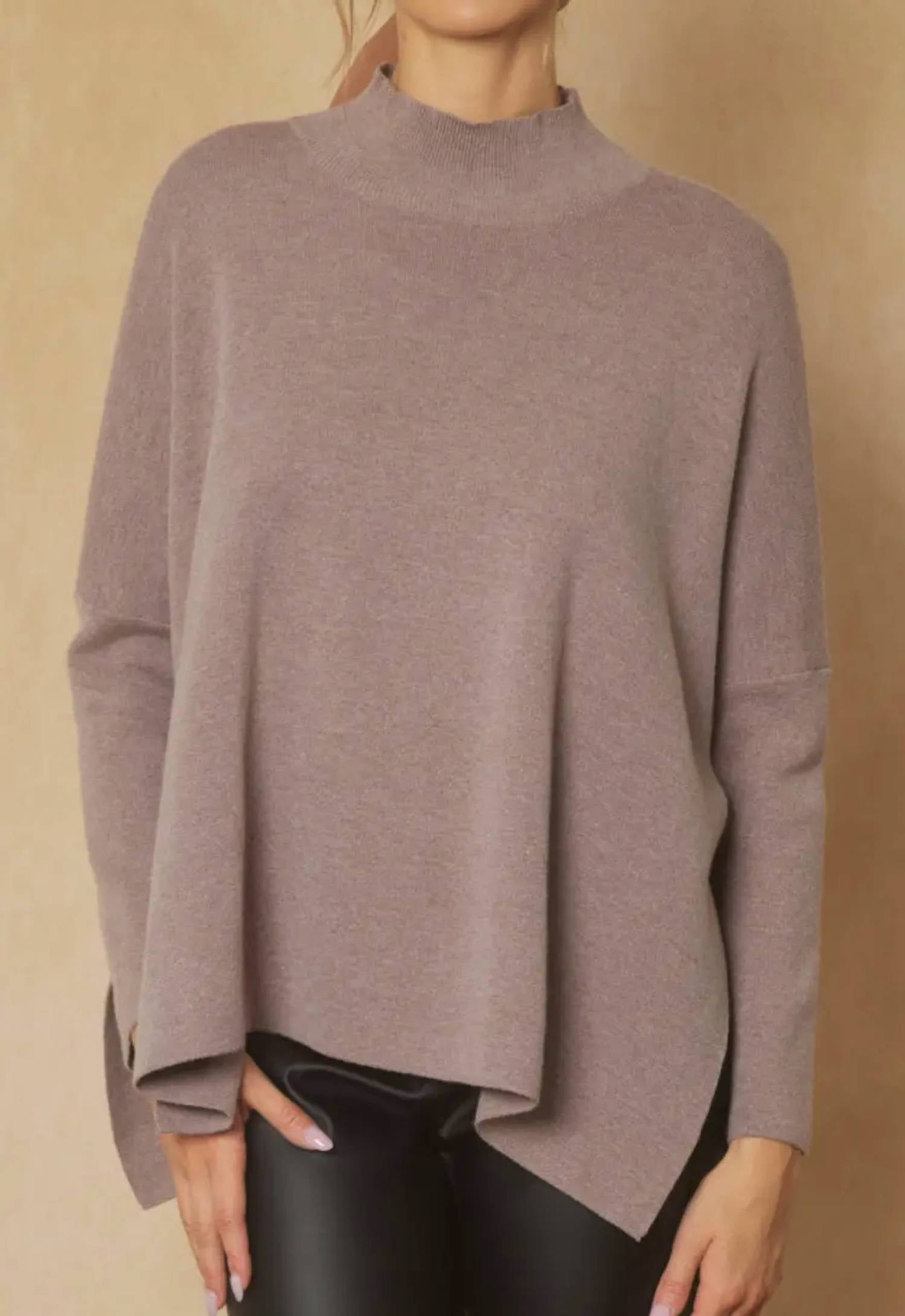 Elevate your fall wardrobe with the Entro Mock Neck Sweater, a minimalist piece in a solid mocha shade designed for stylish evening events. This women's top features elegant long sleeves and side slits for a modern touch. Closure: Pull on. Care: Hand wash only and lay flat to dry.