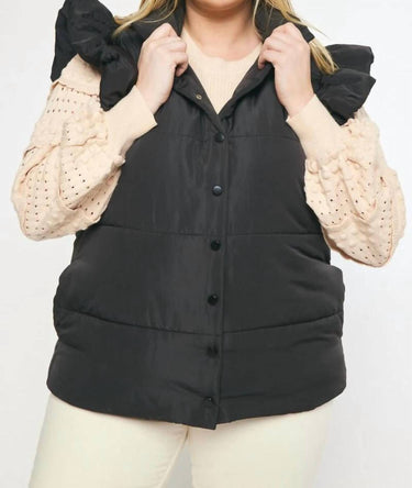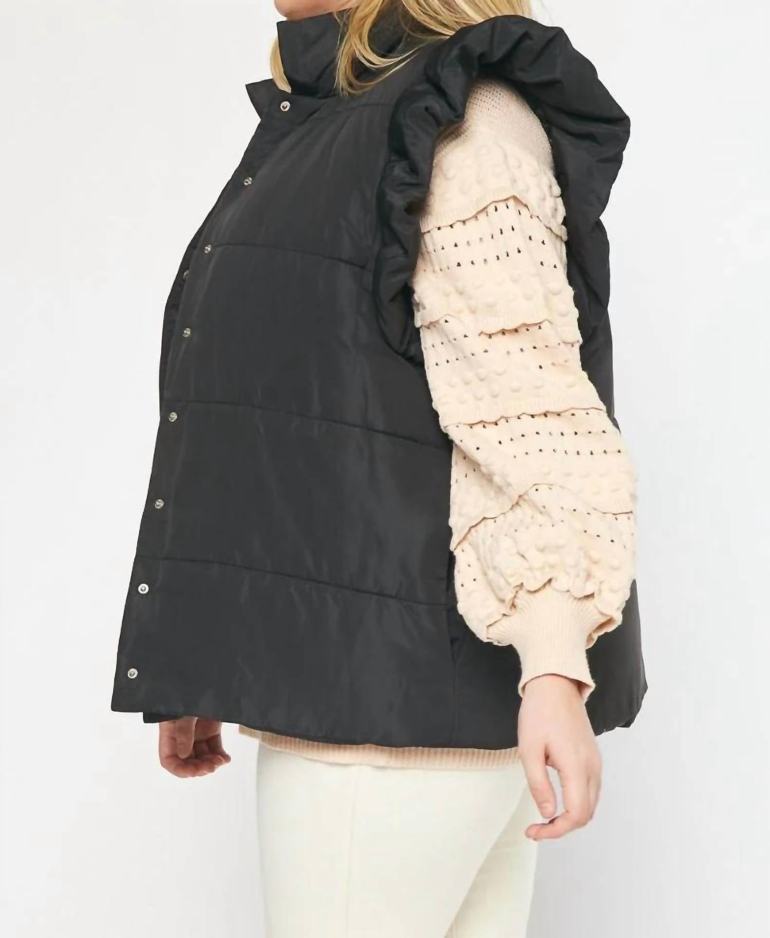 Introducing the Ruffle Puffer Vest by Entro, a stylish addition to your travel wardrobe in minimalist solid black. This vest features short sleeves and a collared neckline with a quilted ruffle detail on the shoulders for an elevated look. Its snap closure and convenient side pockets make it both functional and fashionable for the winter season. Perfectly lined for comfort, this vest pairs effortlessly with your favorite casual outfits.