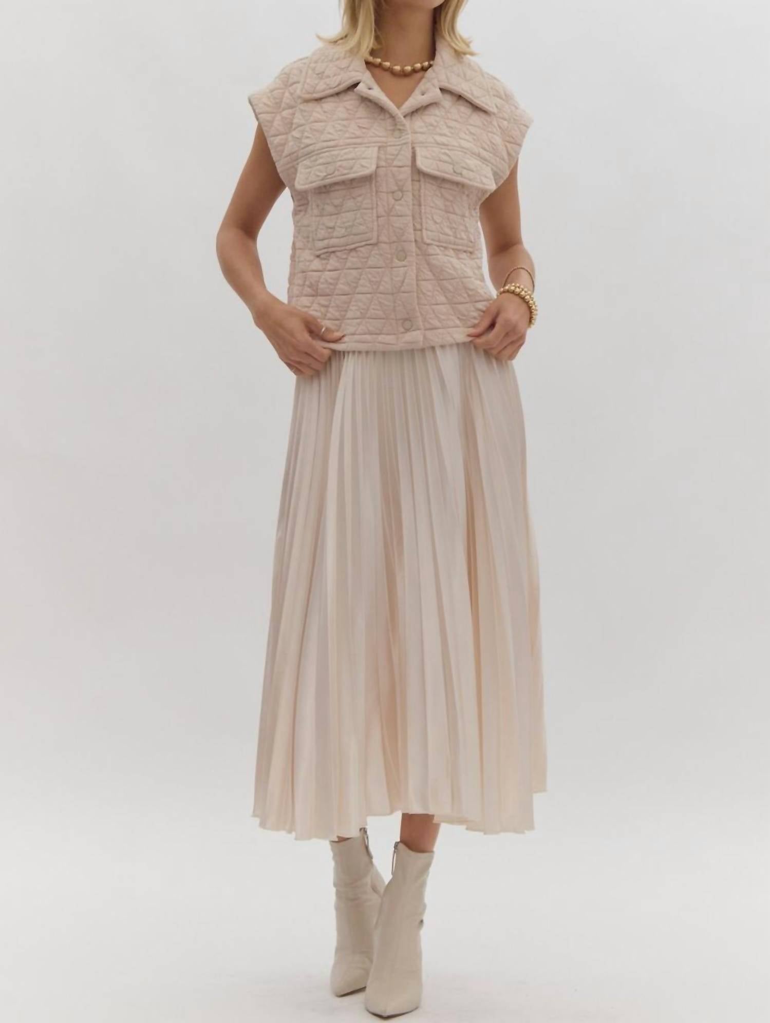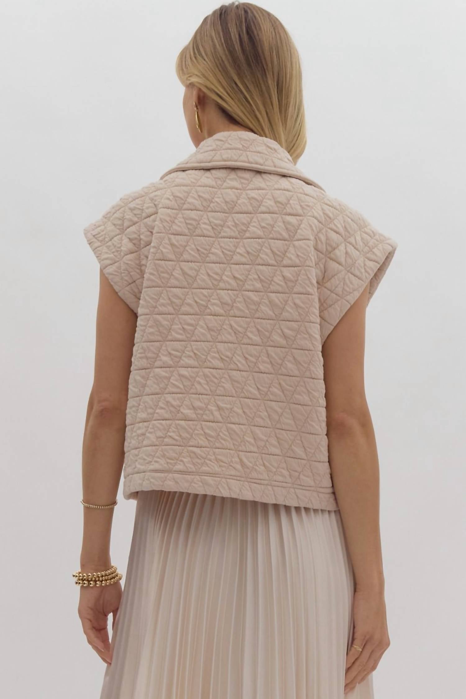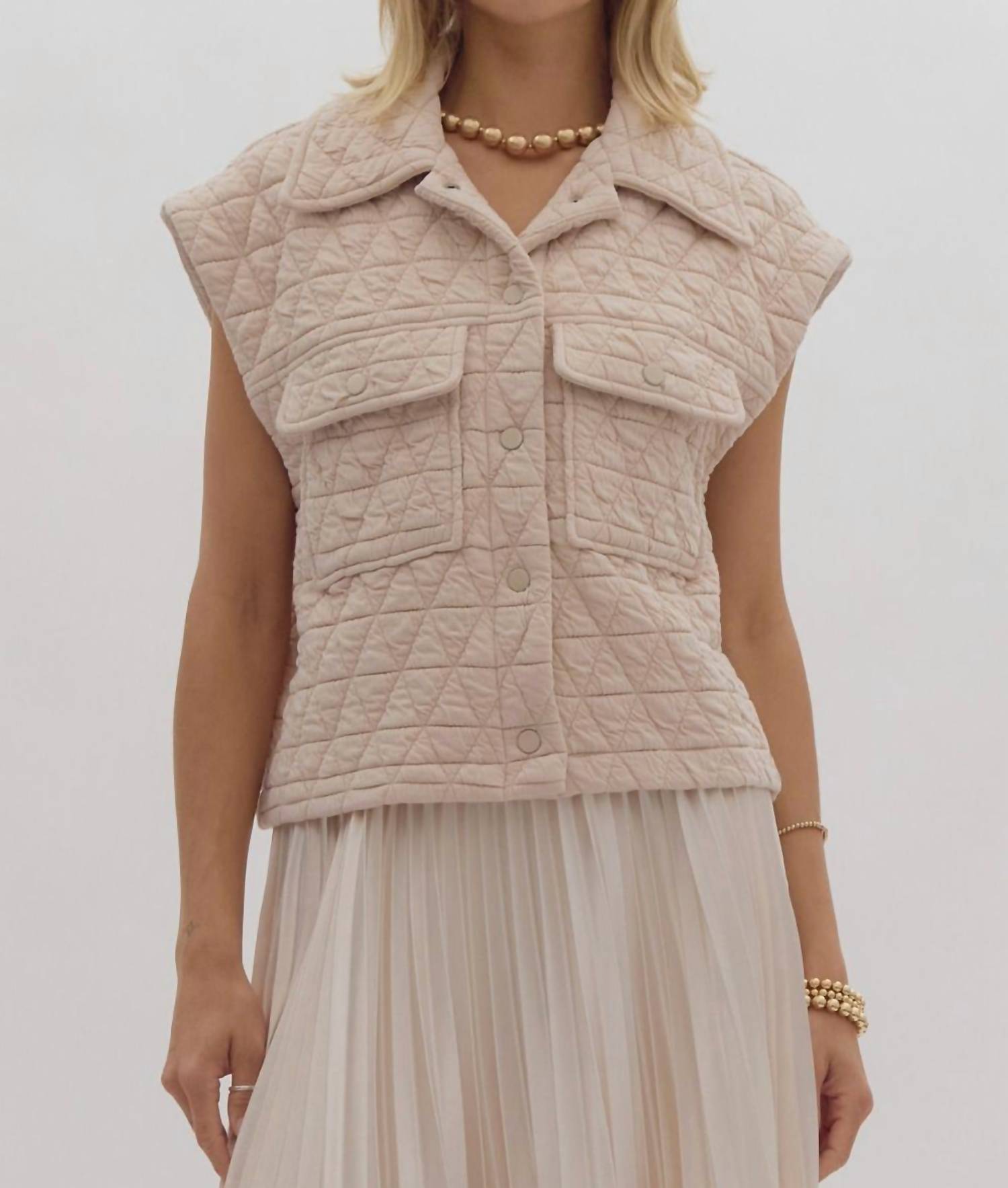 Introducing the Entro Soft Quilted Vest, designed with a minimalist textured pattern perfect for fall and Thanksgiving ensembles. This sleeveless, cotton-blend vest, composed of 95% Cotton and 5% Spandex, offers cozy comfort and versatility. Practical snap closures and a stylish collar neckline make it an excellent layering piece for travel or everyday wear. Care instructions: Machine wash and tumble dry for easy maintenance.