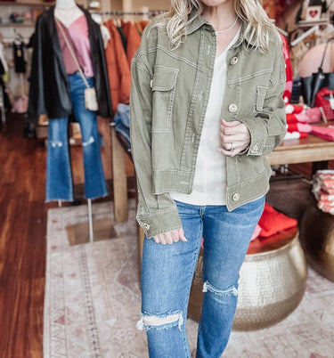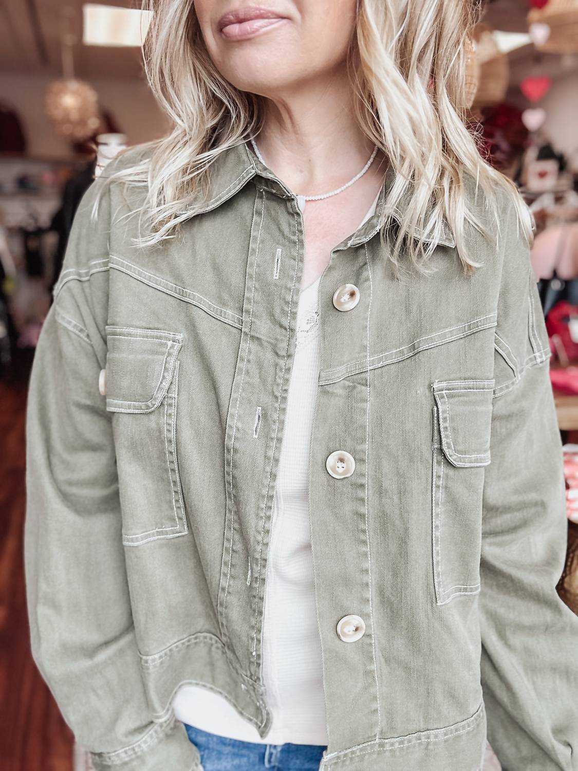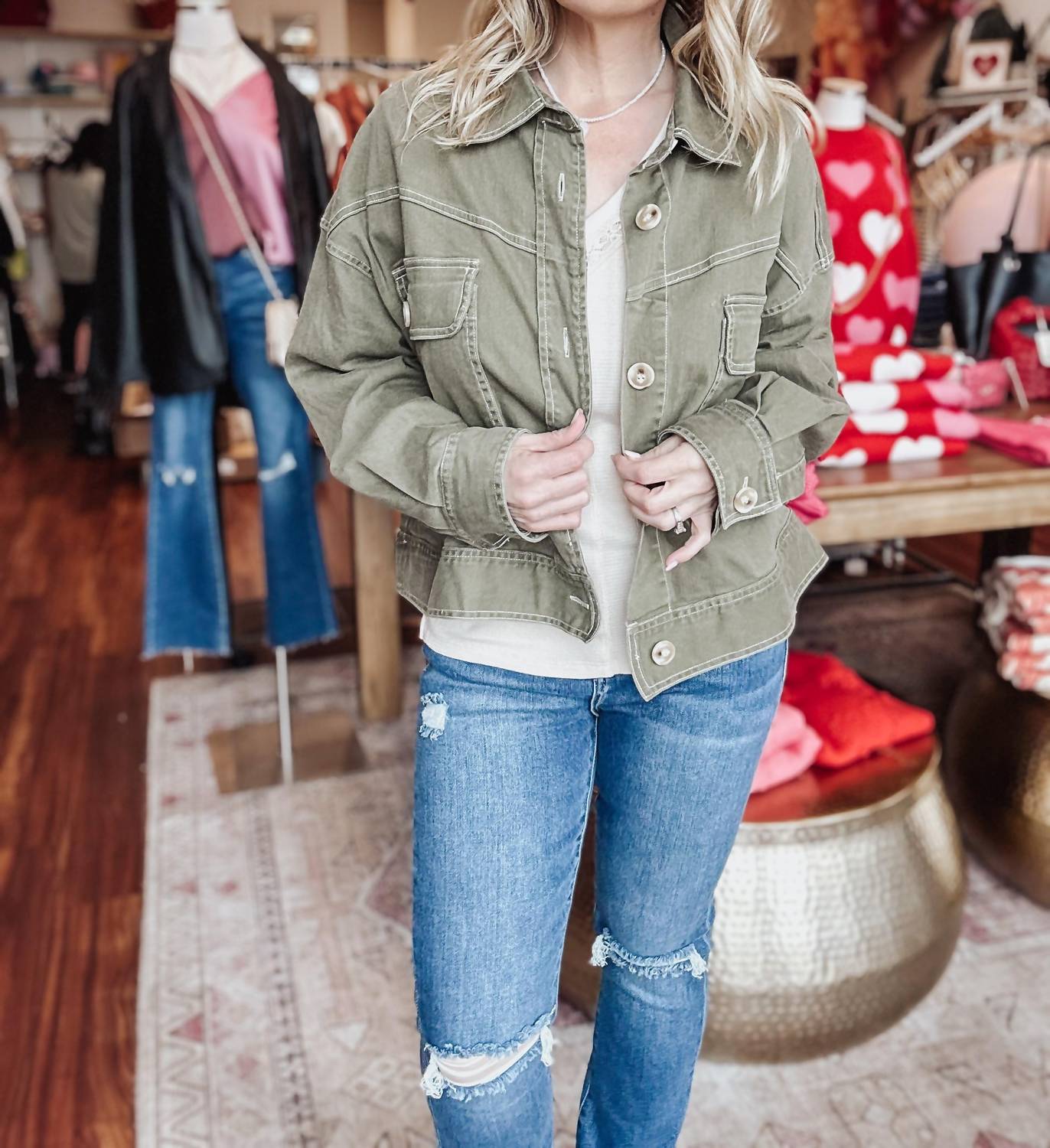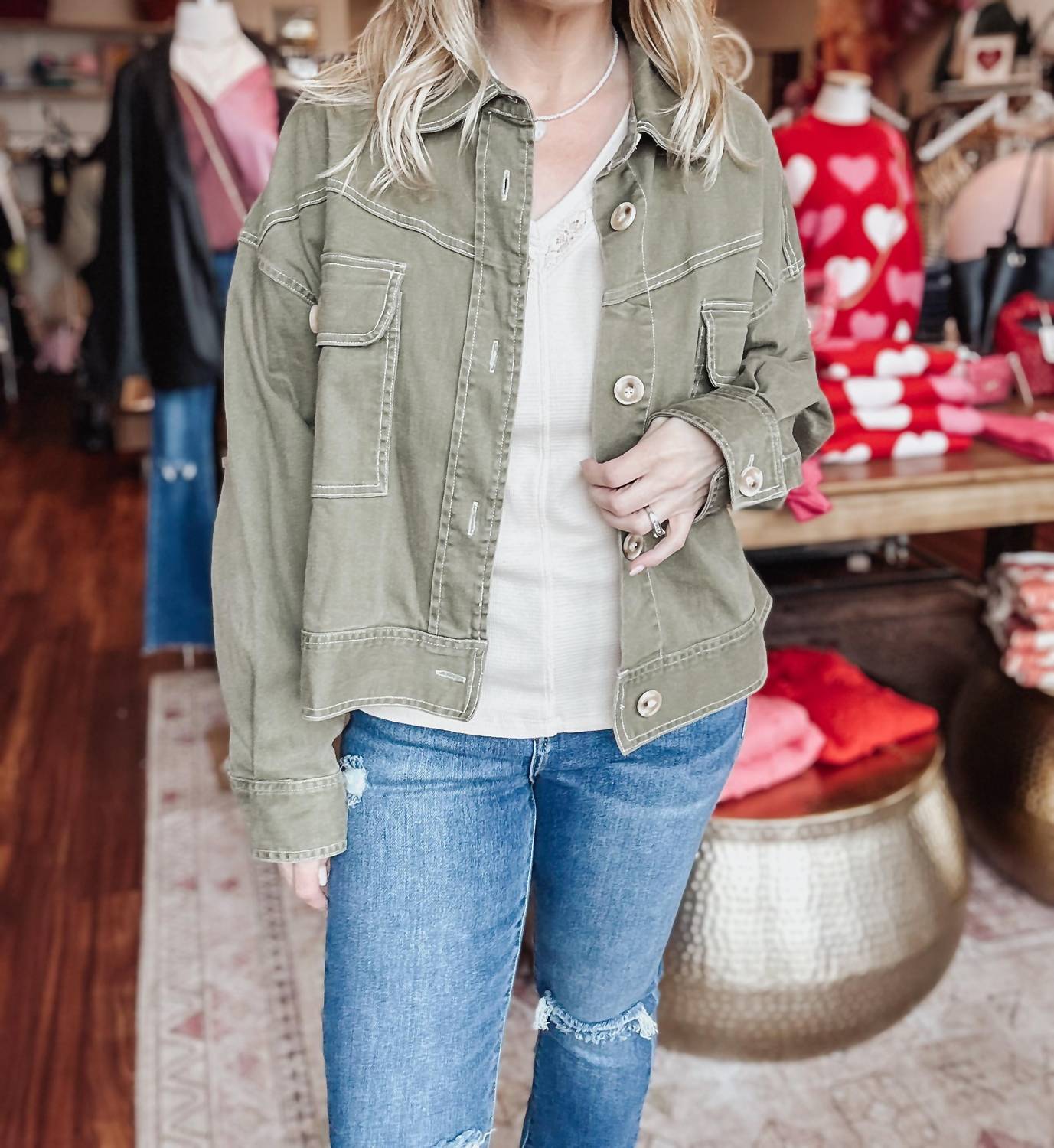 Introducing the Entero Throw And Go Jacket, a stylish and comfortable choice for women who love effortless fashion. With its long sleeves, this olive casual jacket is crafted from a 97% cotton, 3% spandex blend, ensuring a relaxed fit. Designed with oversized pockets and a button closure, this solid pattern jacket is perfect for spring travel. It features a classic collar neckline, elevating your wardrobe with ease.