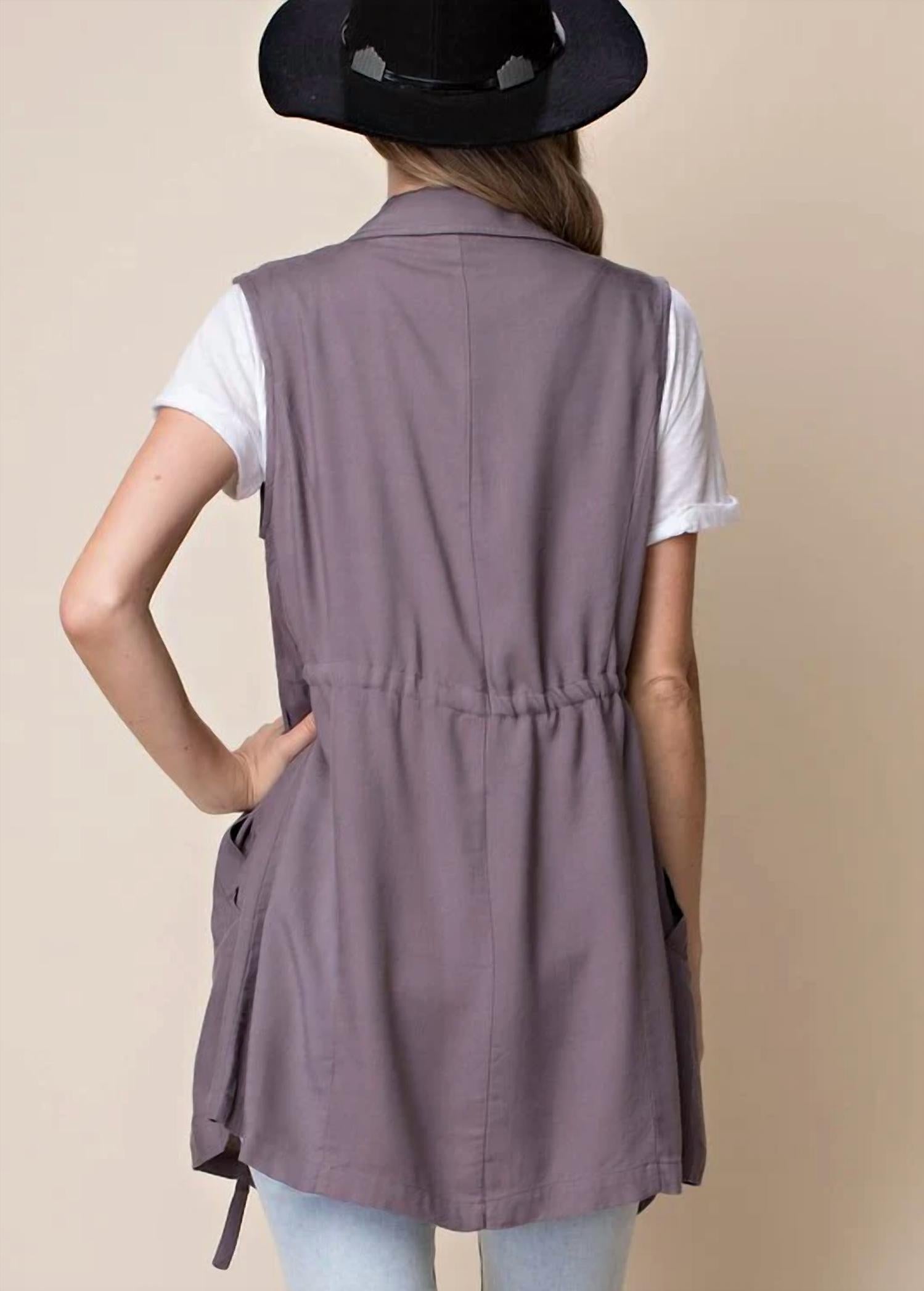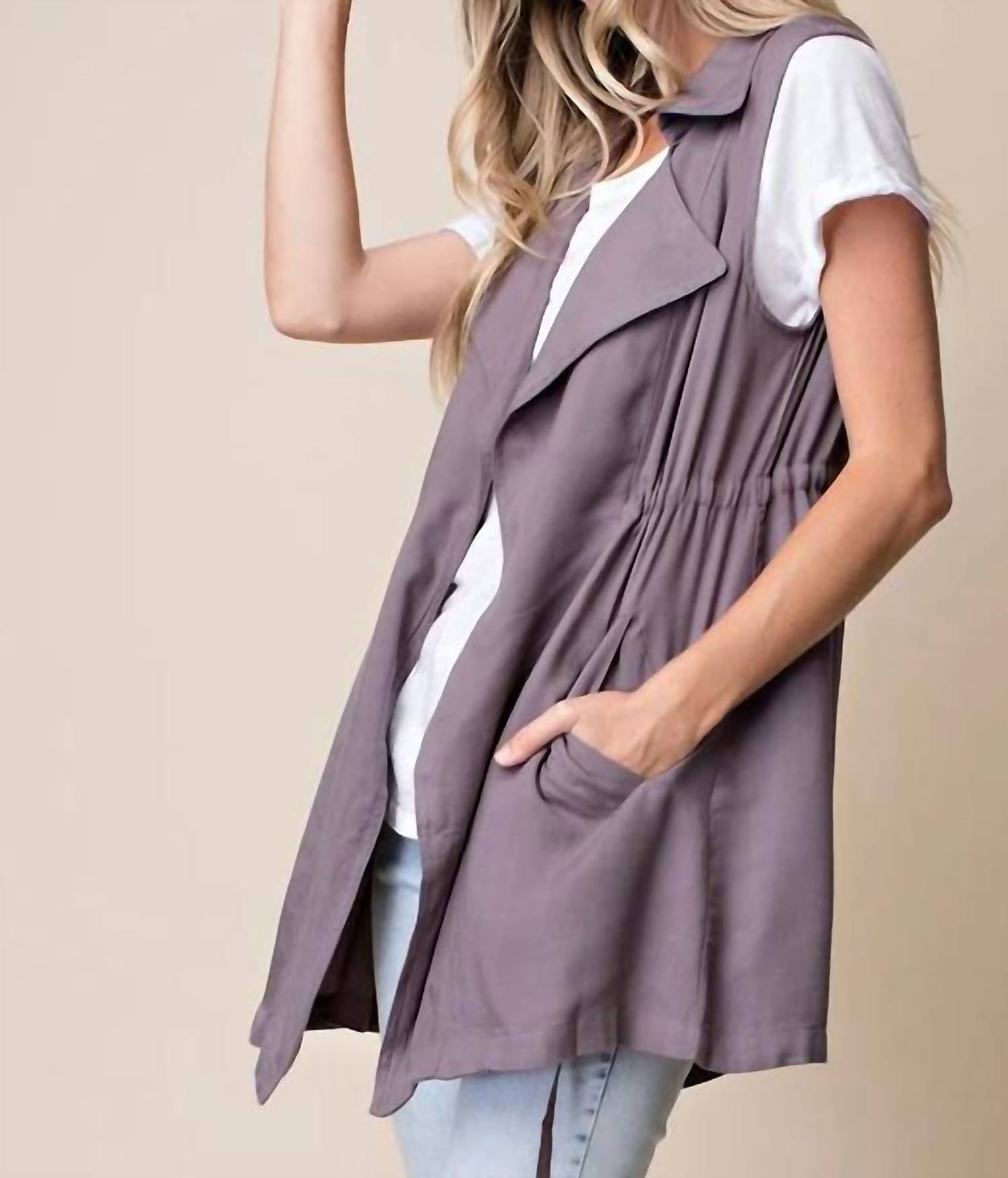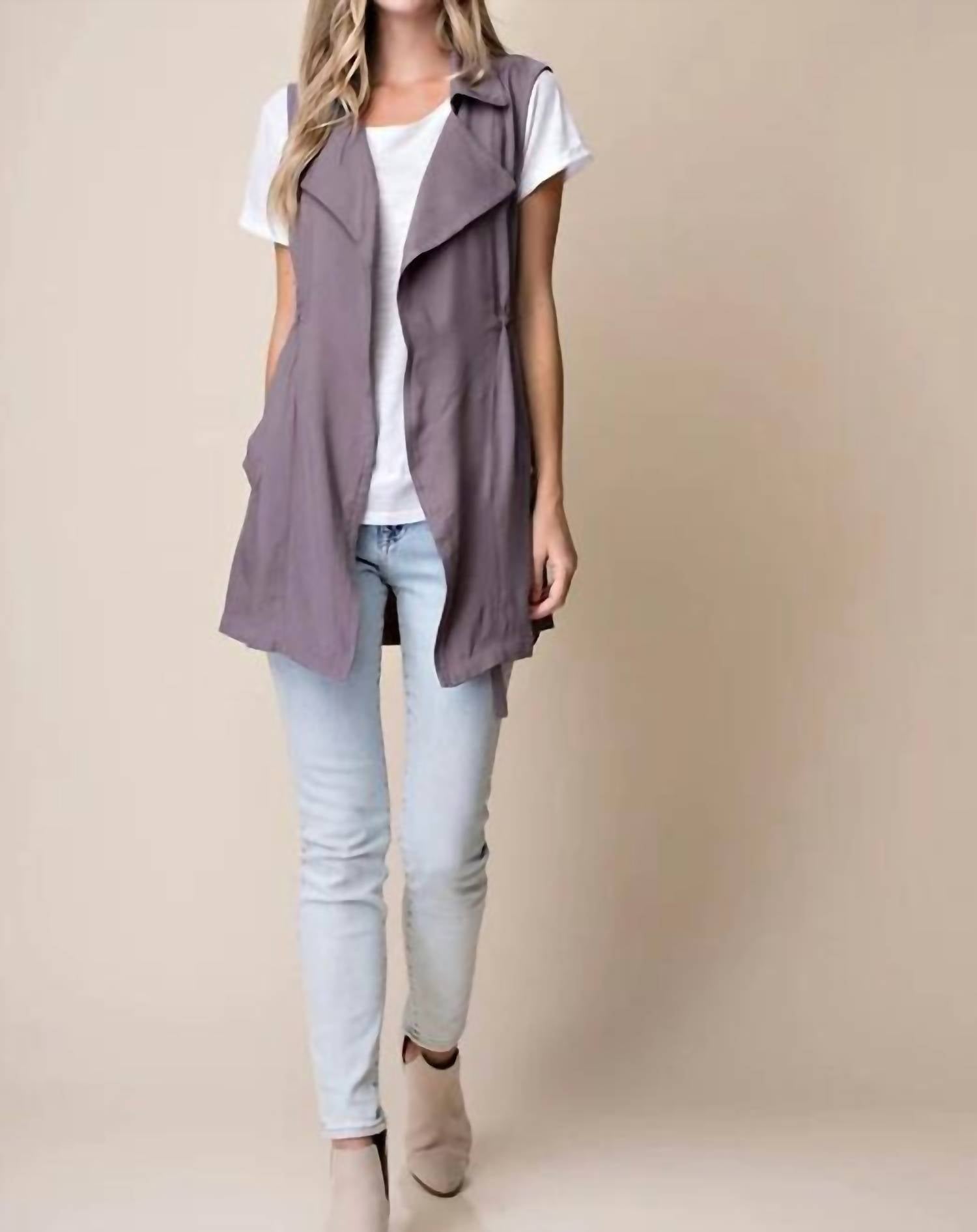 The Trench Dropped Lapel Vest by Entro in an elegant Ash color is a stylish addition to any wardrobe. Designed with a dropped lapel and a sophisticated collar, this sleeveless vest drapes effortlessly over your favorite top. Its pull-on closure makes it easy to wear, while the solid pattern ensures versatility for any outfit. A must-have for trendsetting women seeking a polished look.