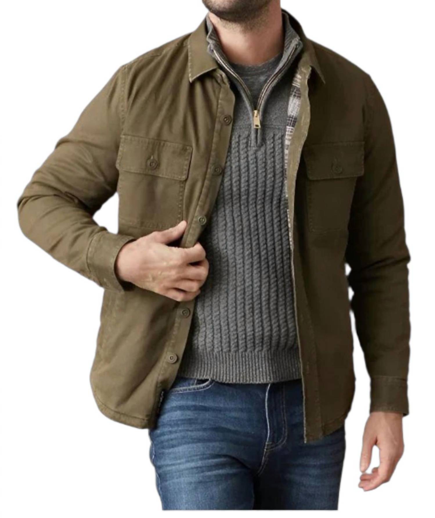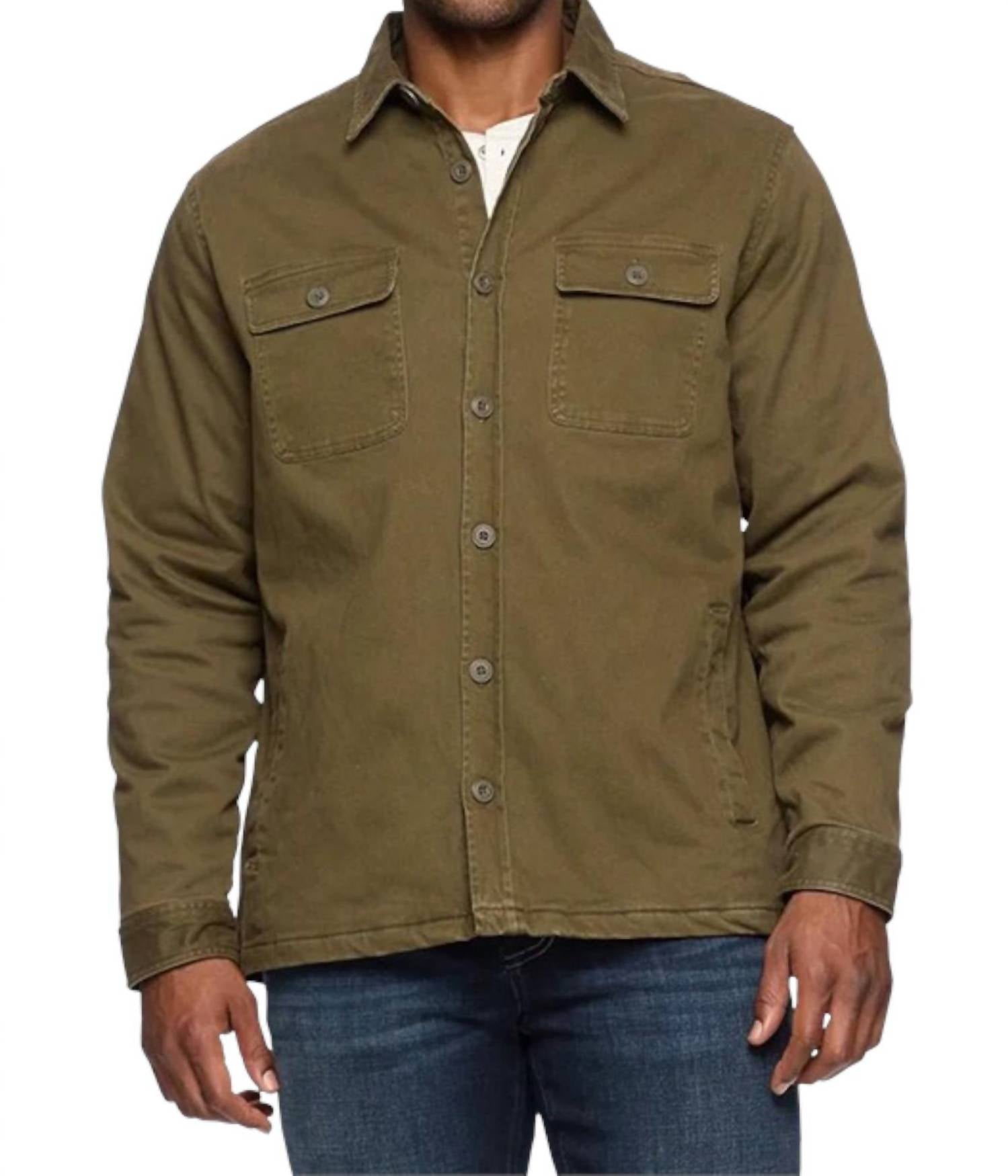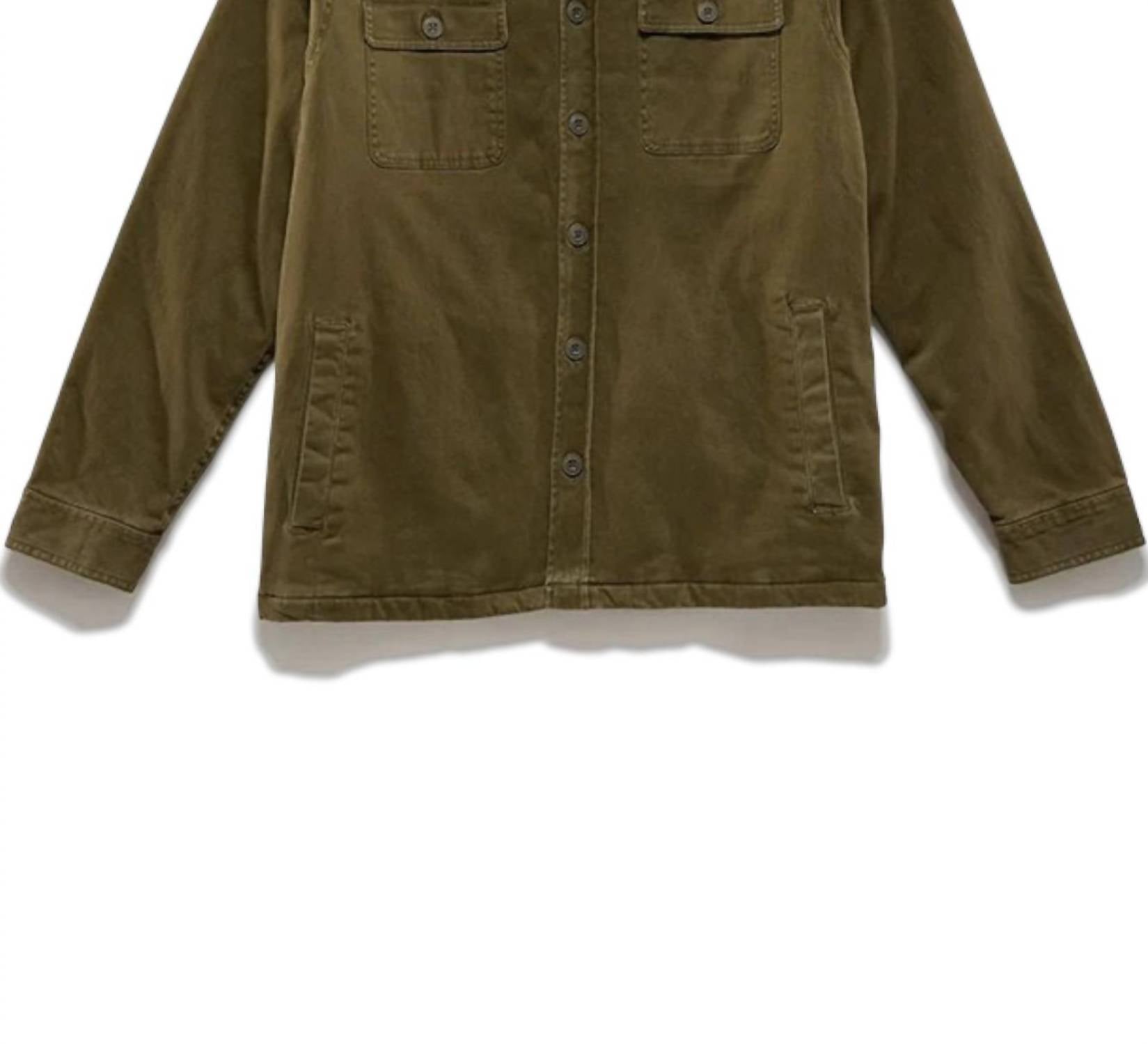 The Dunn Stretch Flannel Lined Shirt Jacket by Flags & Anthem is an essential addition to your layering wardrobe. This olive jacket features long sleeves and a classic shirt collar, combining the comfort of a shirt with the warmth of a jacket. Made from a durable cotton blend with a body composition of 98% Cotton and 2% Spandex, it includes dual front flap pockets and angled slit pockets for convenience. The jacket's closure is a button closure, and it offers a medium center back length of 29.5 inches.