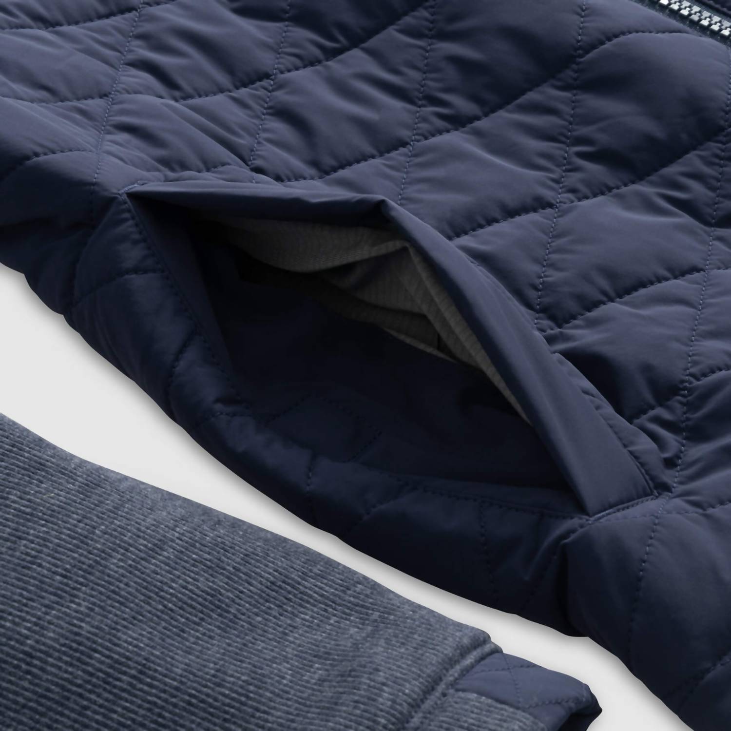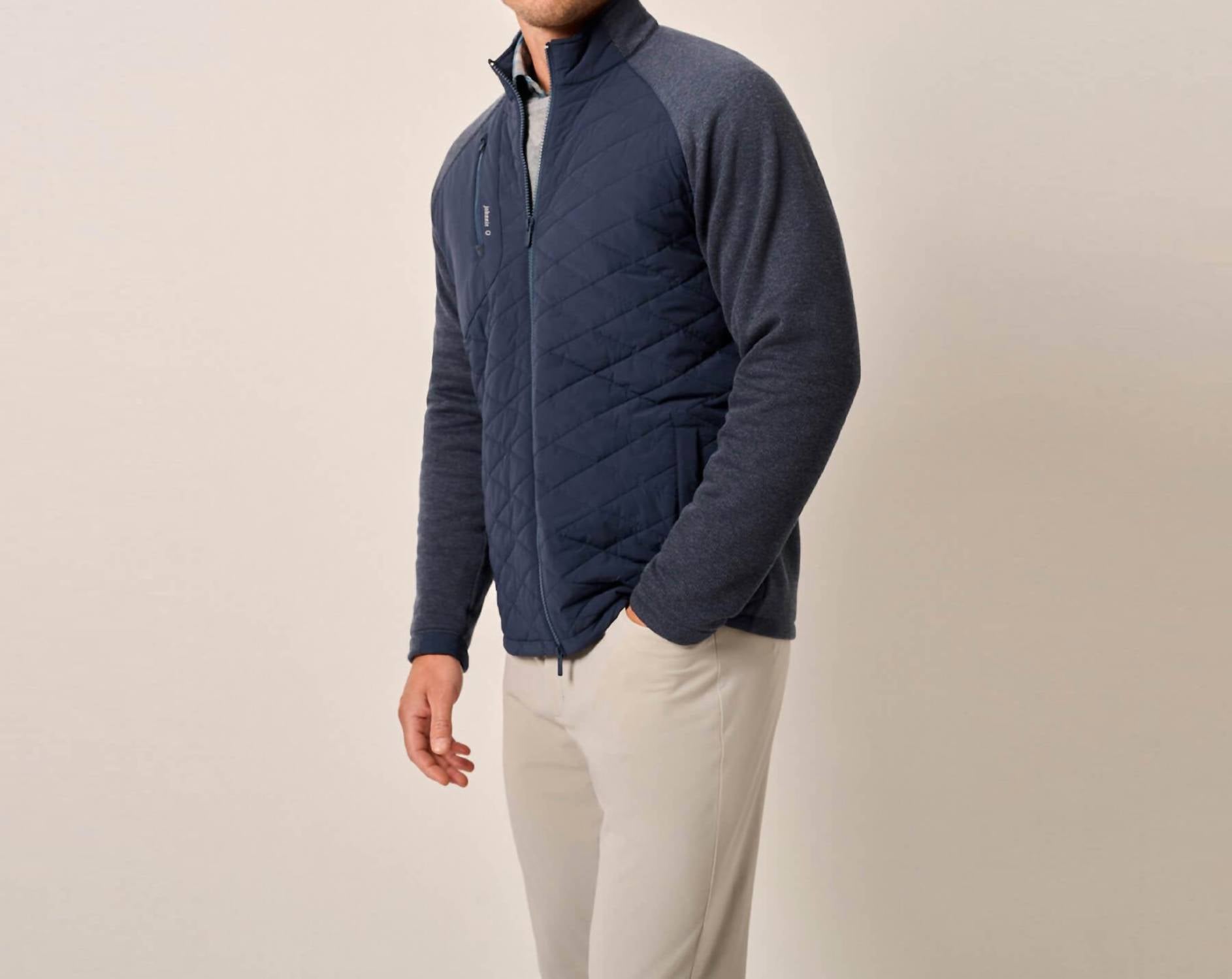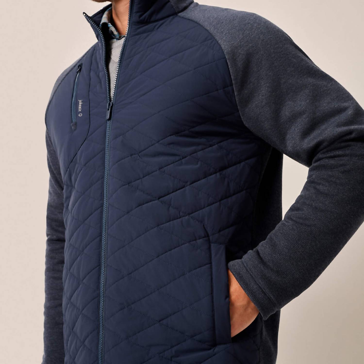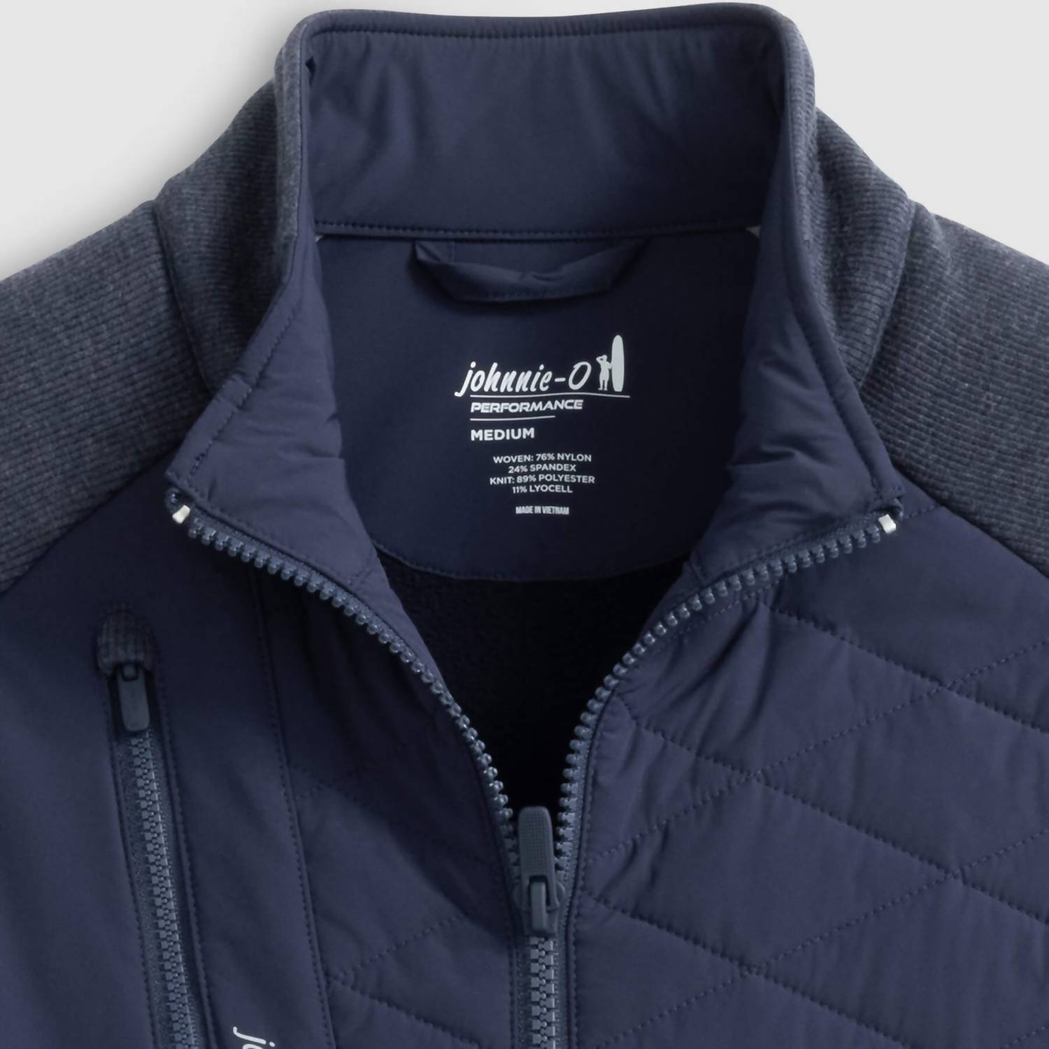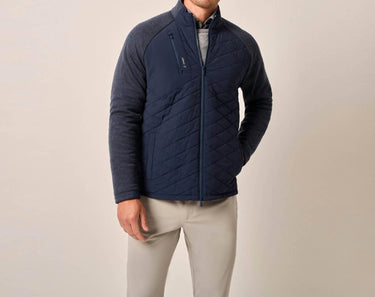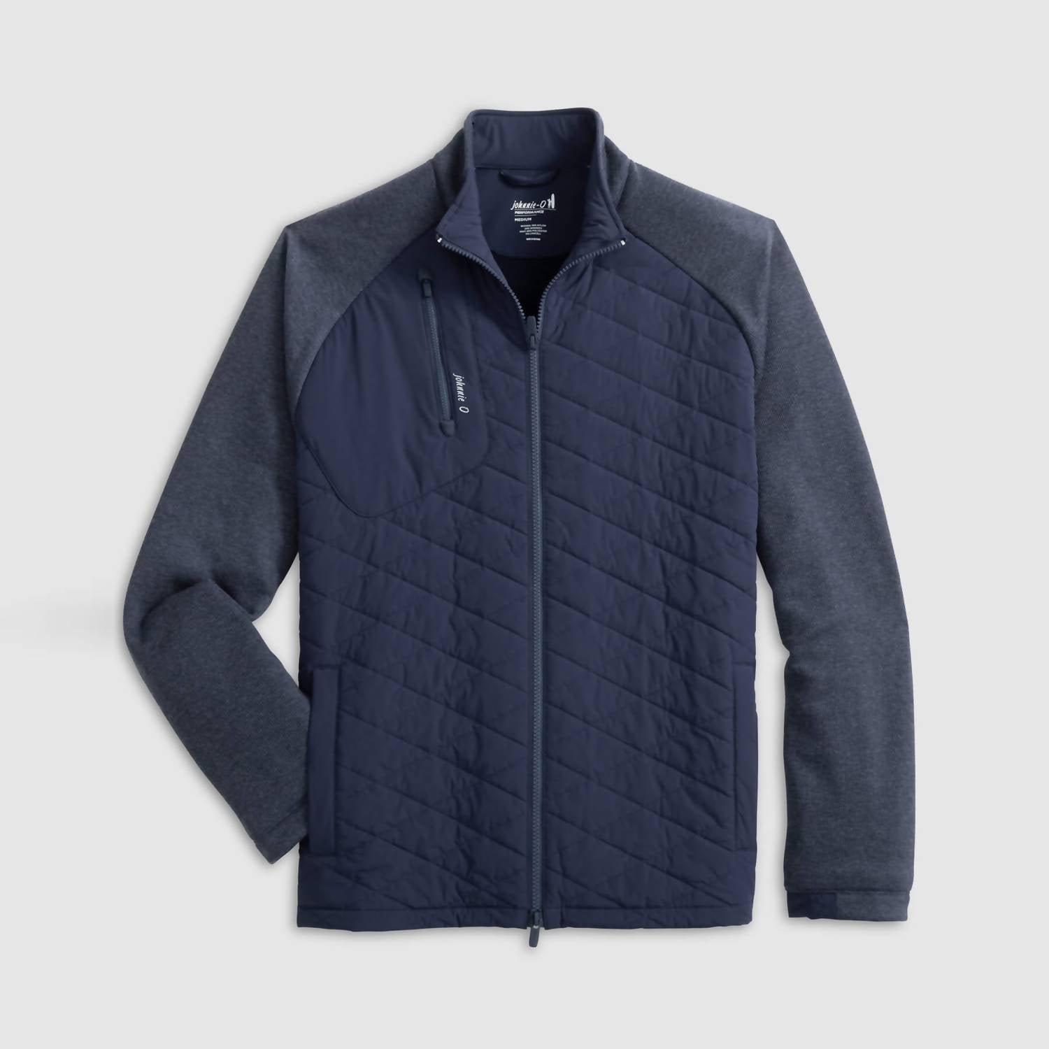 Meet the Weller Lightweight Performance Fleece Jacket by JOHNNIE-O, your go-to for style and functionality in navy. Featuring long sleeves made from a performance fleece blend, this jacket combines a quilted woven nylon and spandex body for amazing mobility. This textured piece offers a zip closure with a practical zip chest pocket and welt pockets with magnetic closures. Composition includes a mix of woven: 76% Nylon, 24% Spandex, and knit: 89% Polyester, 11% Lyocell. Origin: Imported. Care: Hand wash and lay flat to dry for best results.