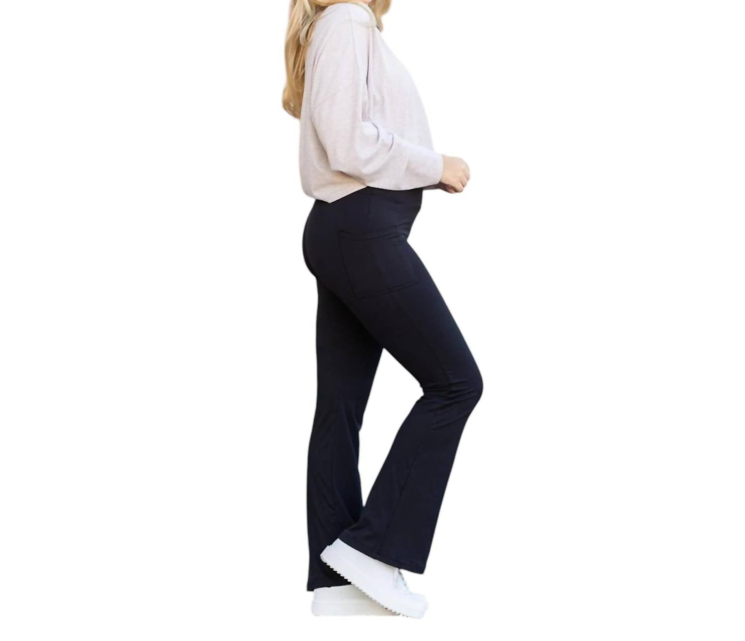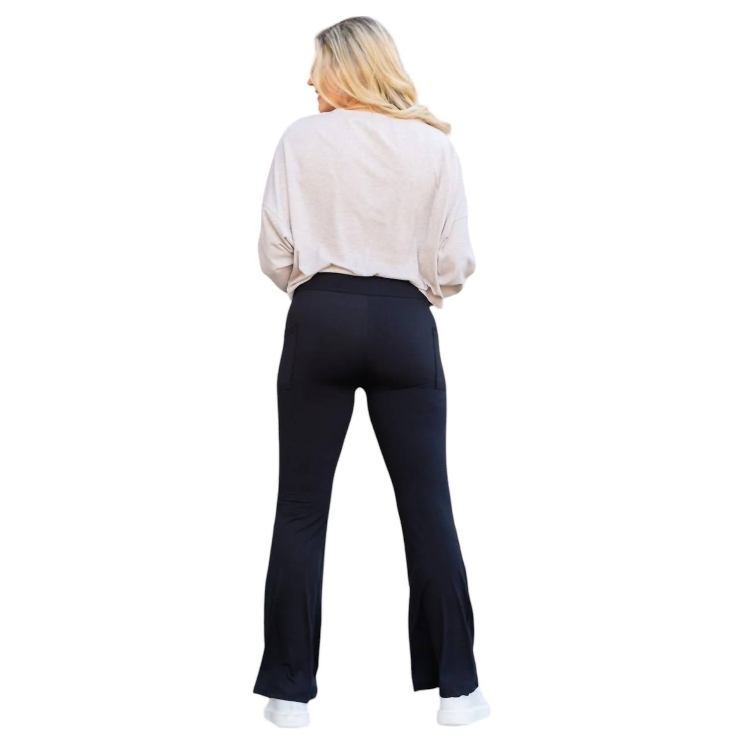 These Vanessa Bootcut Leggings offer a high-rise fit, bootcut style, and convenient pockets. Crafted from a soft 92% polyester, 8% spandex blend with a pull-on closure, they feature a 30” inseam for S/M size.