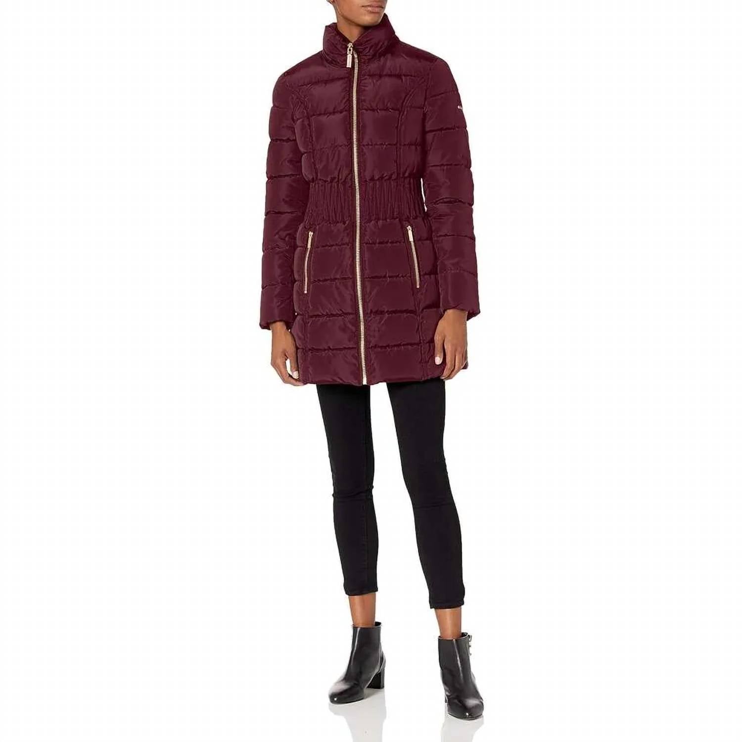 Cozy, cute and timeless. The puffer jacket that will keep you warm all season long.With a zig zag cinched waist, 3/4 length, completely detachable hood with faux fur trim. Zipper closure. 100% Polyester. Imported. Machine Wash.