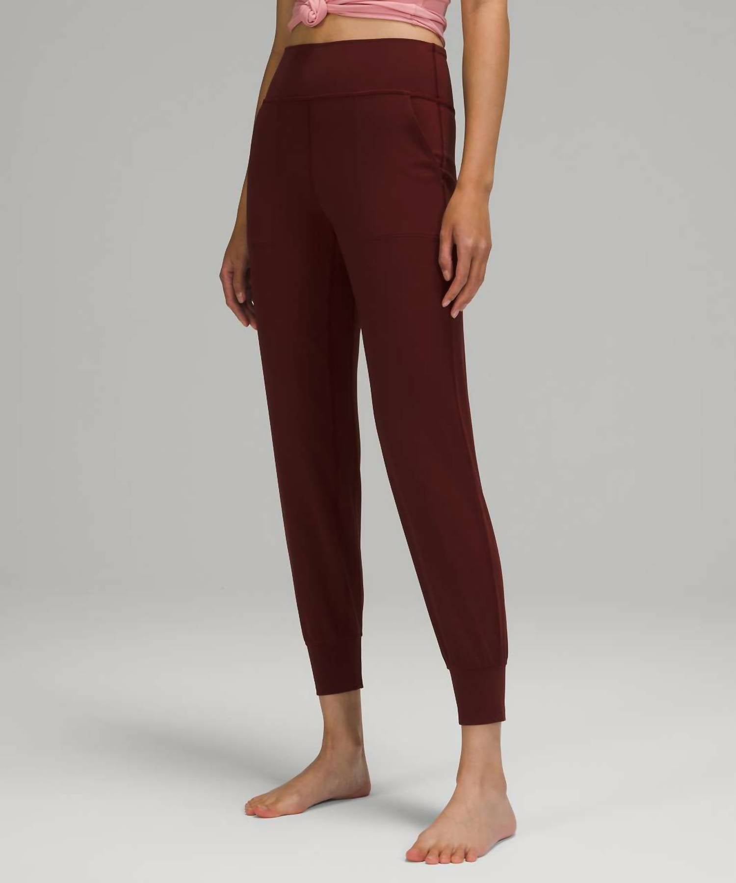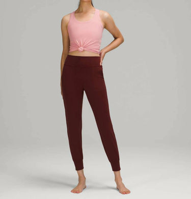 Discover the Women's Align High Rise Jogger by lululemon, expertly crafted for fitness enthusiasts and athleisure lovers alike. These maroon joggers offer a sleek skinny leg design with a convenient pull-on closure, perfect for summer workouts. Proudly sporting a solid pattern and designed without pockets to maintain a streamlined look, these track pants are an essential addition to any athletic wardrobe. While specific care instructions are not provided, their high-quality construction suggests a durable and stylish addition to your activewear collection.