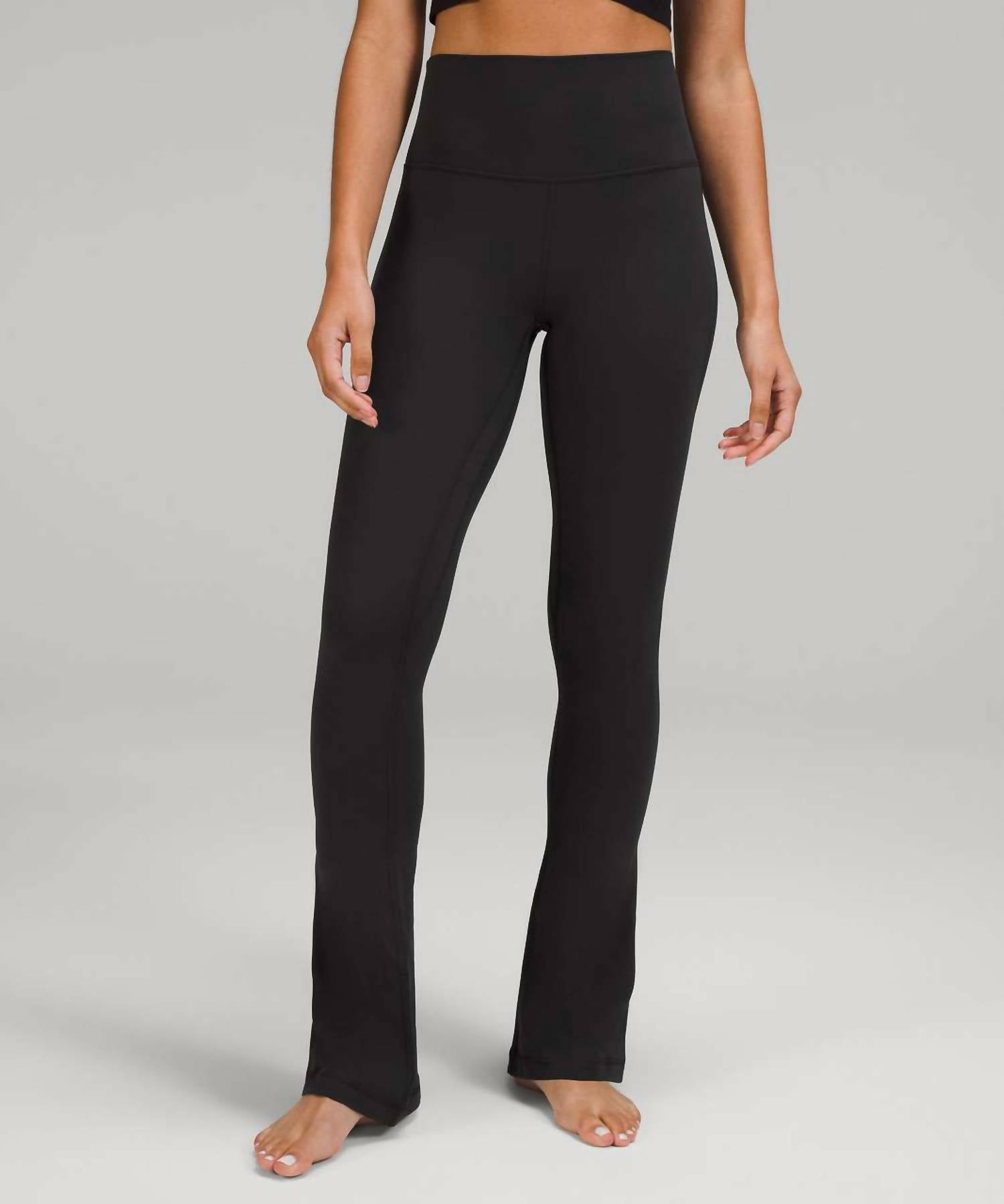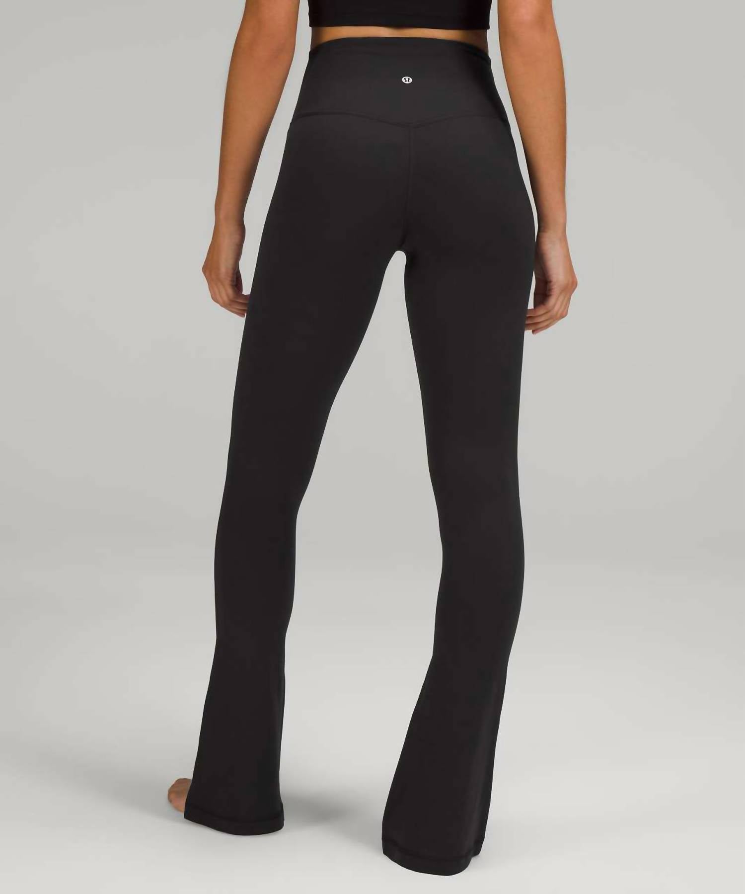 Introducing the Women's Align Mini Flare Pant by lululemon, the ideal choice for your fitness and workout needs. Featuring a solid monochrome black design, these pants offer a flattering flared leg style for a chic, modern look. Designed without pockets, they provide a sleek silhouette, and the pull-on closure ensures ultimate comfort. Perfect for summer, these versatile flare pants make a stylish and functional addition to your athletic wardrobe.