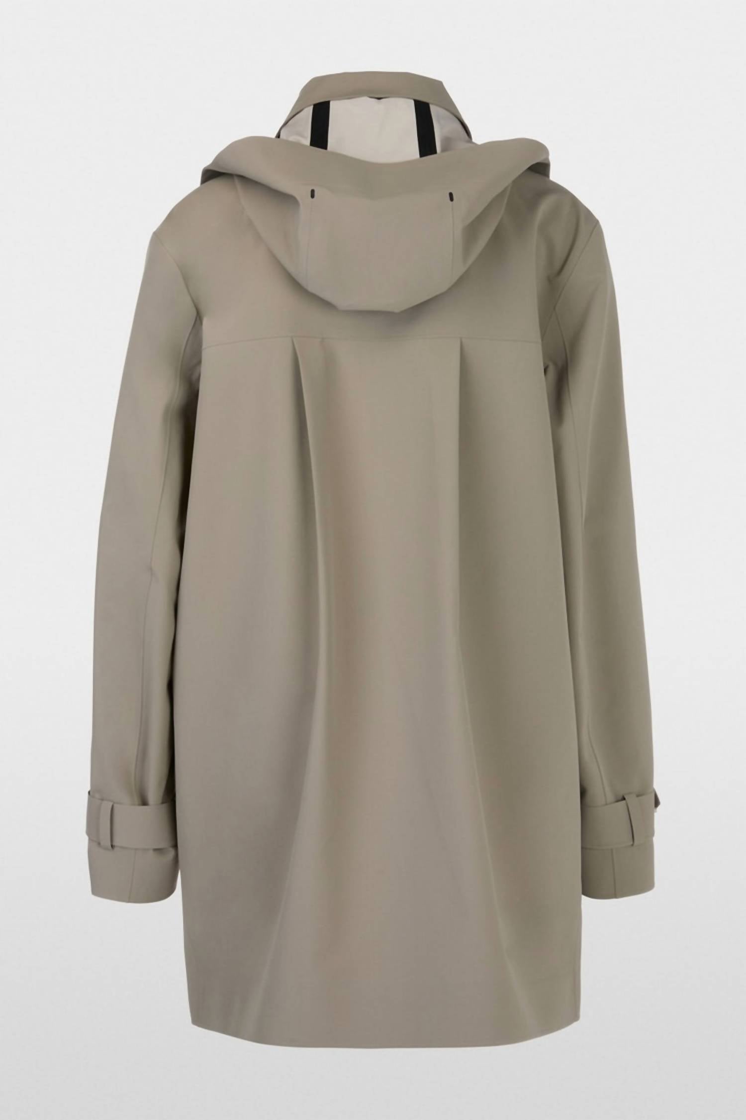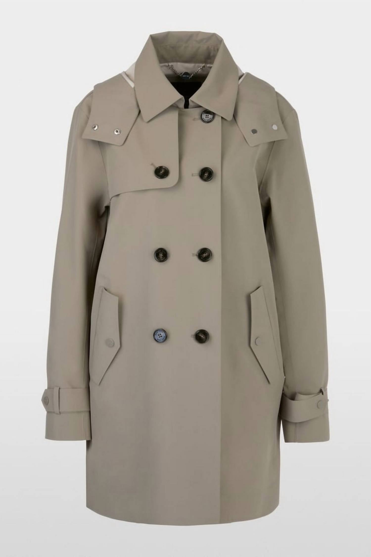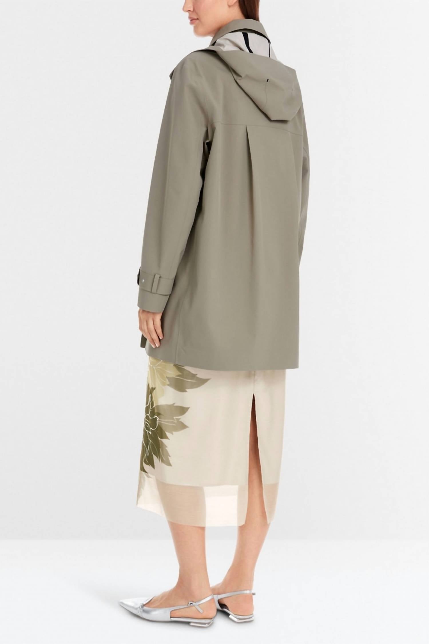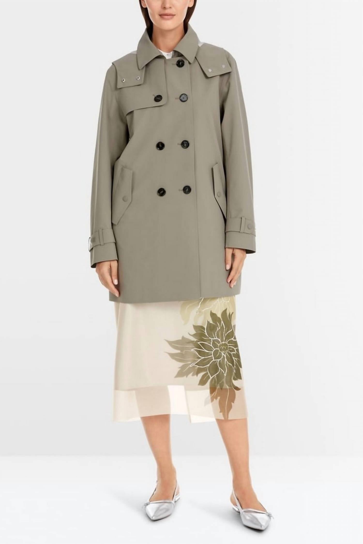 Enhance your adventures with the Marc Cain Outdoor Jacket in Sage Powder, a chic twist on the classic trench with a sporty edge. This knee-length jacket with long sleeves features a wide cut, perfect for layering, and it's adorned with a double-breasted button closure and a detachable hood for versatility. Its composition includes 86% polyamide, 14% elastane, with an inner lining of 100% polyester, enhanced by a breathable 100% Thermoplastic polyurethane membrane. Care for it effortlessly while enjoying the stylish collar and practical pockets.